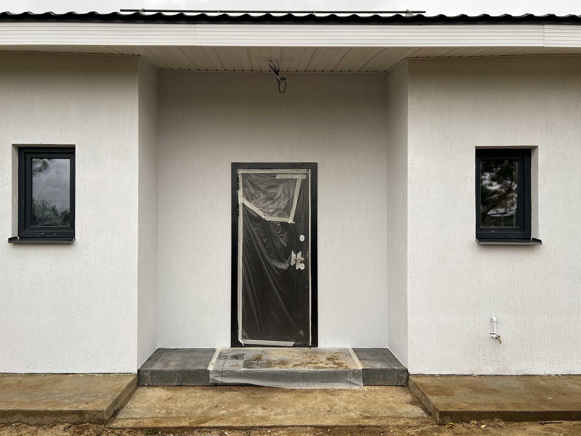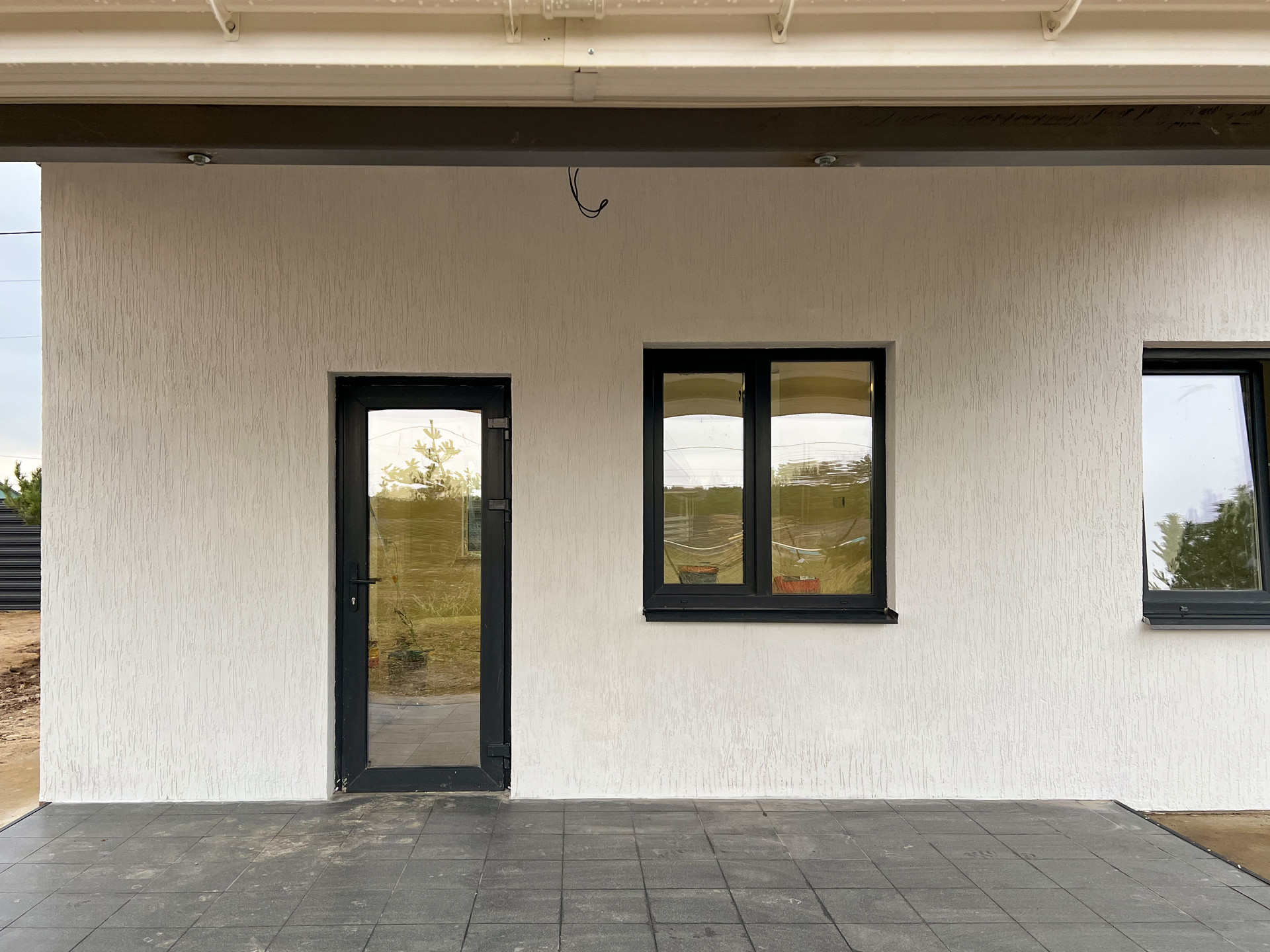 - Стены - внутри: штукатурка + шпатлевка + краска (керамогранит в санузле), снаружи: штукатурка по сетке + декоративное покрытие «Короед» + краска.