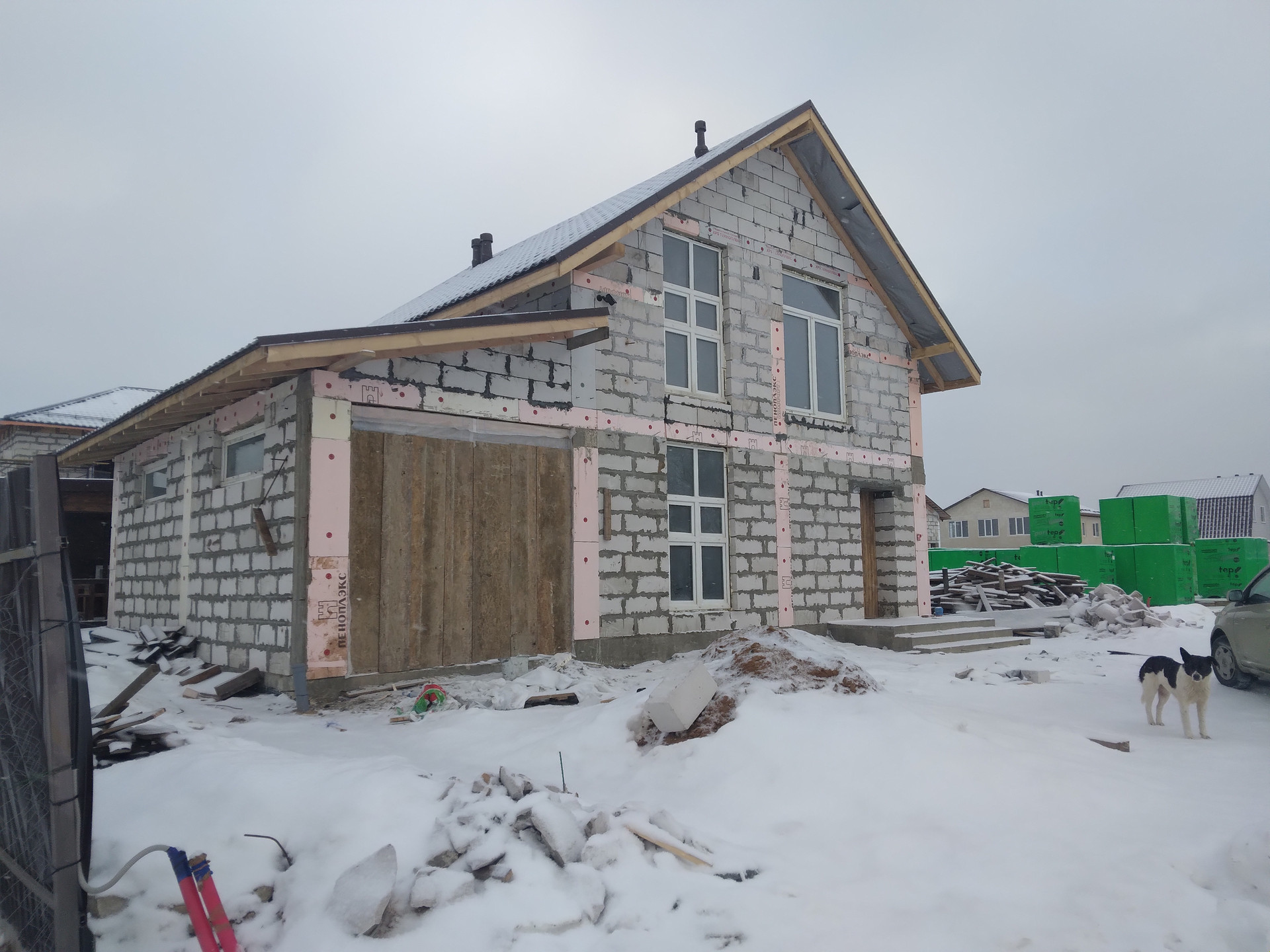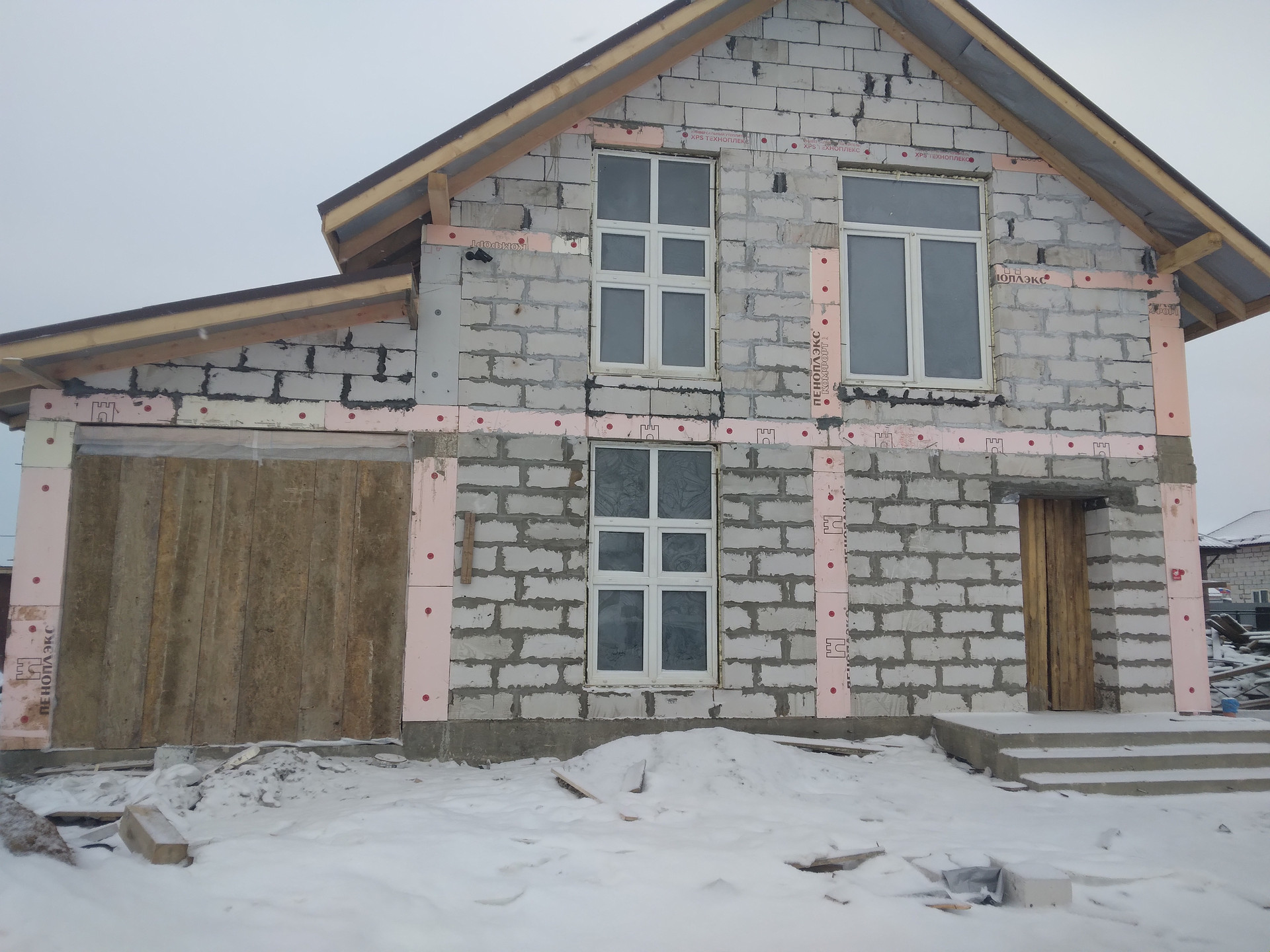 На участке двухэтажный дом, первый этаж 11х8, второй этаж 8 х8, под домом залита армированная плита (не лента) глубиной до 40 см. Сверху, по всему периметру , по углам и середине, залиты колонны и армированный пояс, крыша утеплена, высокие, в пол (240 х170) окна, дом из блоков сороковка, поэтому не требует дополнительных вложений на утепление, в доме сделана разводка под все коммуникации, высота потолков 2.70 метра.
