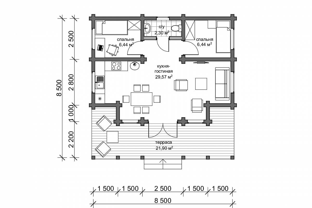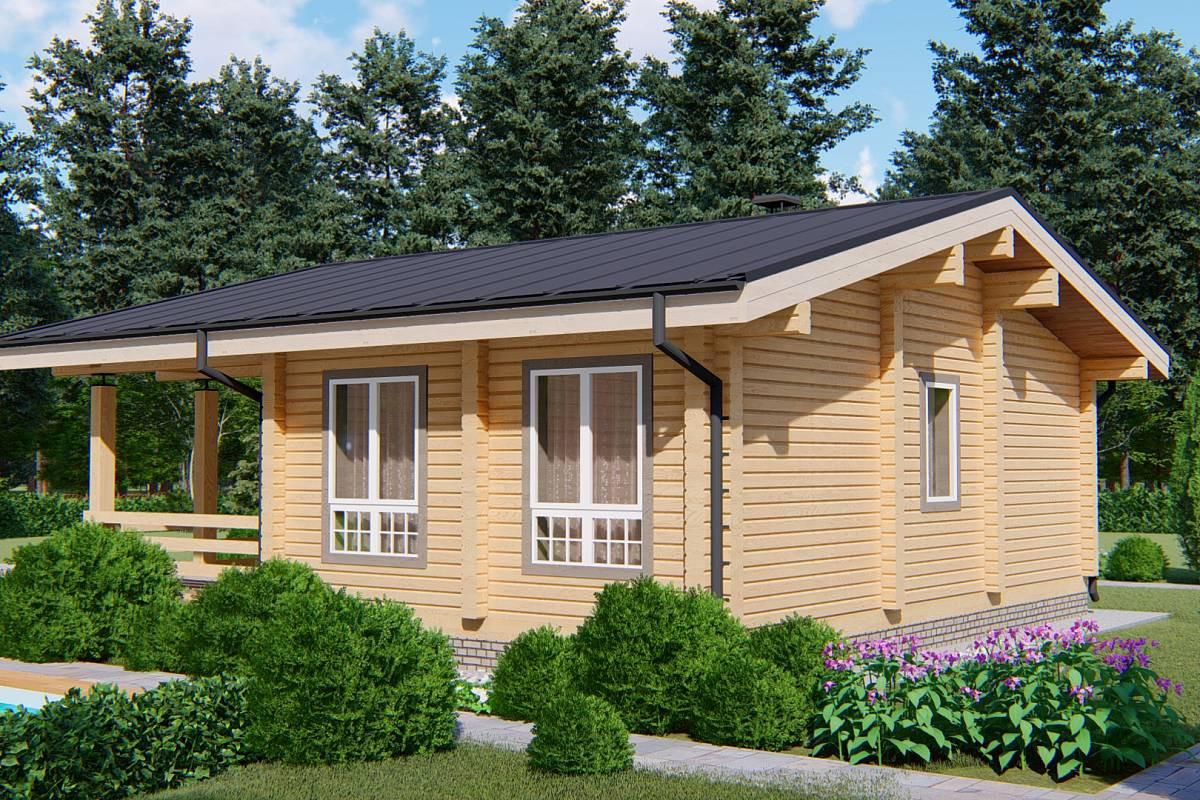 Планировочное решение лаконичное. Вход в дом организован с террасы, на которой можно разместить летнюю кухню, стол для обедов на свежем воздухе и другую садовую мебель. Внутреннее пространство представляет собой объединенную кухню-гостиную. Симметрично расположены двери в спальни и санузел. Общая площадь данного проекта - 66 м.кв., здесь будет комфортно проводить выходные с семье и друзьями в любое время года.