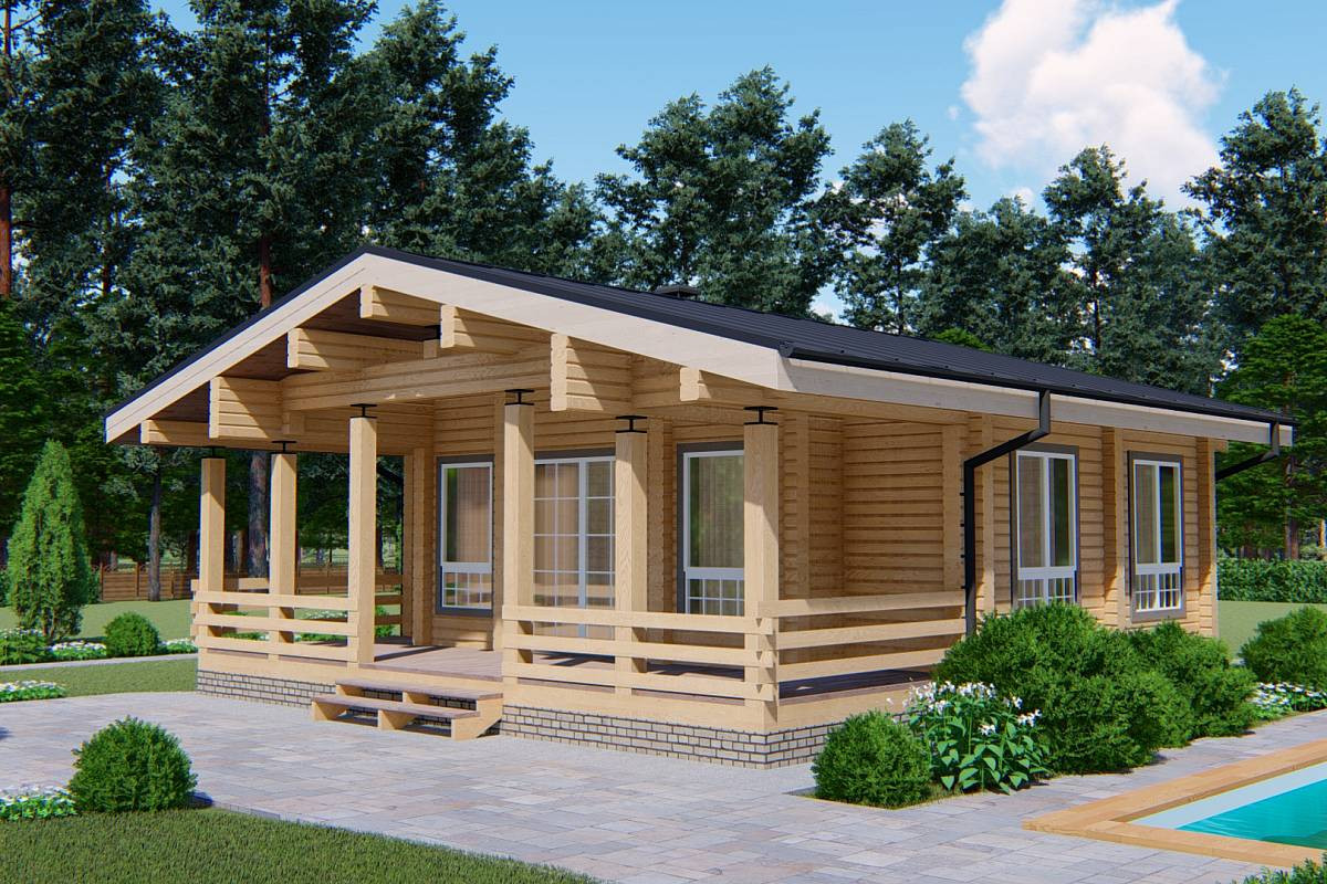 Проект одноэтажного дома с двускатной кровлей подойдет для строительства на дачном участке, в качестве дома для гостей или в коммерческих целях. Проект выполнен в стиле шале, с пологими скатами кровли с широкими выносами, консольными балками, просторной террасой и большой площадью остекления.