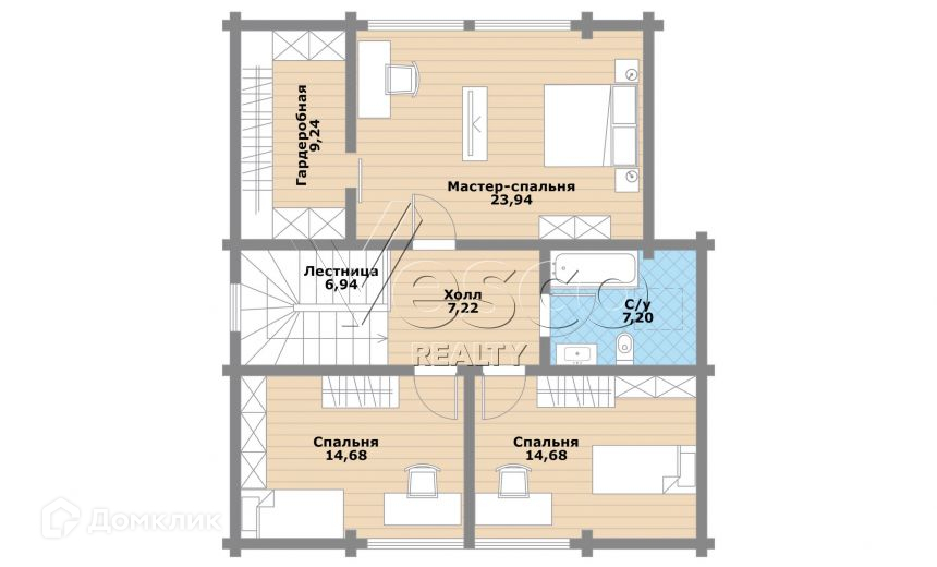 2 этаж: мастер-спальня (24) с гардеробной (9), две симметричные детские (по 15), общая ванная с с/у (7), холл (7).