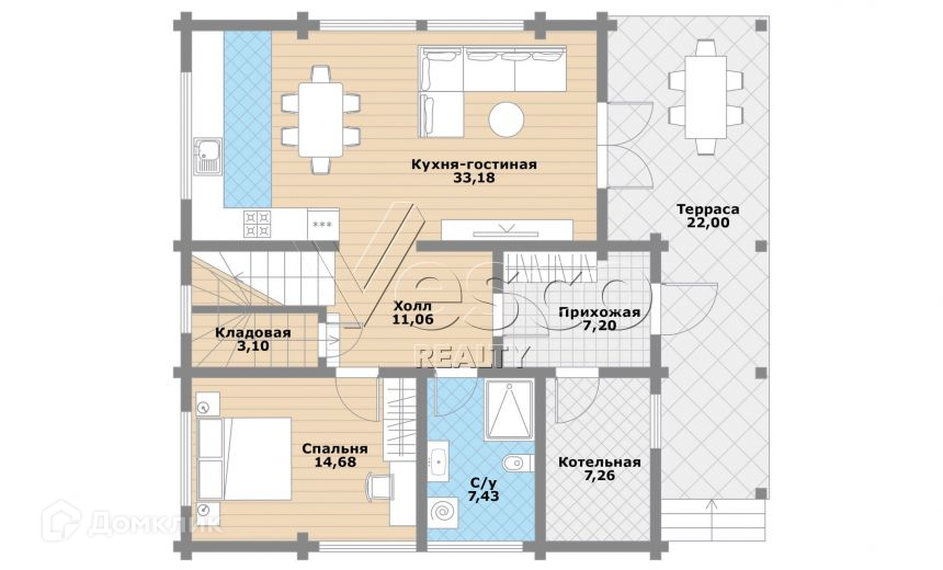 1 этаж: просторная кухня-гостиная (33) с выходом на террасу (22), гостевая спальня (15), гостевой с/у с постирочной (7), прихожая (7), котельная (7), кладовая (3), холл (11).