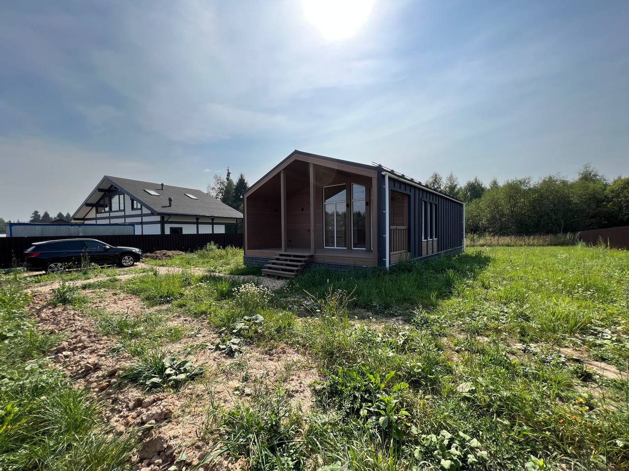 На участке выполнены ландшафтные работы по выравниванию рельефа, сделан заезд для автомобиля и парковка, а также пеший вход на учаток через калитку.