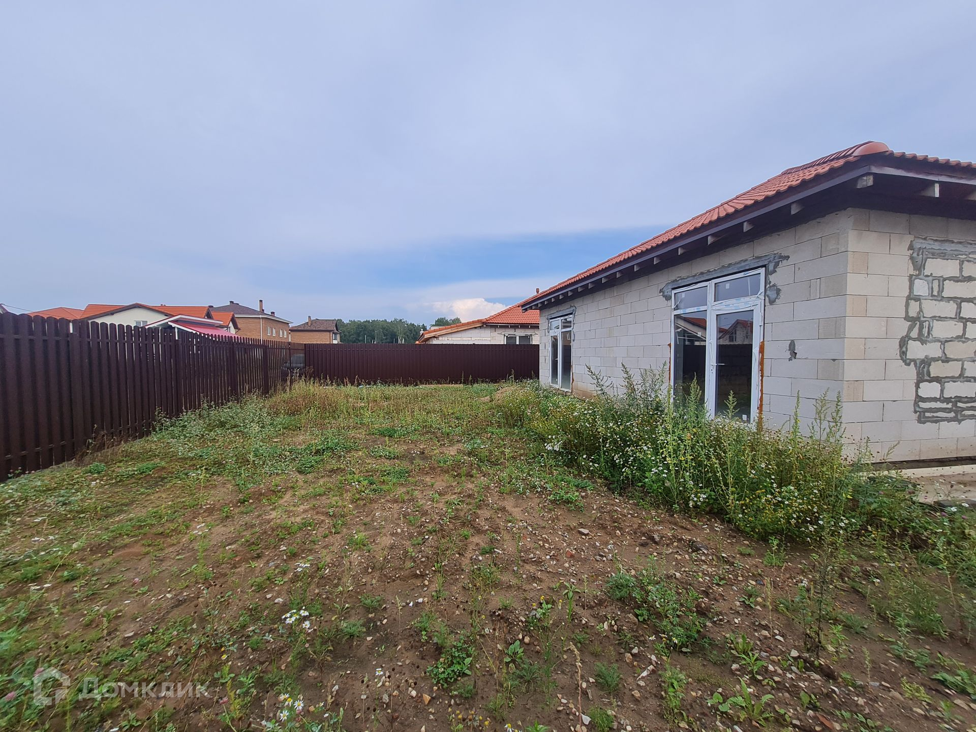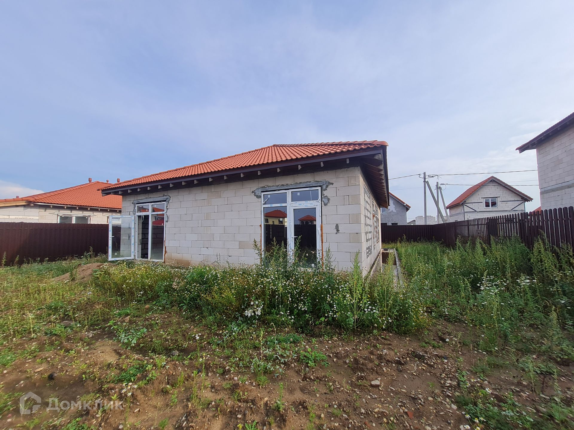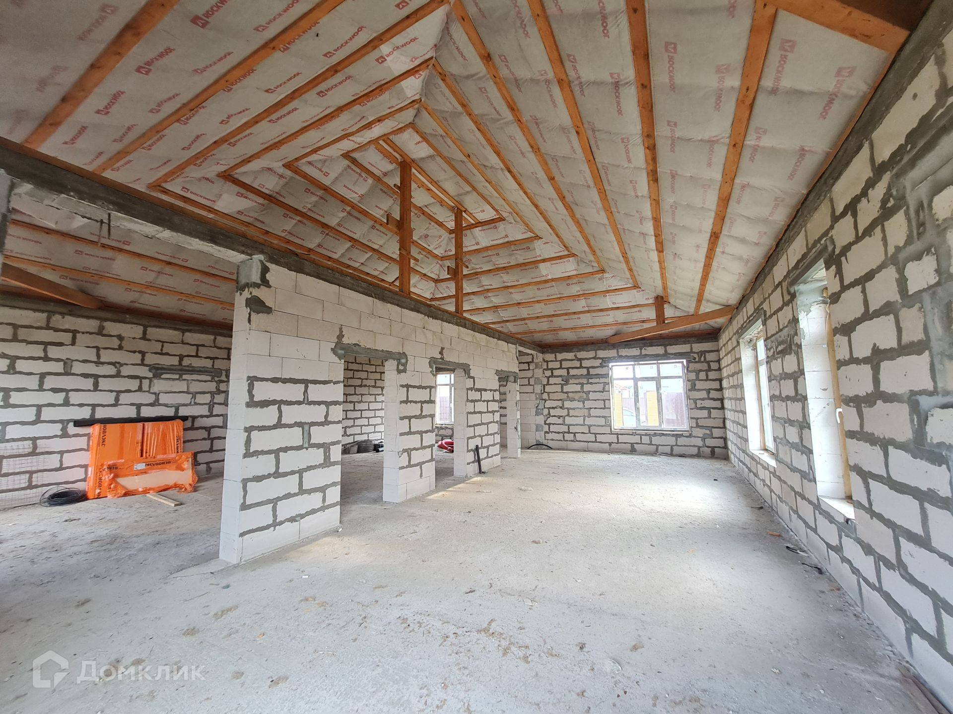 Дом под отделку площадью 119,6 кв.м, выполнен из газоблока, на монолитной плите, фундамент утеплен, установлены стеклопакеты, крыша керамочерепица, кровля утеплена (утеплитель 200), залита отмостка вокруг дома под отделку плиткой. Высота в коньке 5 м.