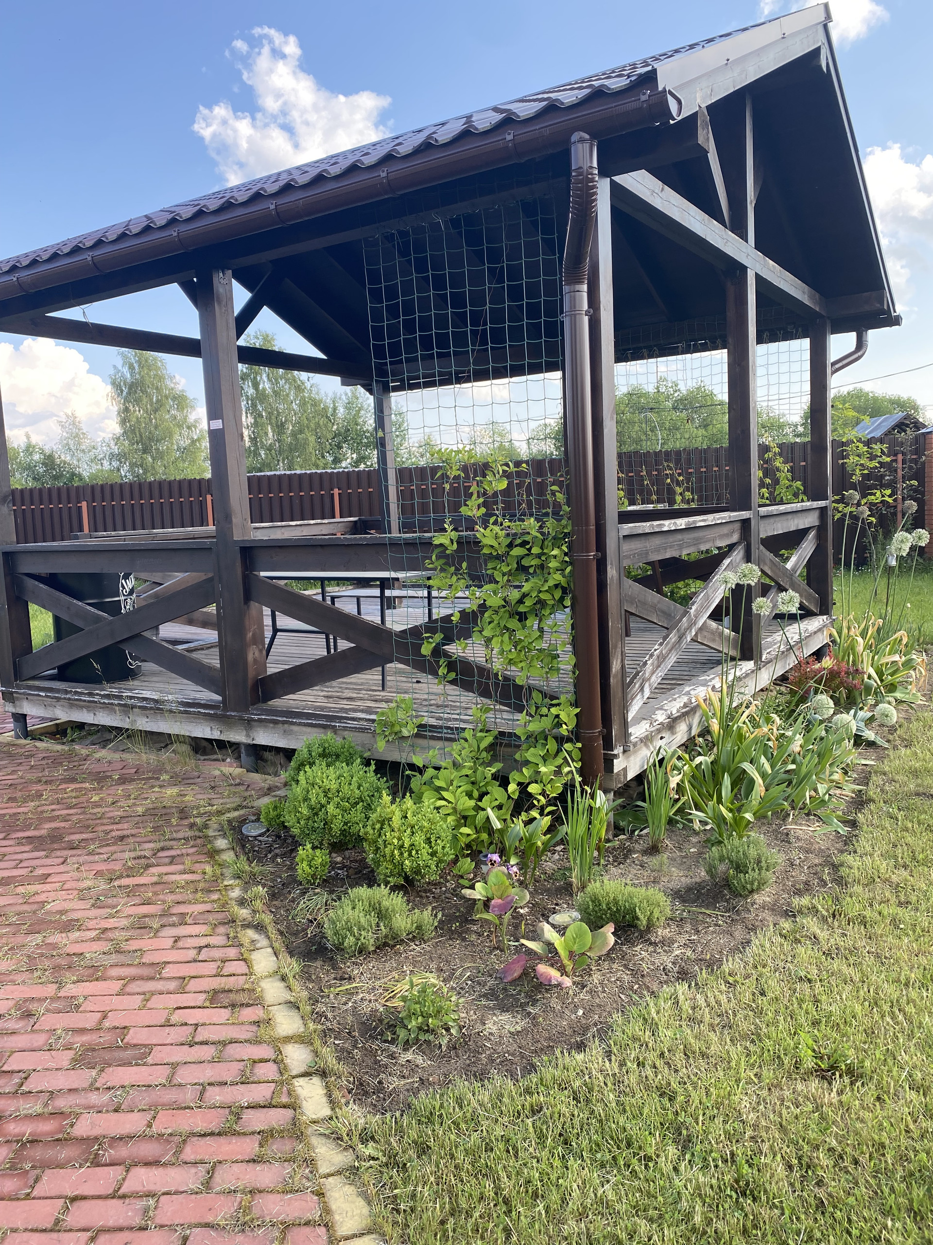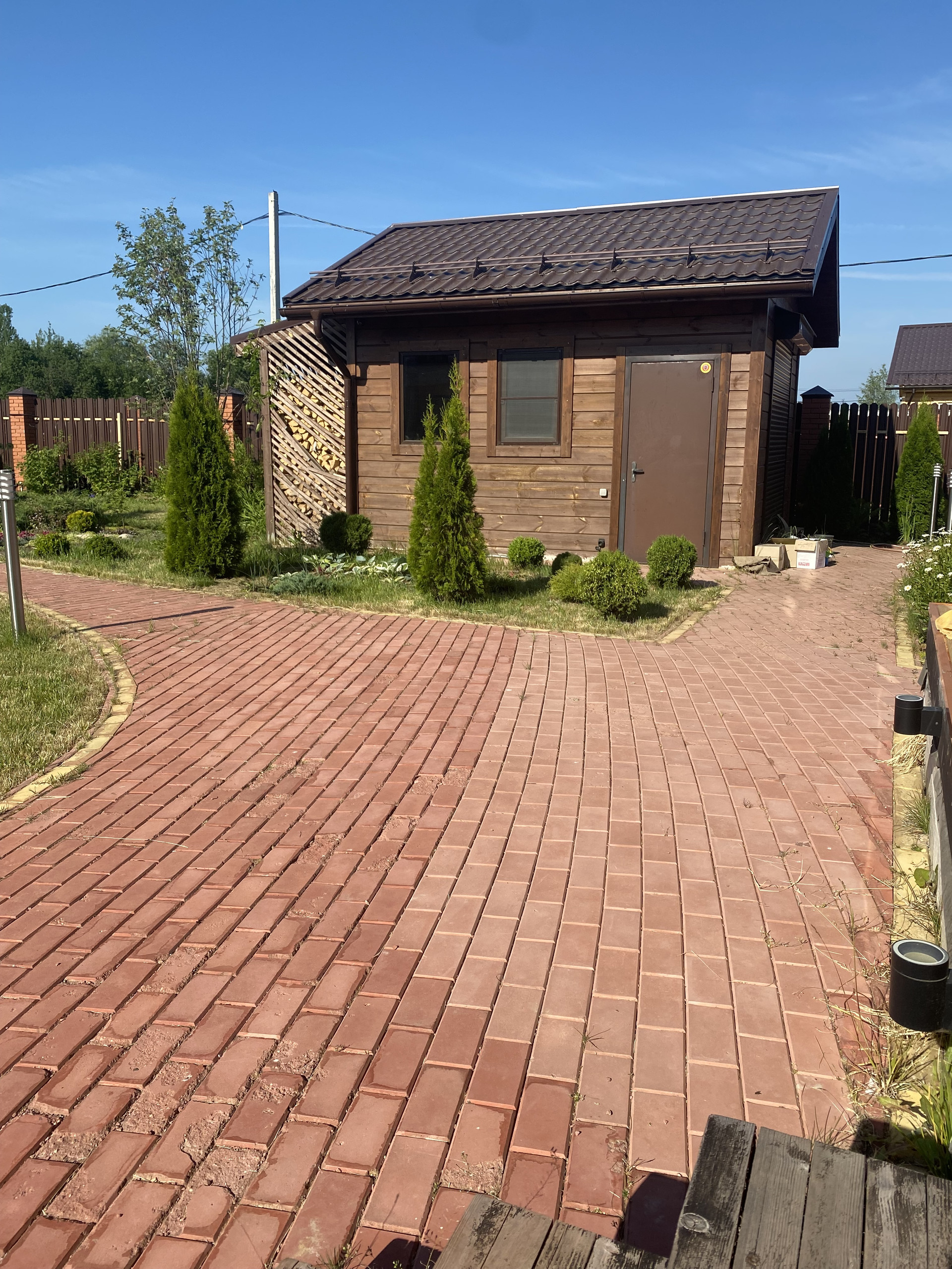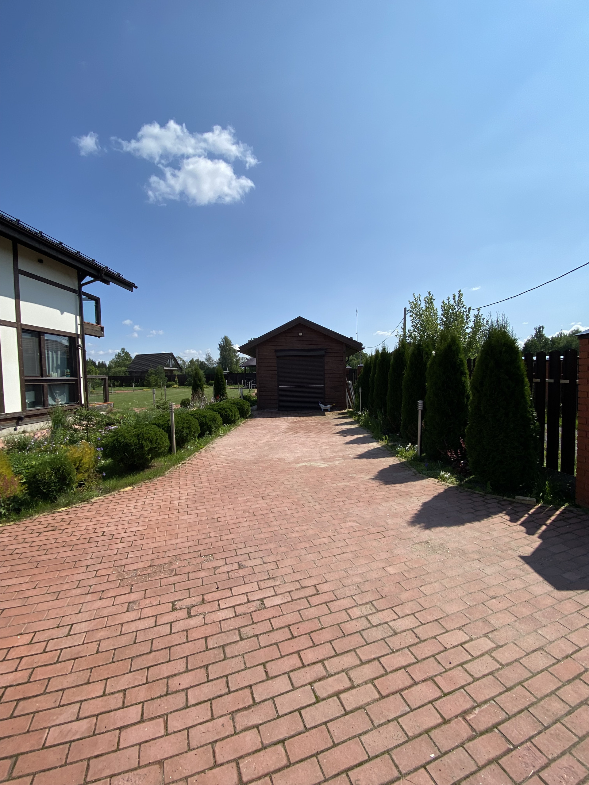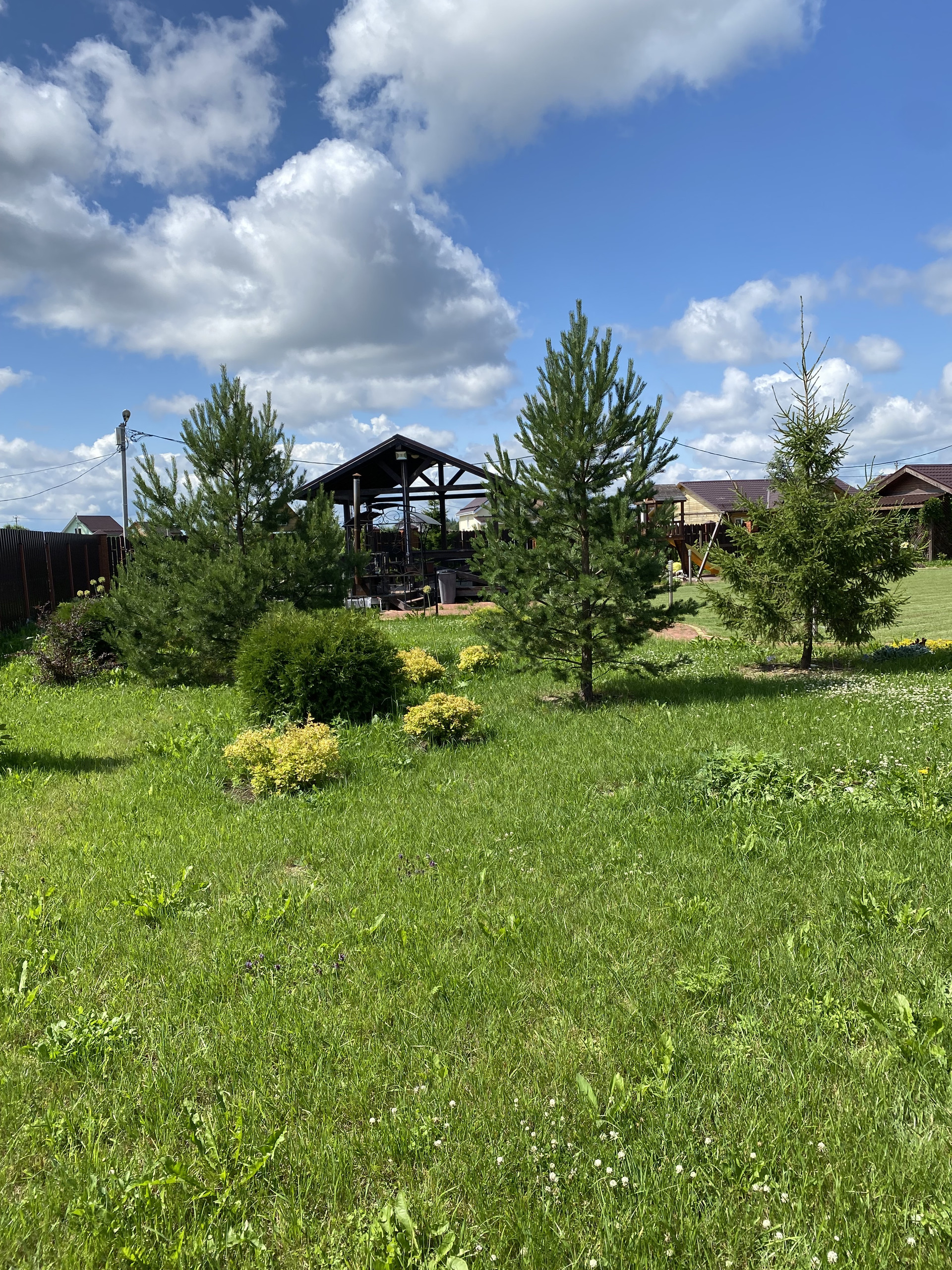 На участке ландшафтный дизайн, много растений (хвойные деревья, фруктовые деревья, цветы и тд)