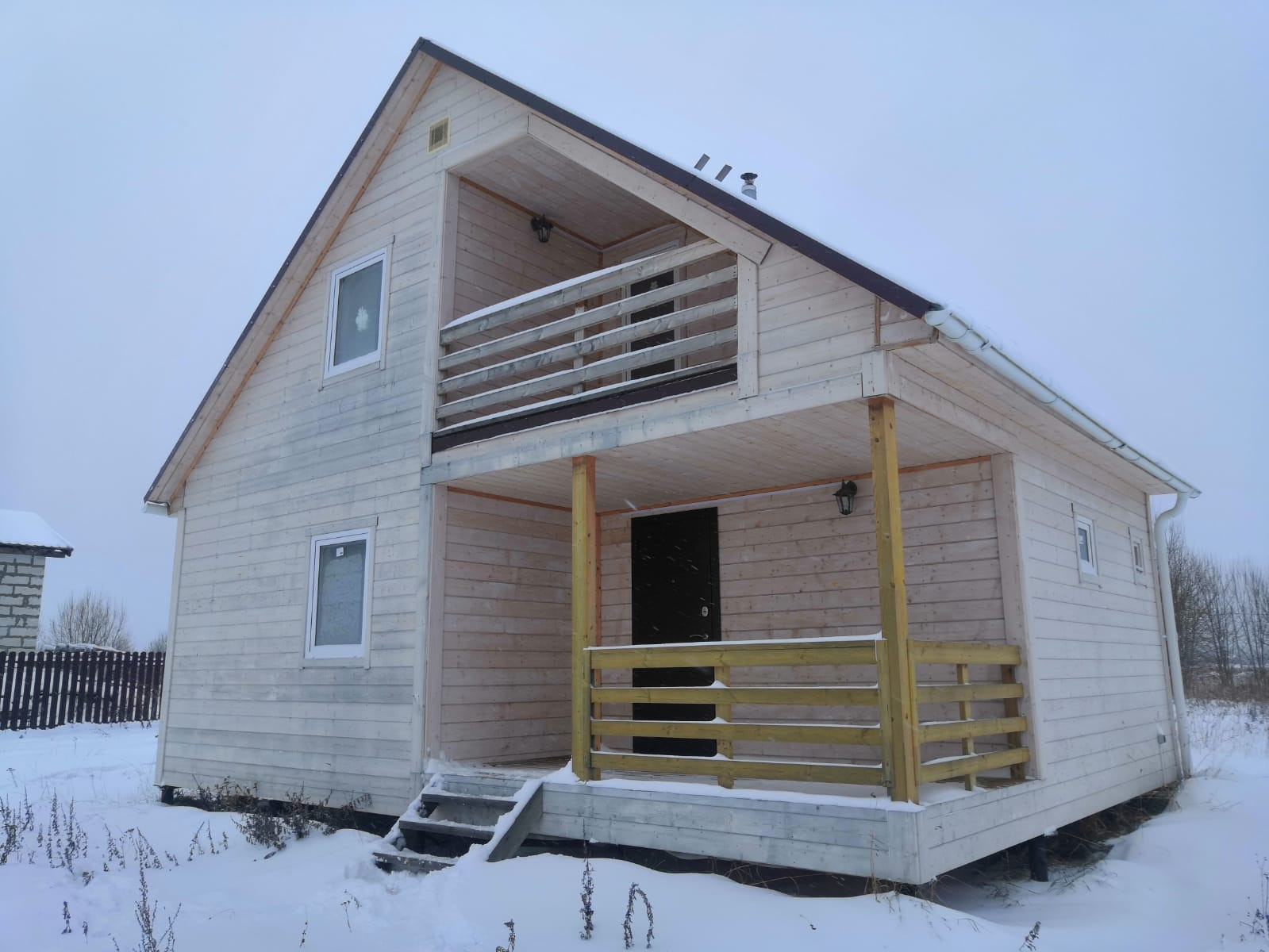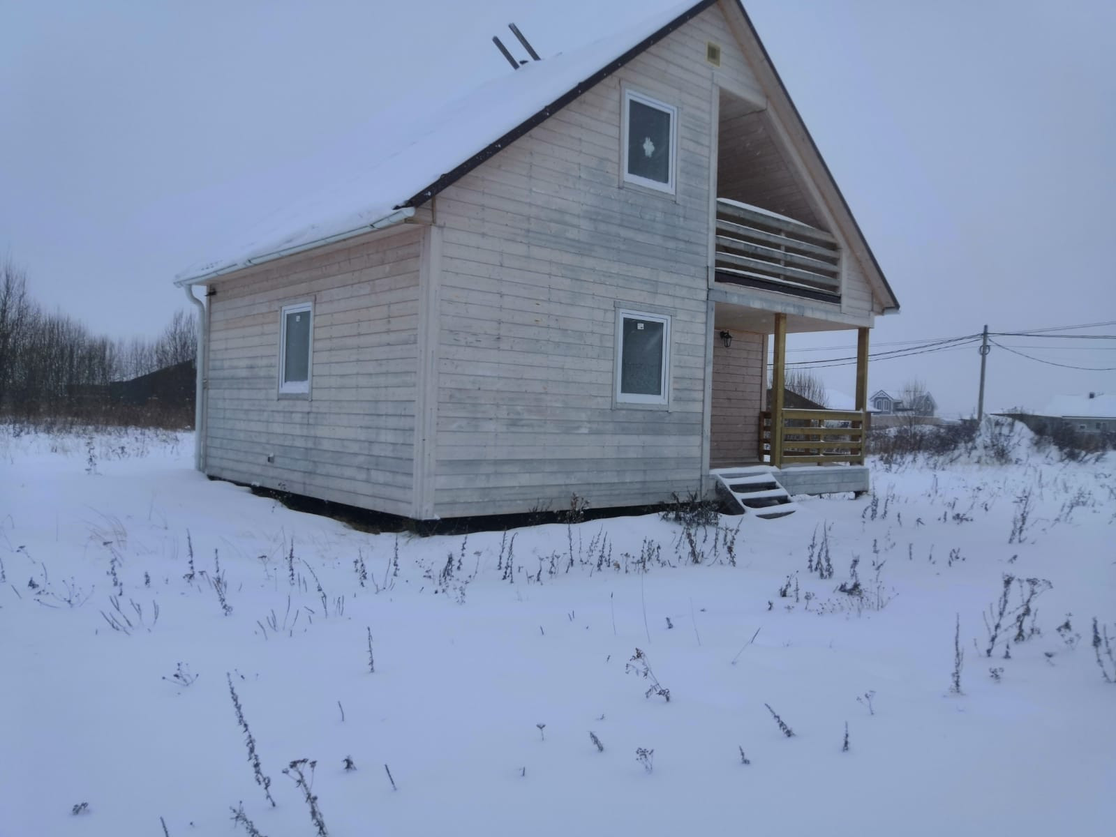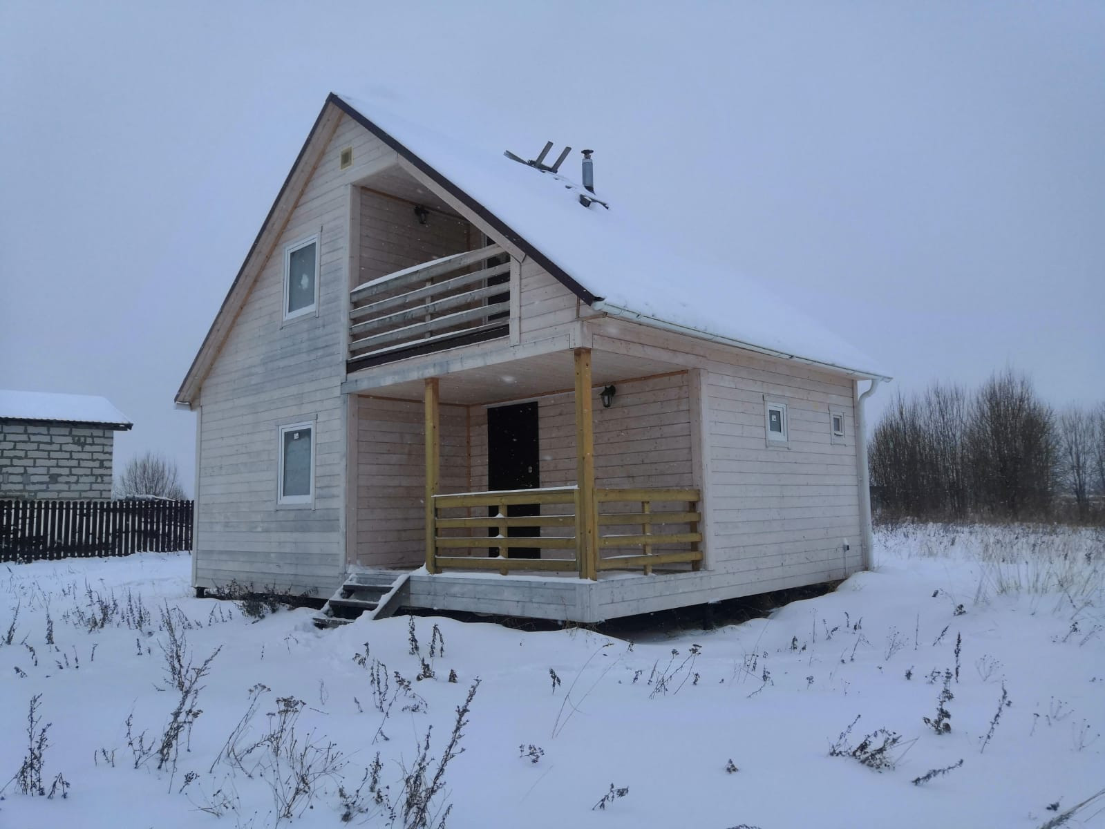 Дом построен 2022 году, новый. Фундамент - сваи, стены каркас с утеплителем (зимний дом), отделан внутри вагонкой, снаружи - имитация броку. Обработан пропиской , можно перекрасить в другой цвет.
