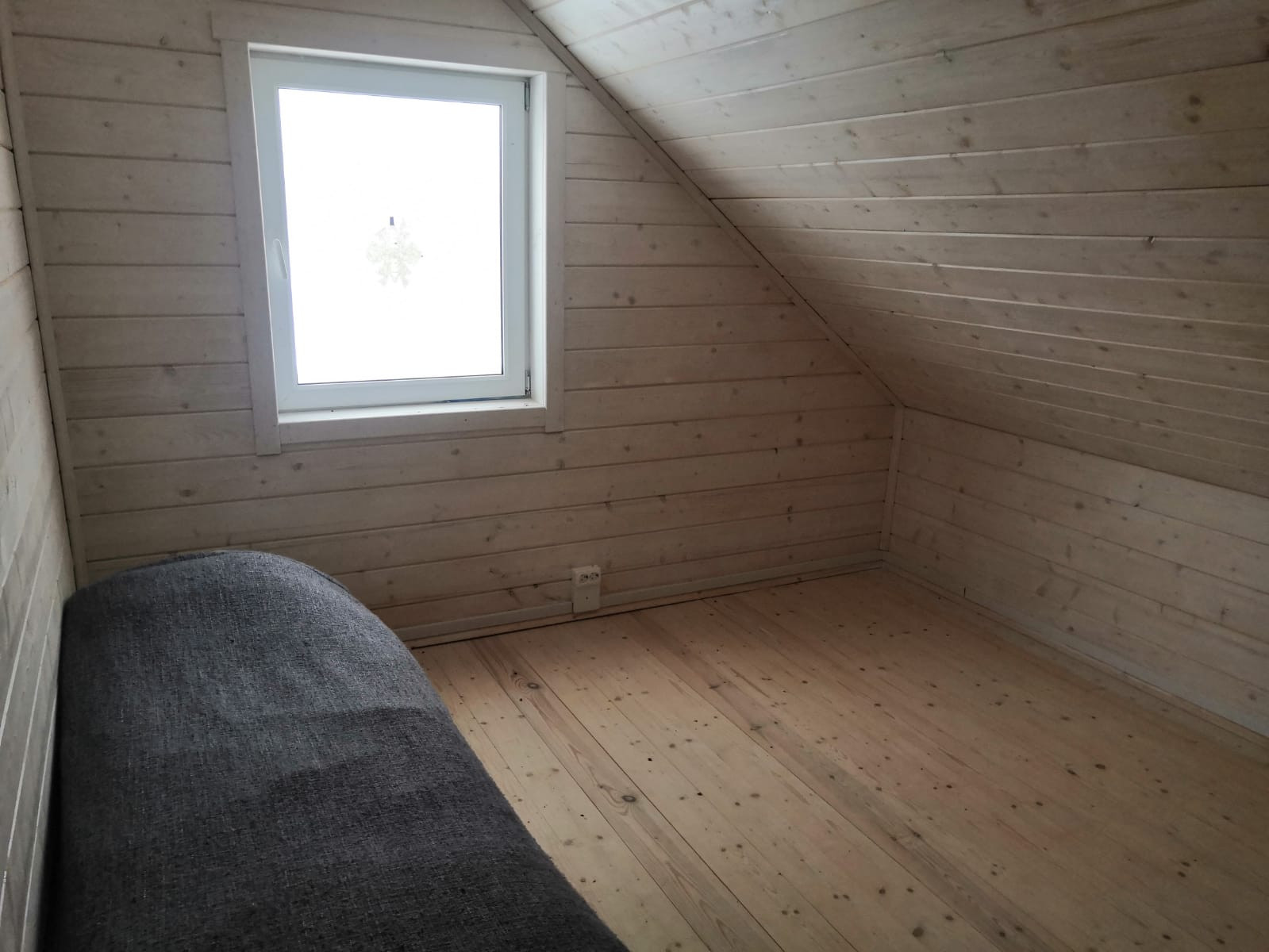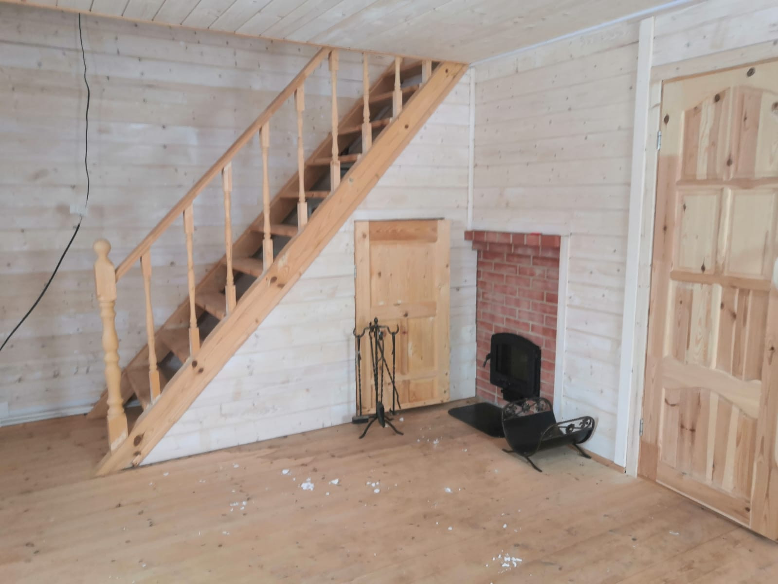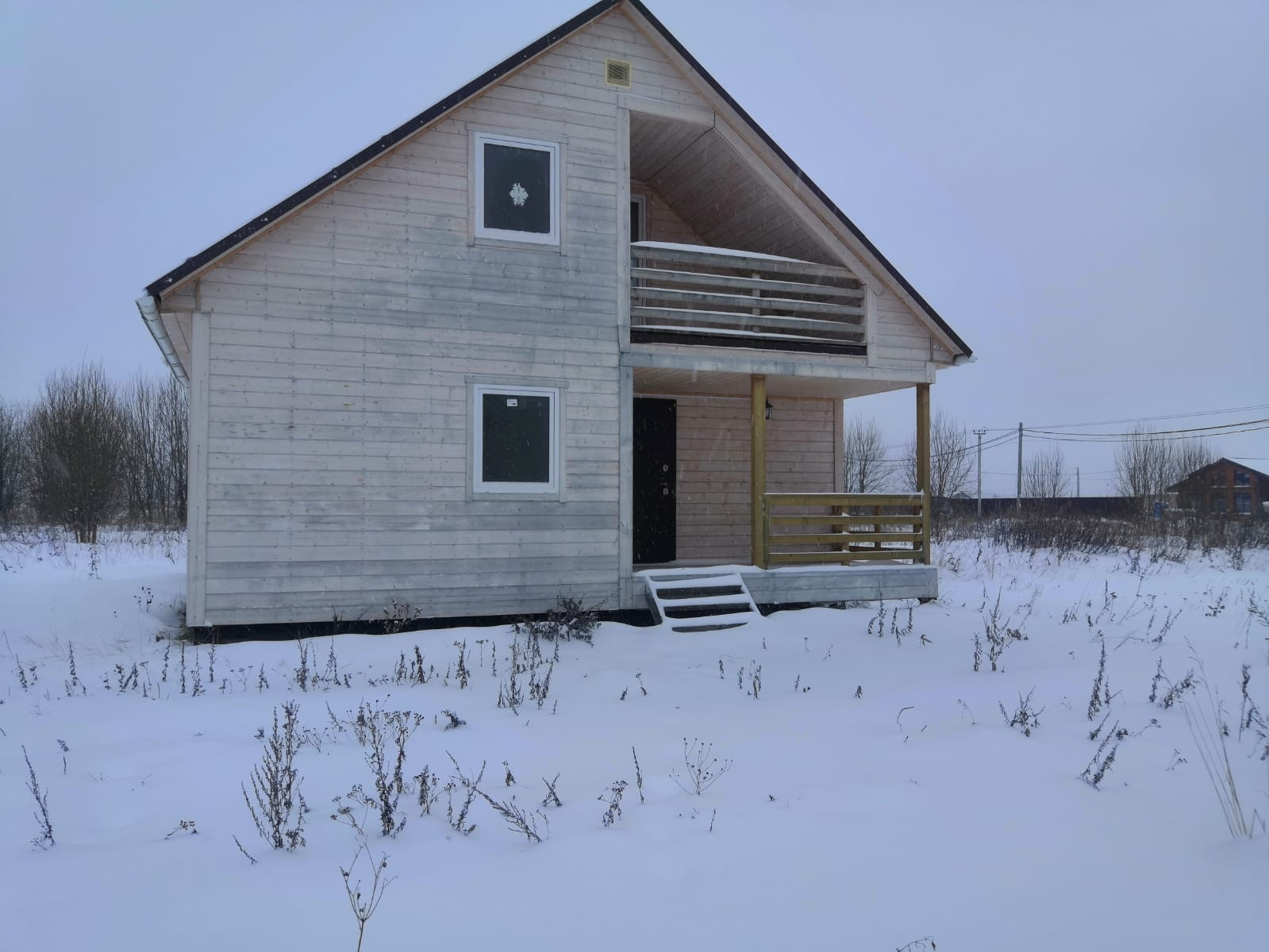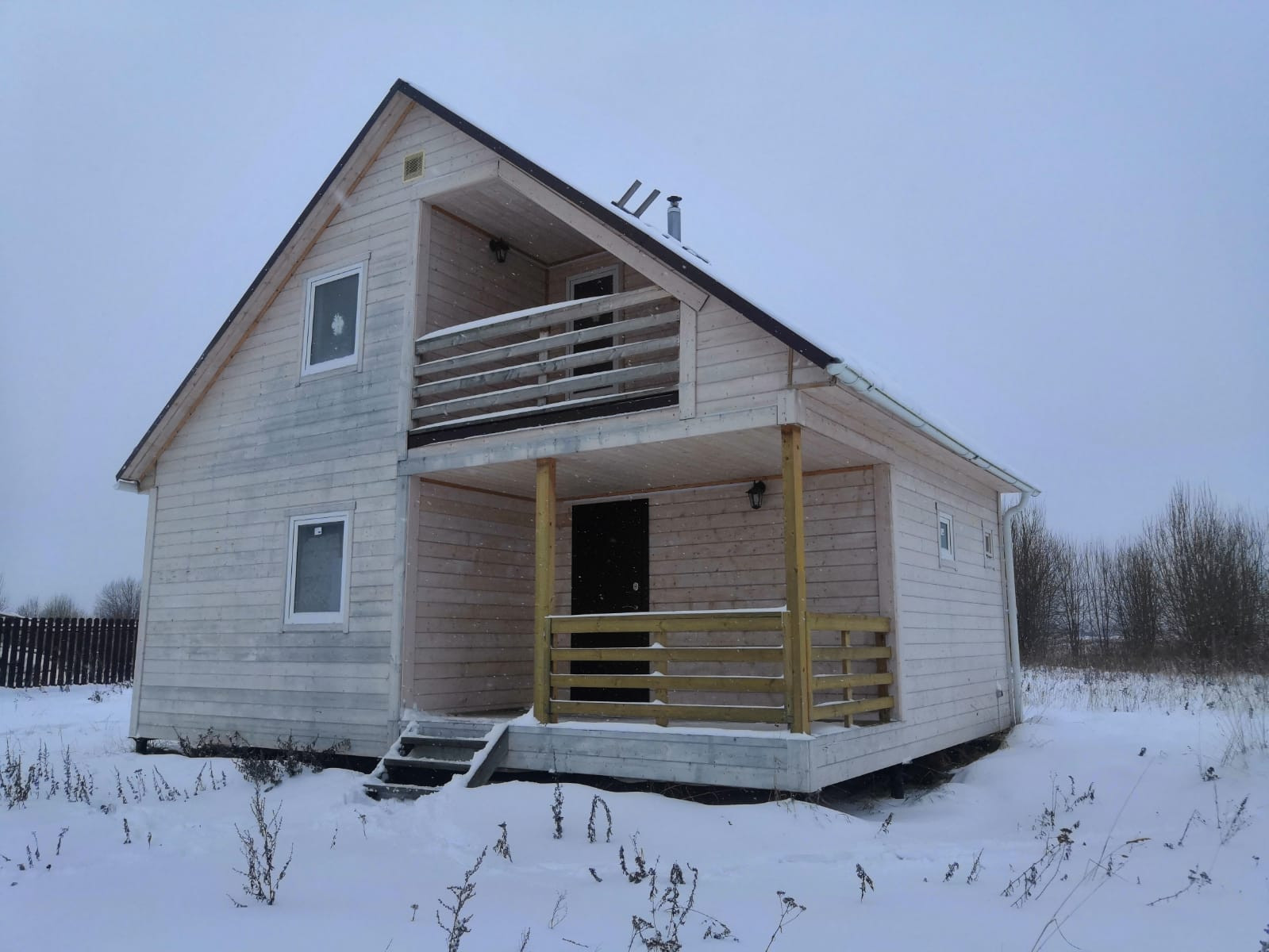 При входе открытая терраса, в доме одна большая комната (20 кв.м.) на 1м этаже и 2 маленькие комнаты (15 и 10 кв.м.) на 2м этаже, с выходом на балкон.