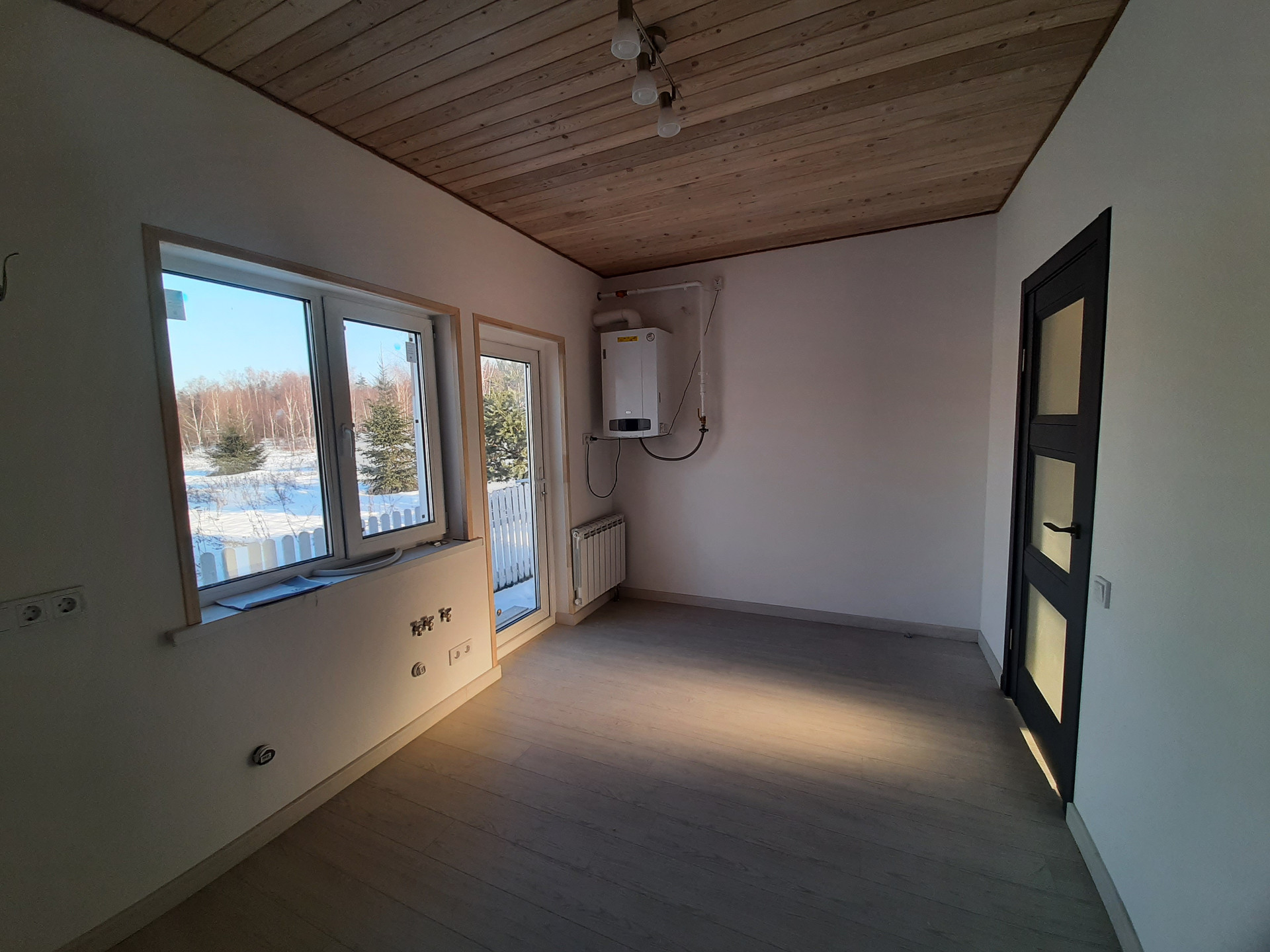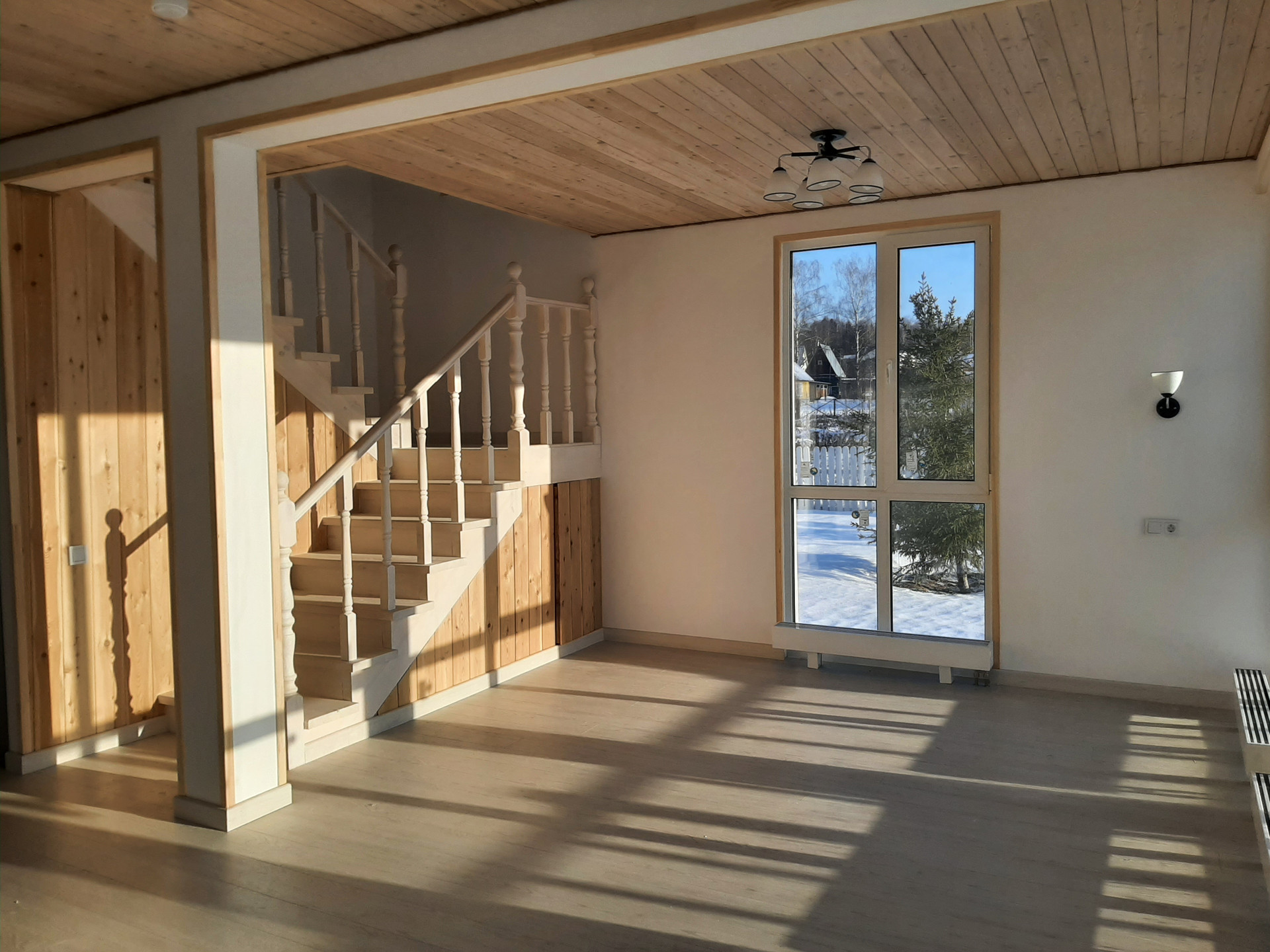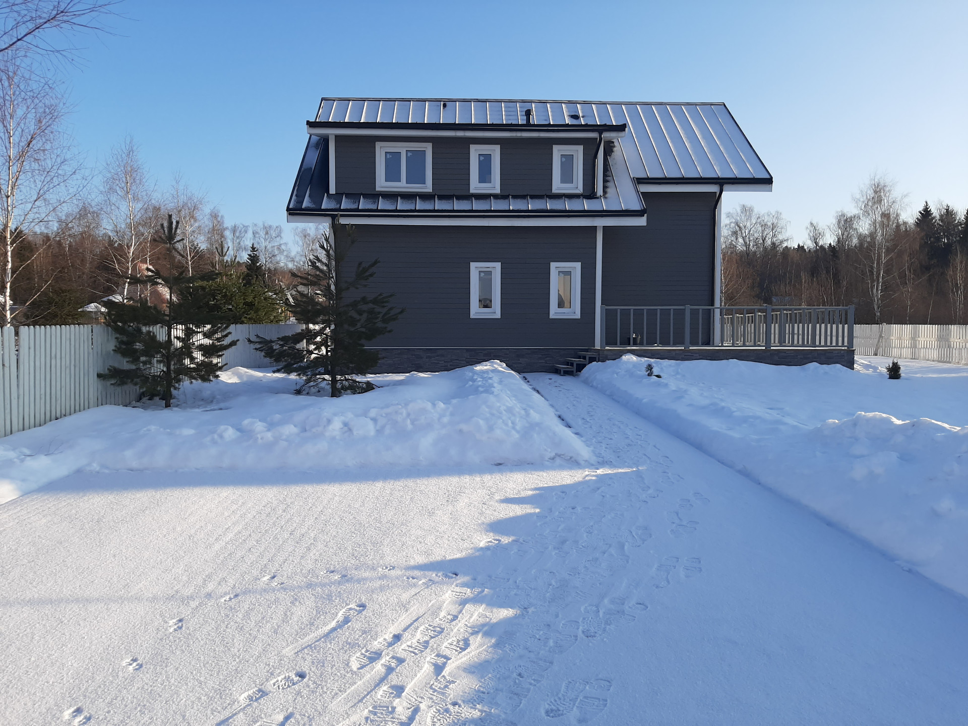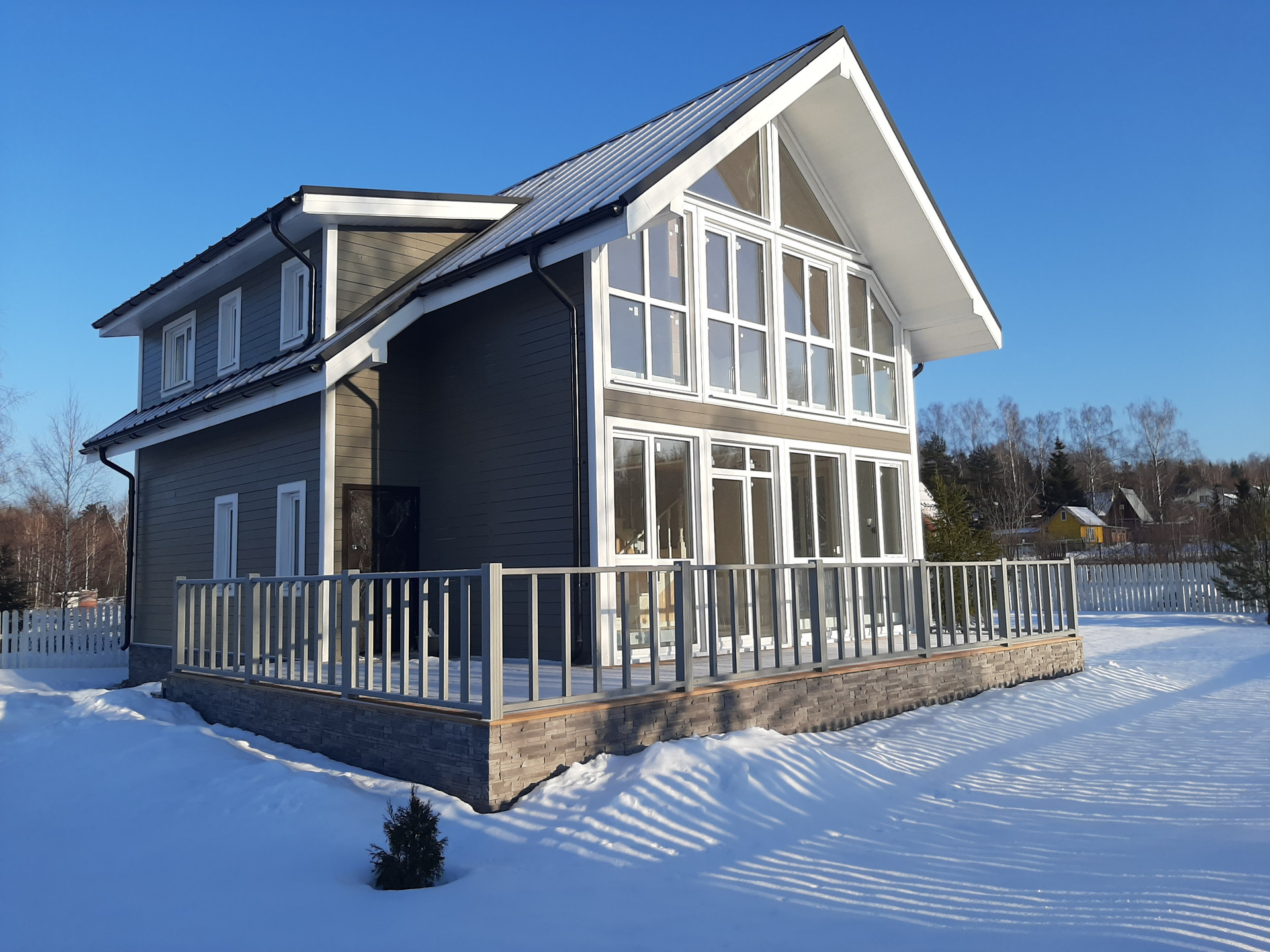 Дом построен на винтовых сваях по каркасной технологии из седвич-панелей заводского производства. Пригоден для круглогодичного проживания. Наружная отделка - имитация бруса из лиственницы окрашенной в серый цвет, внутренняя отделка стен - оштукатурены и окрашены. В санузлах и прихожей плитка, потолок комбинированный - листовой материал/вагонка из лиственницы. Панорамные окна из родительской спальни и гостиной. На первом этаже - тмабур, гостиная, кухня, спальня, санузел. На втором этаже спальни, санузел общий, родительская спальня с собственным санузлом.