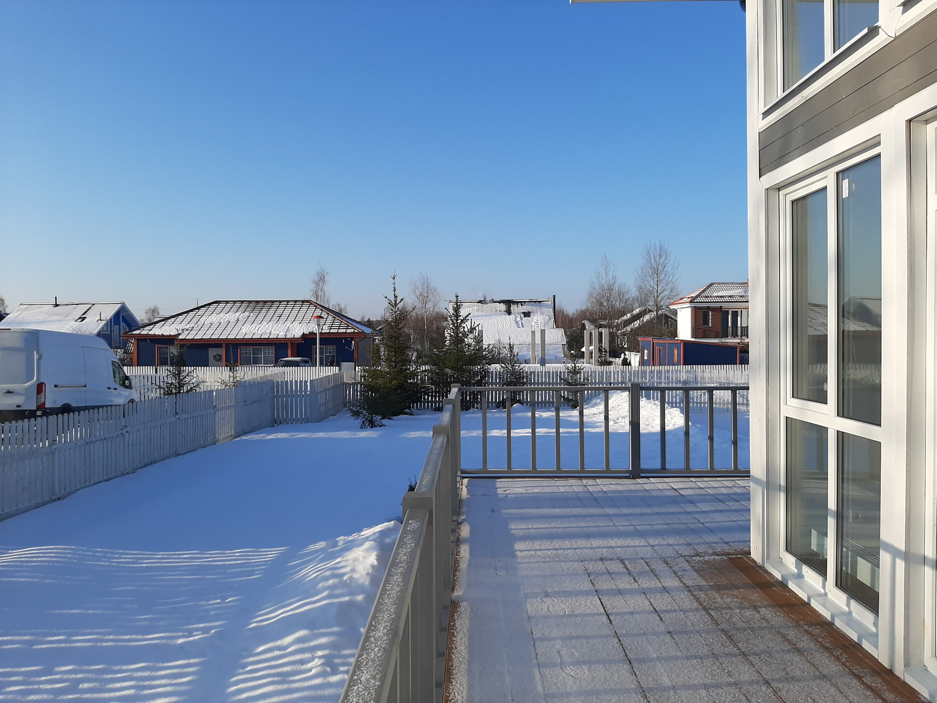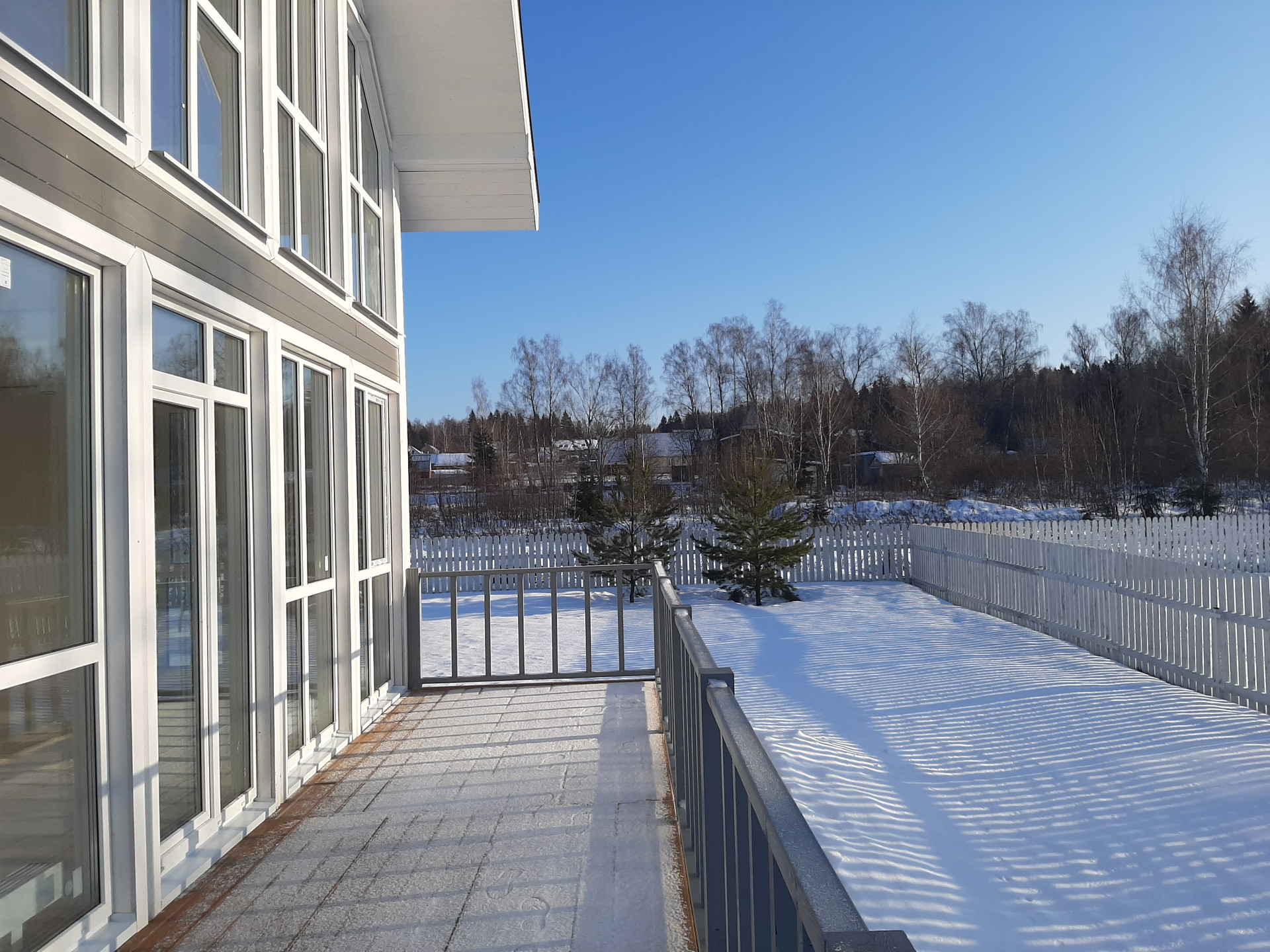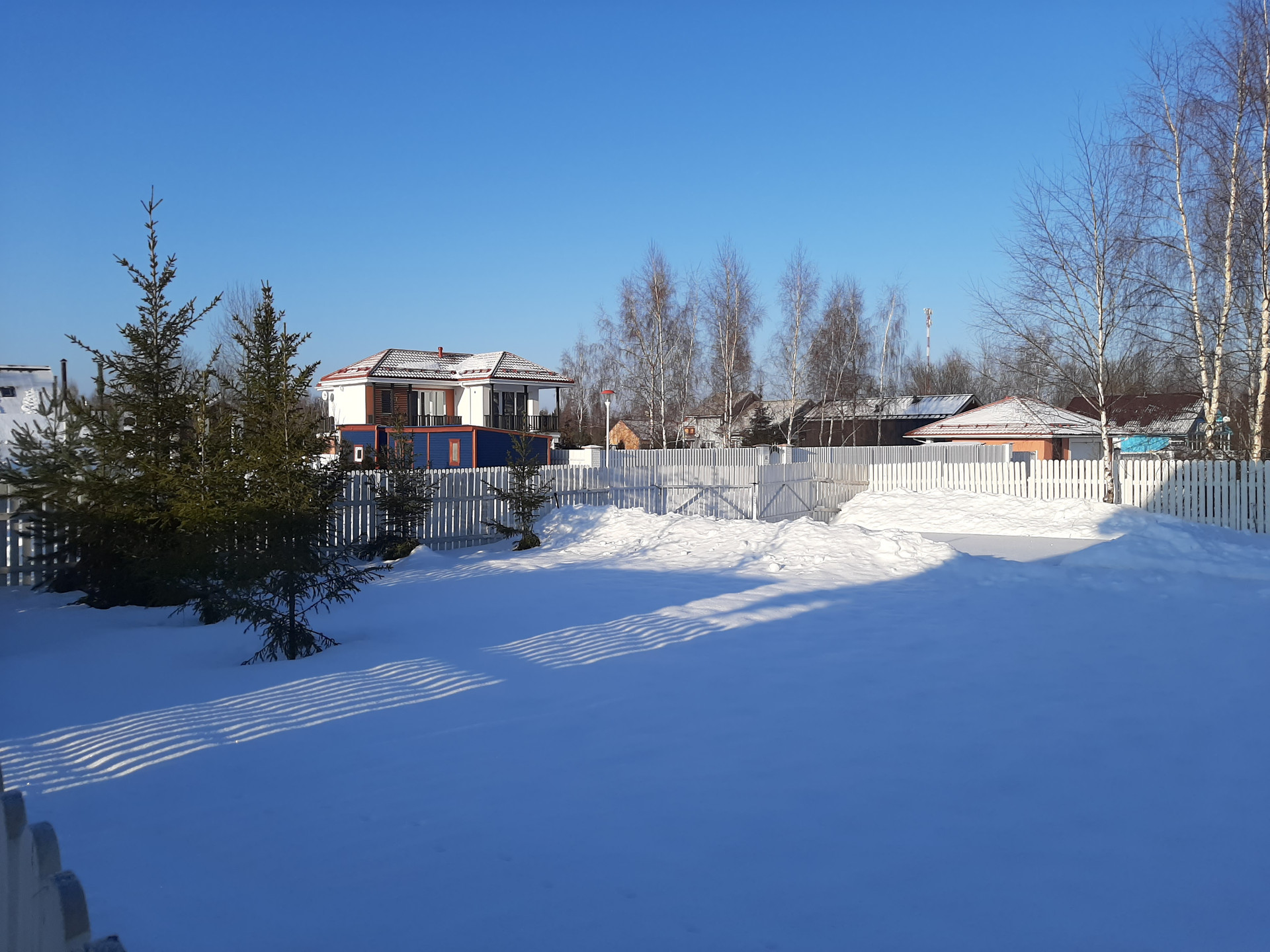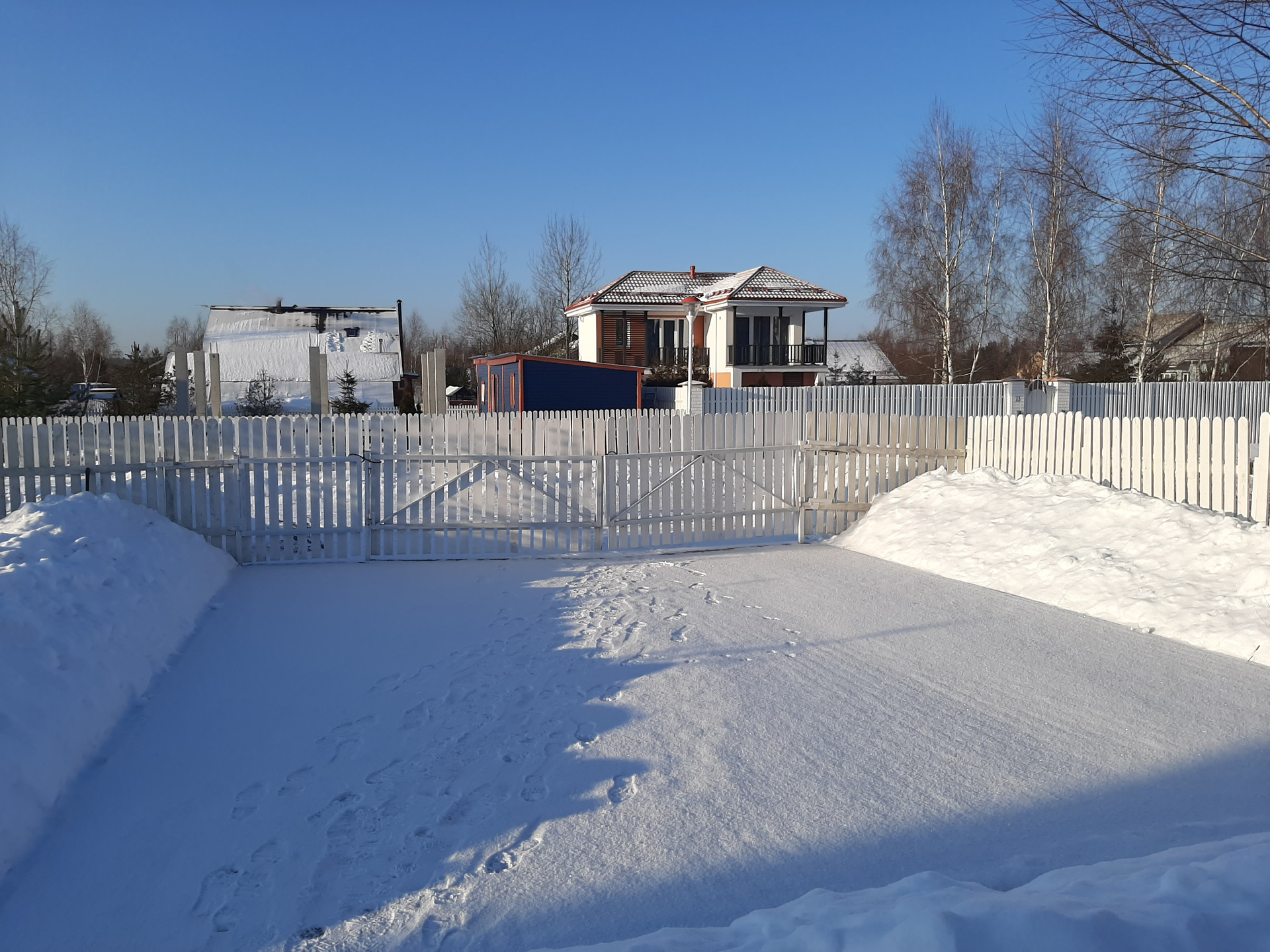 Участок 750 кв.м (7,5 соток), огорожен штакетником, есть ворота и калитка, перед домом сделаны дорожки и площадки из брусчатки.
