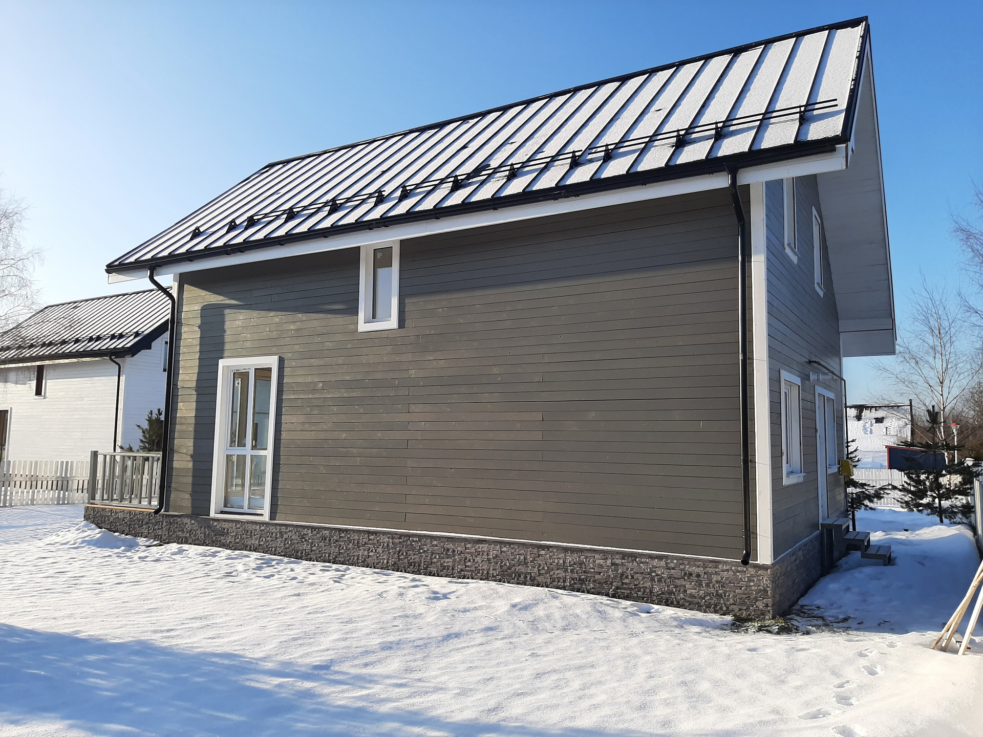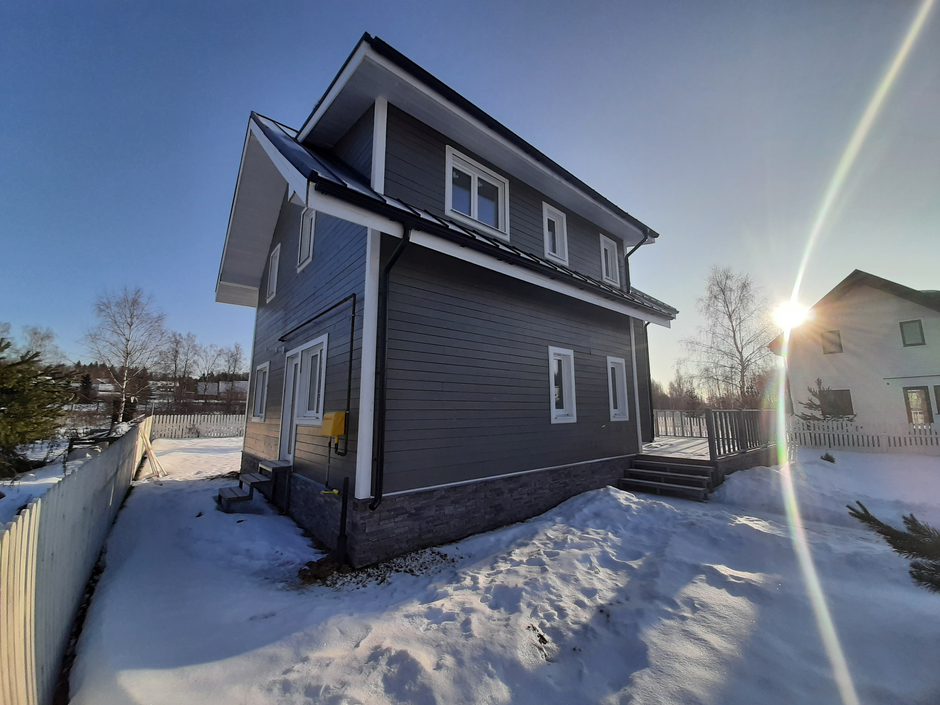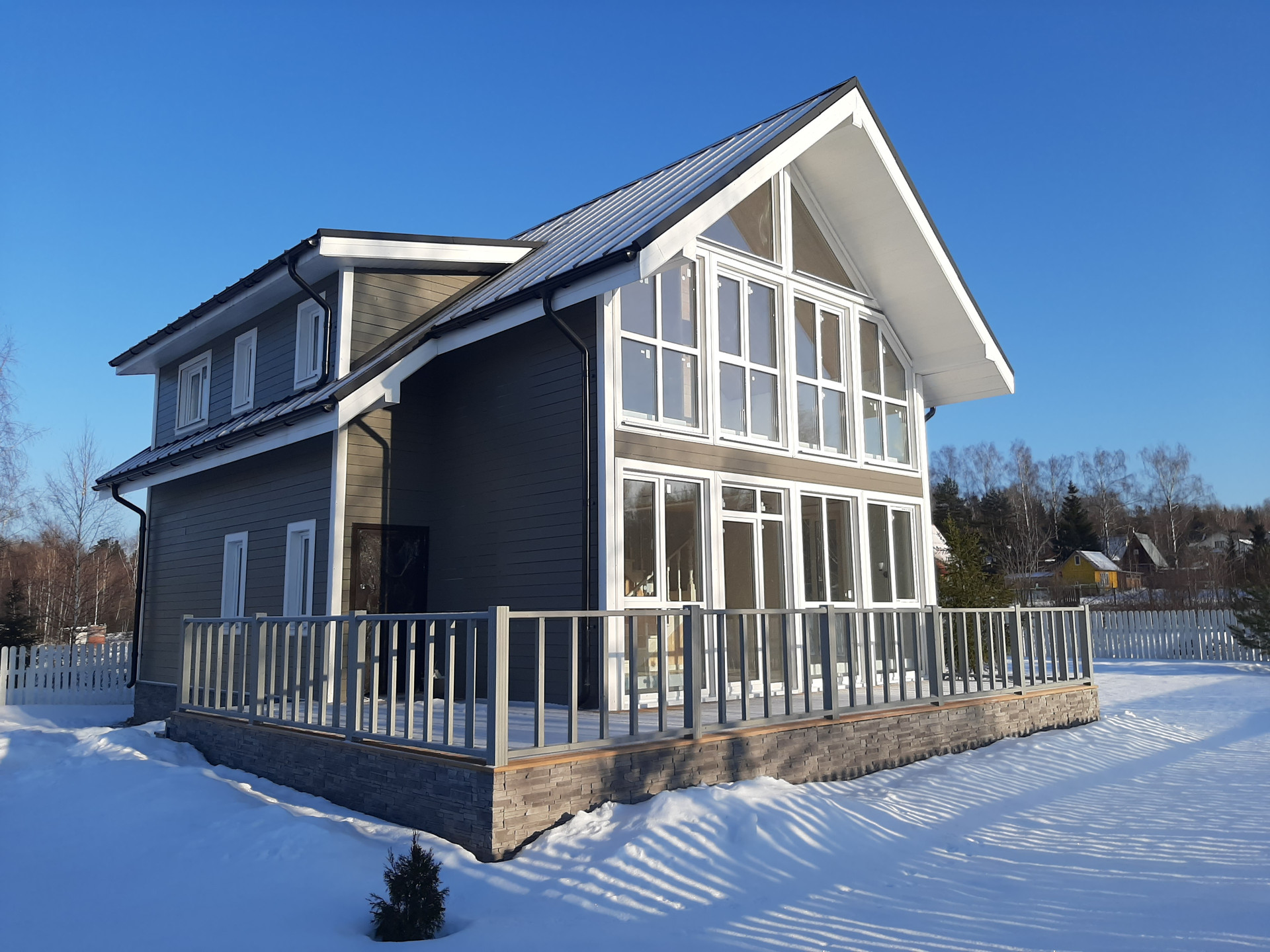 Фасад обшит имитацией бруса, заводской окраски, цоколь отделан декоративными панелями. Крыша - фальцевая кровля. Дом имеет большую открытую веранду, на которой можно приятно проводить теплые летние вечера в кругу друзей и семьи.