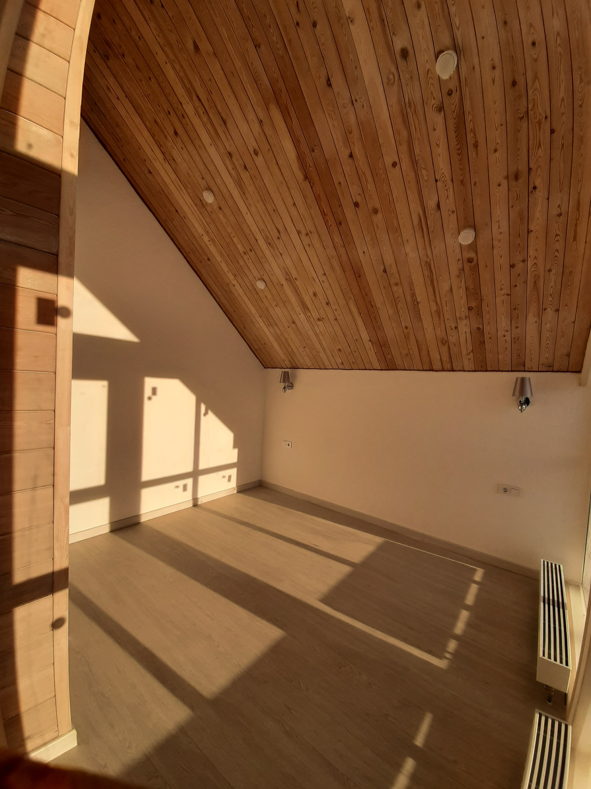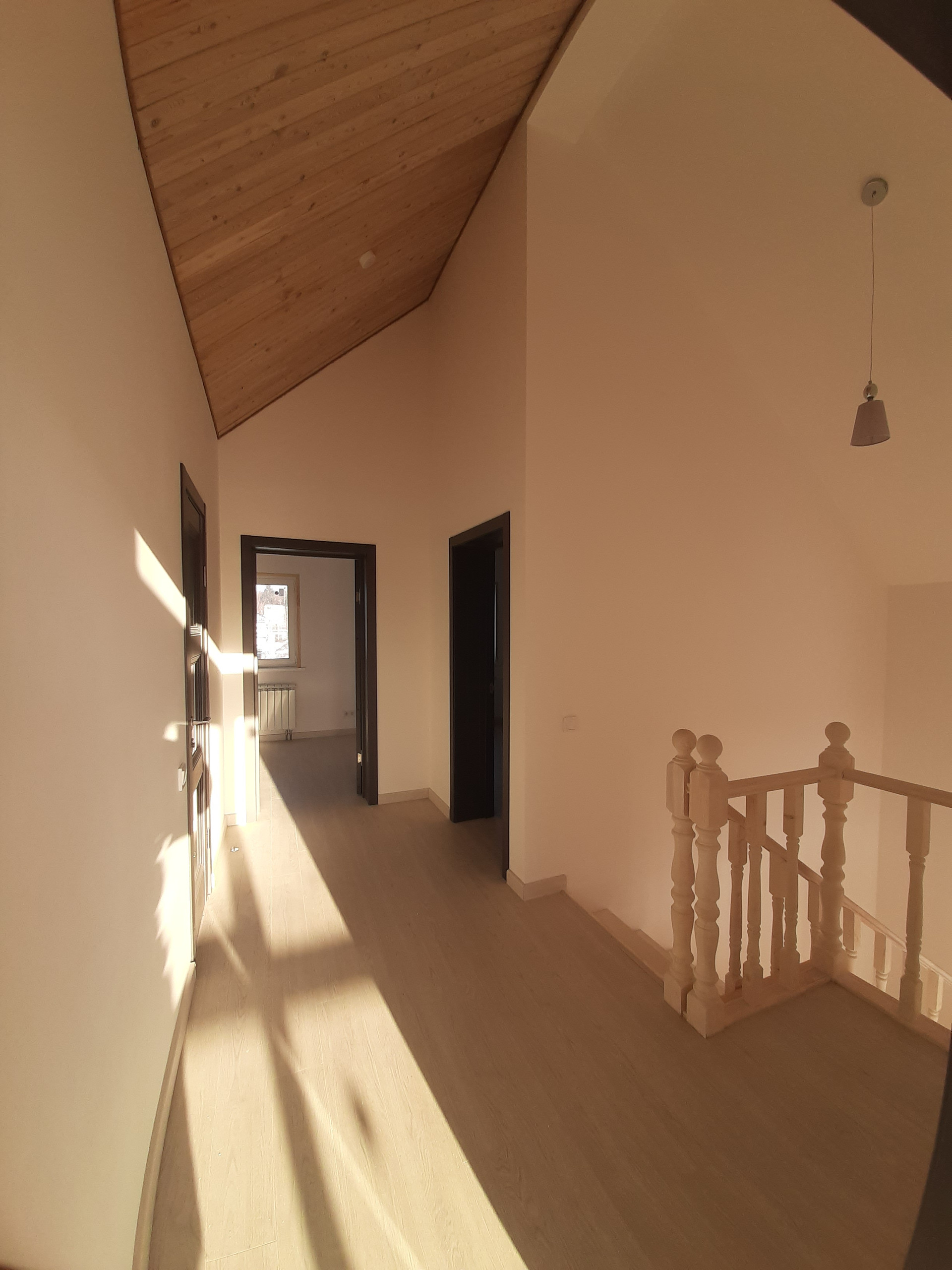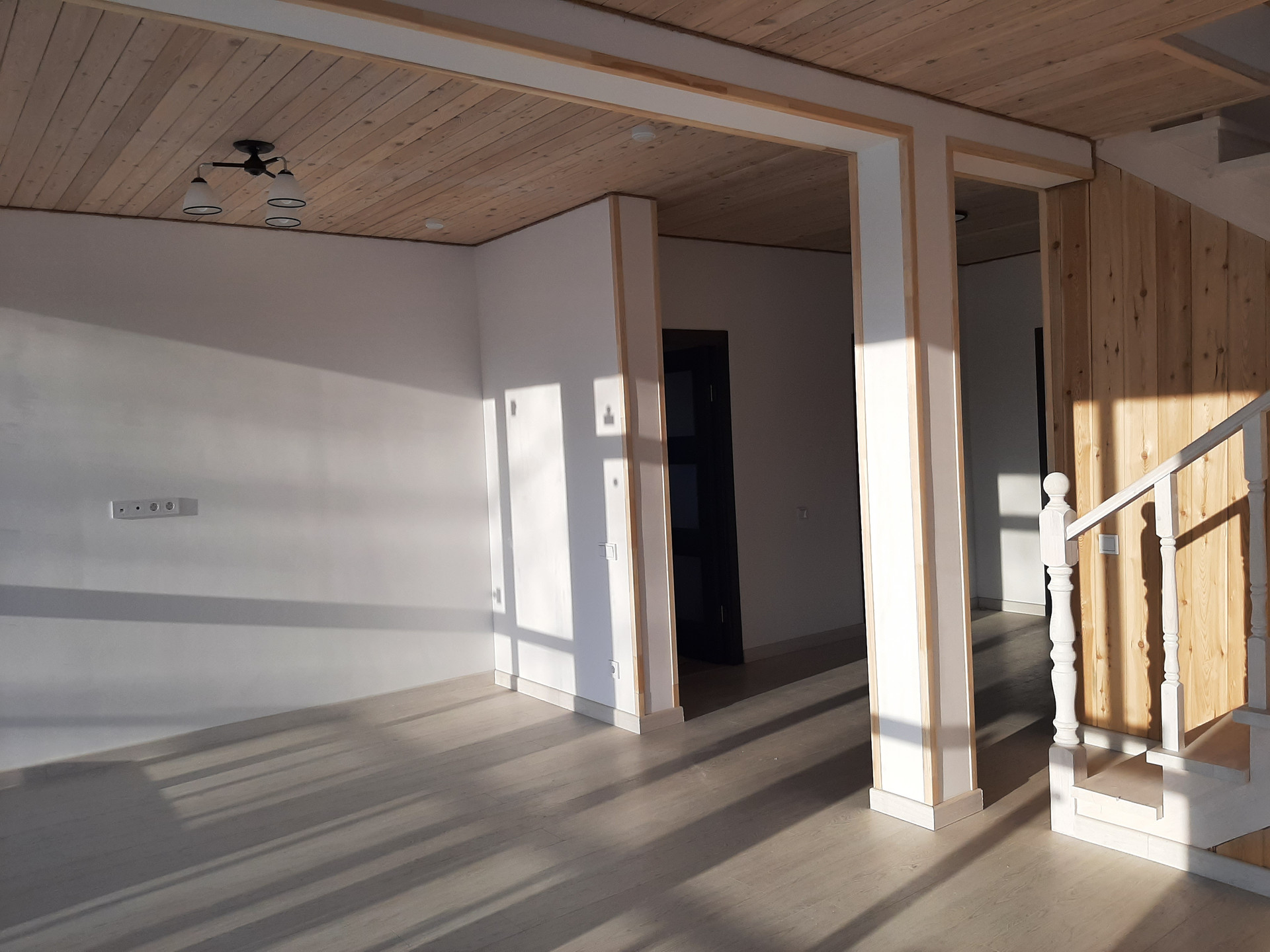 Внутренняя отделка дома – потолки обшиты имитацией бруса из лиственницы, стены - оштукатурены и окрашены, полы – ламинат 34 класса прочности, в санузлах и прихожей на полах уложен керамогранит, на стенах в санузлах – керамическая плитка. Во всех санузлах и прихожей сделаны теплые электрические полы с регуляторами мощности теплового потока.