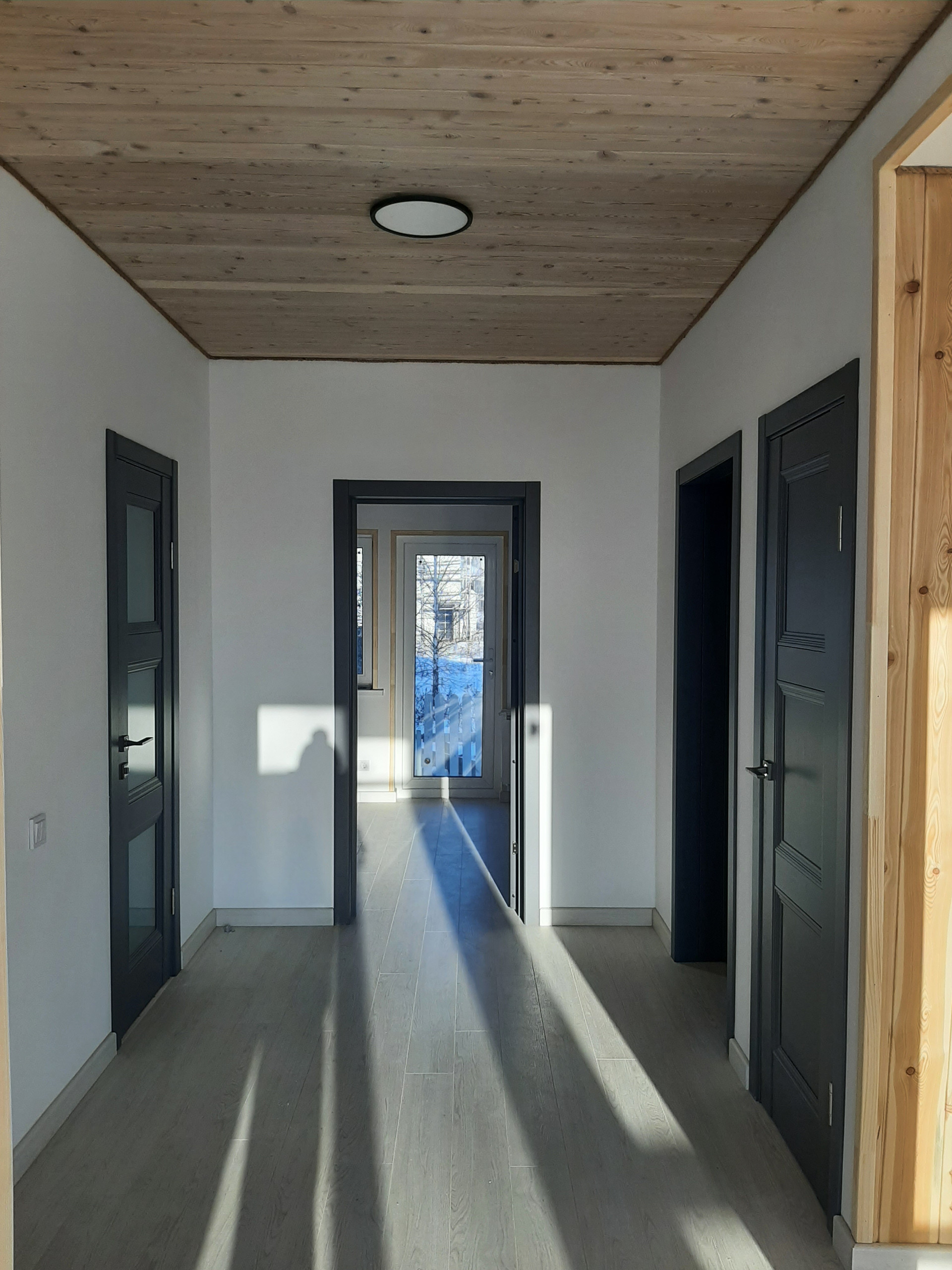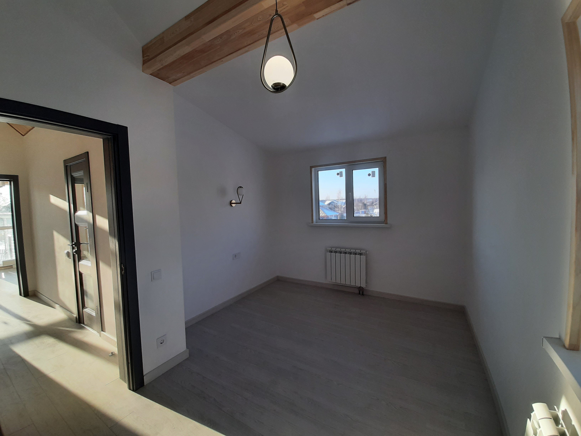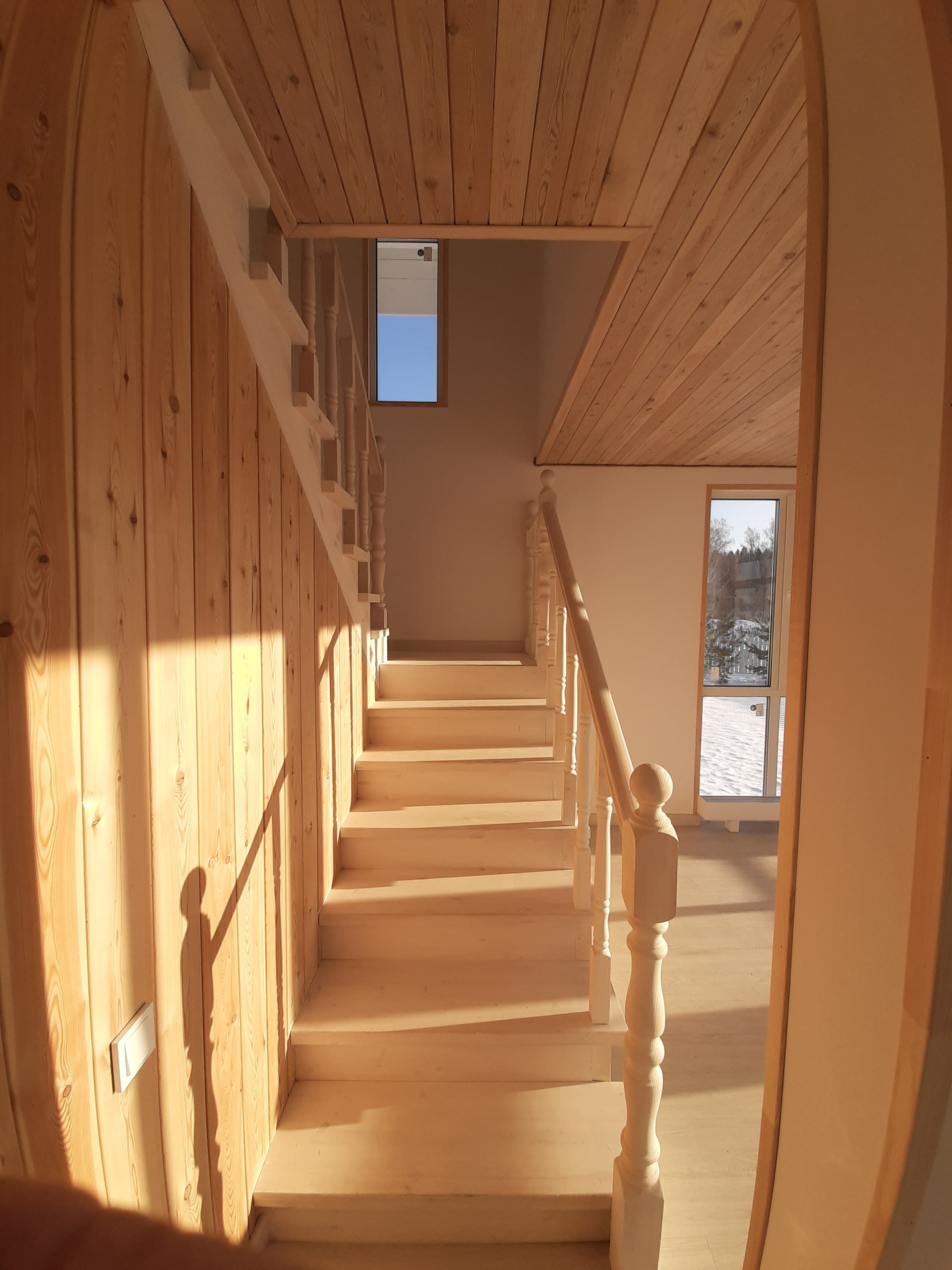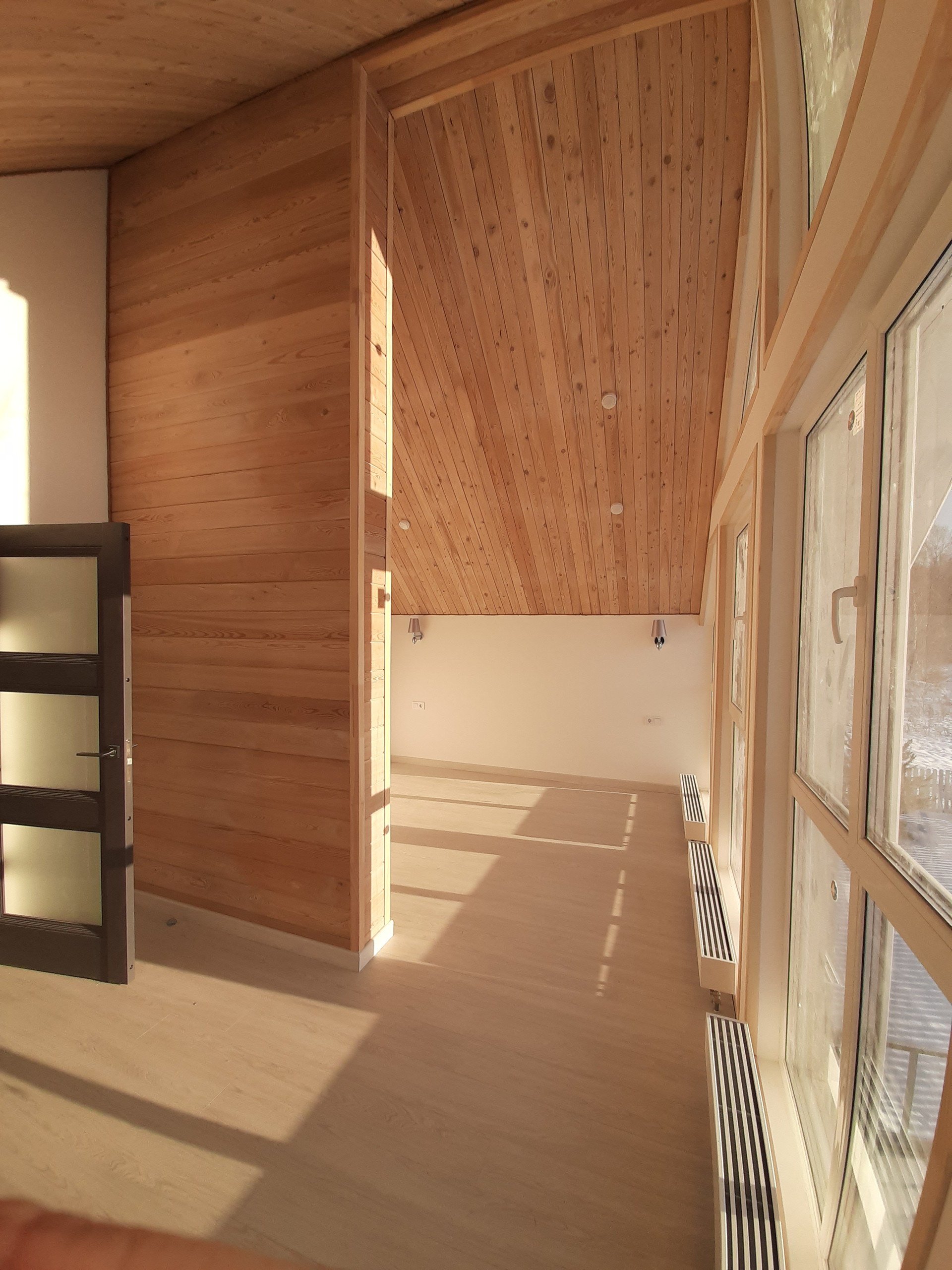 Внутренняя отделка дома – потолки обшиты имитацией бруса из лиственницы, стены - оштукатурены и окрашены, полы – ламинат 34 класса прочности, в санузлах и прихожей на полах уложен керамогранит, на стенах в санузлах – керамическая плитка. Во всех санузлах и прихожей сделаны теплые электрические полы с регуляторами мощности теплового потока.