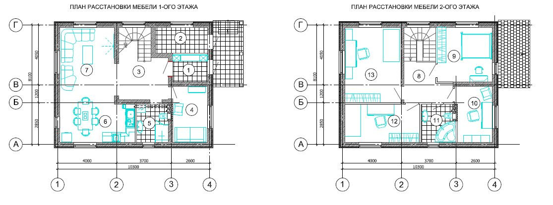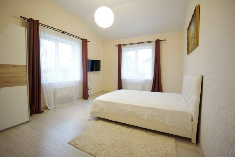 Планировка на первом этаже: котельная, холл,  кухня-гостиная, гостевая комната, ванная комната; планировка на втором этаже: 4 спальни, ванная комната.
