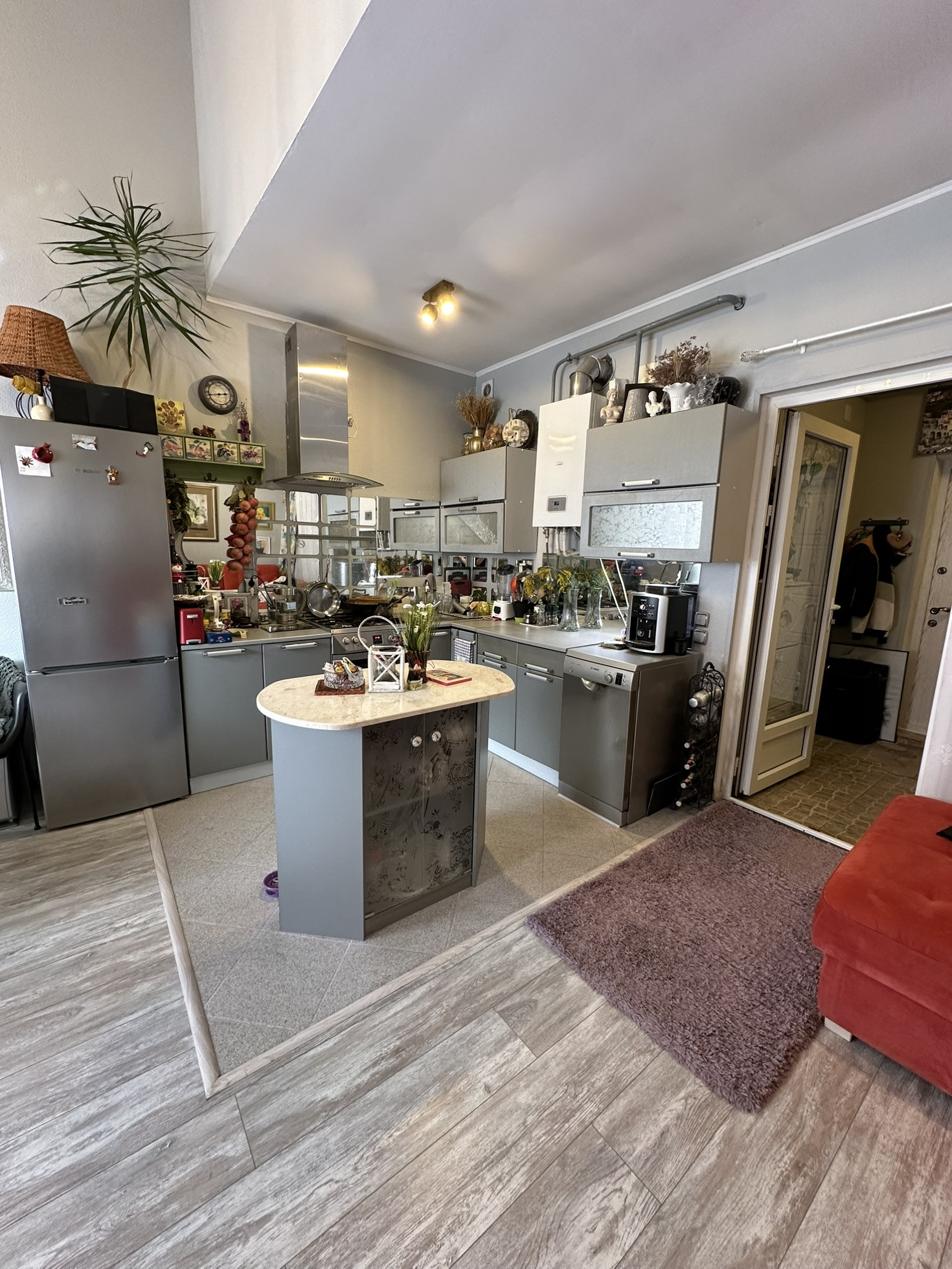 Первый этаж: прихожая, санузел, большая кухня-гостиная с выходом в зеленый внутренний двор, высокие потолки