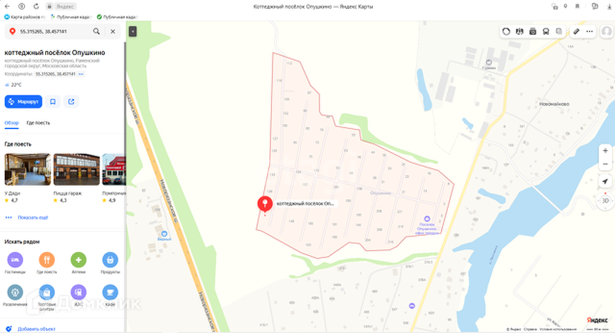4. О локации: участок расположен в 65 км от МКАД, выезд на Новорязанское шоссе в 2 км, в 800м – река Песоченка, - отличное место для рыбалки и отдыха на берегу реки. В 3-х км находится база отдыха – клуб по интересам для рыболовов, рядом садовый центр в Никитском – питомник растений. В шаговой доступности продовольственные магазины