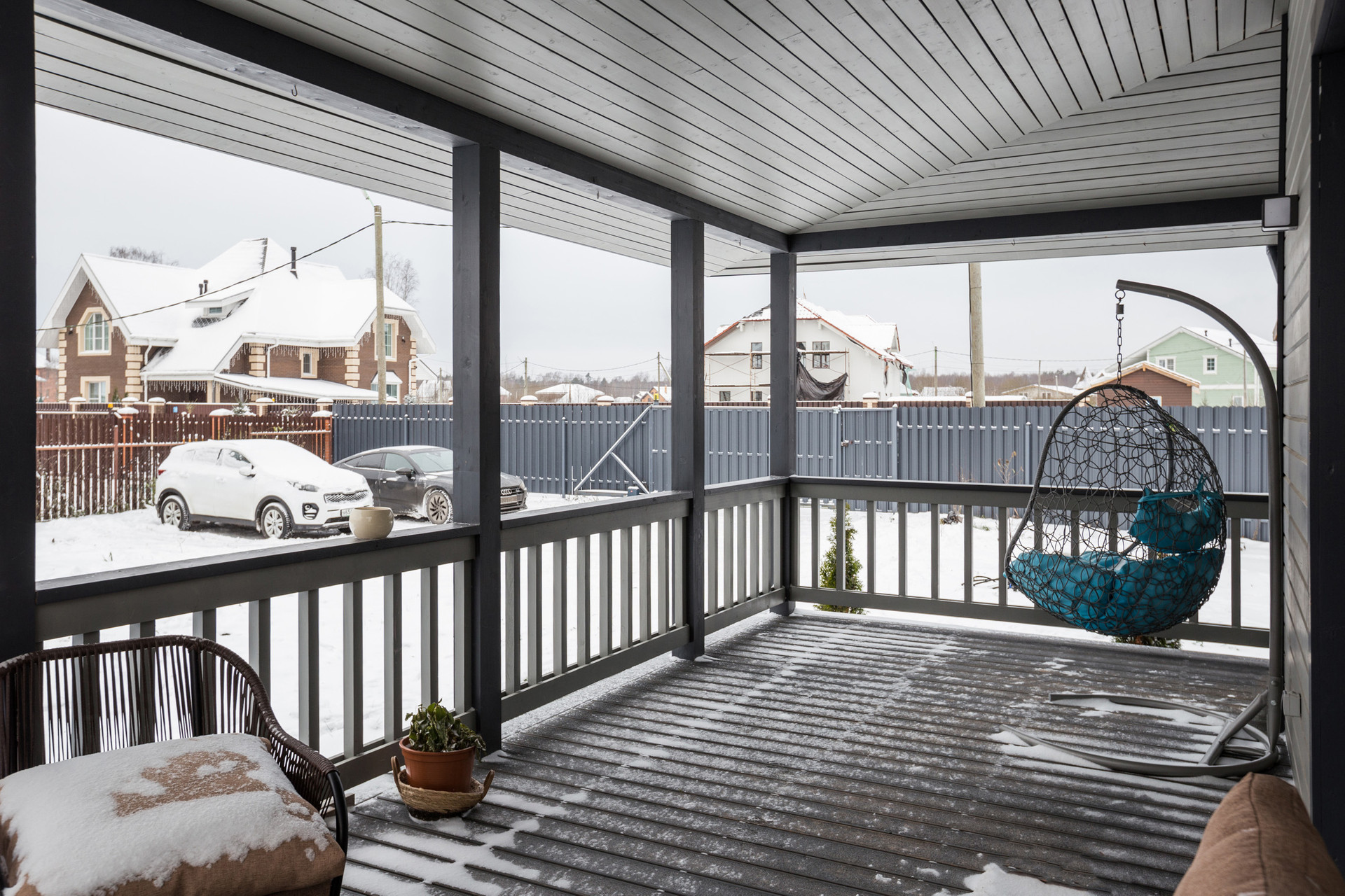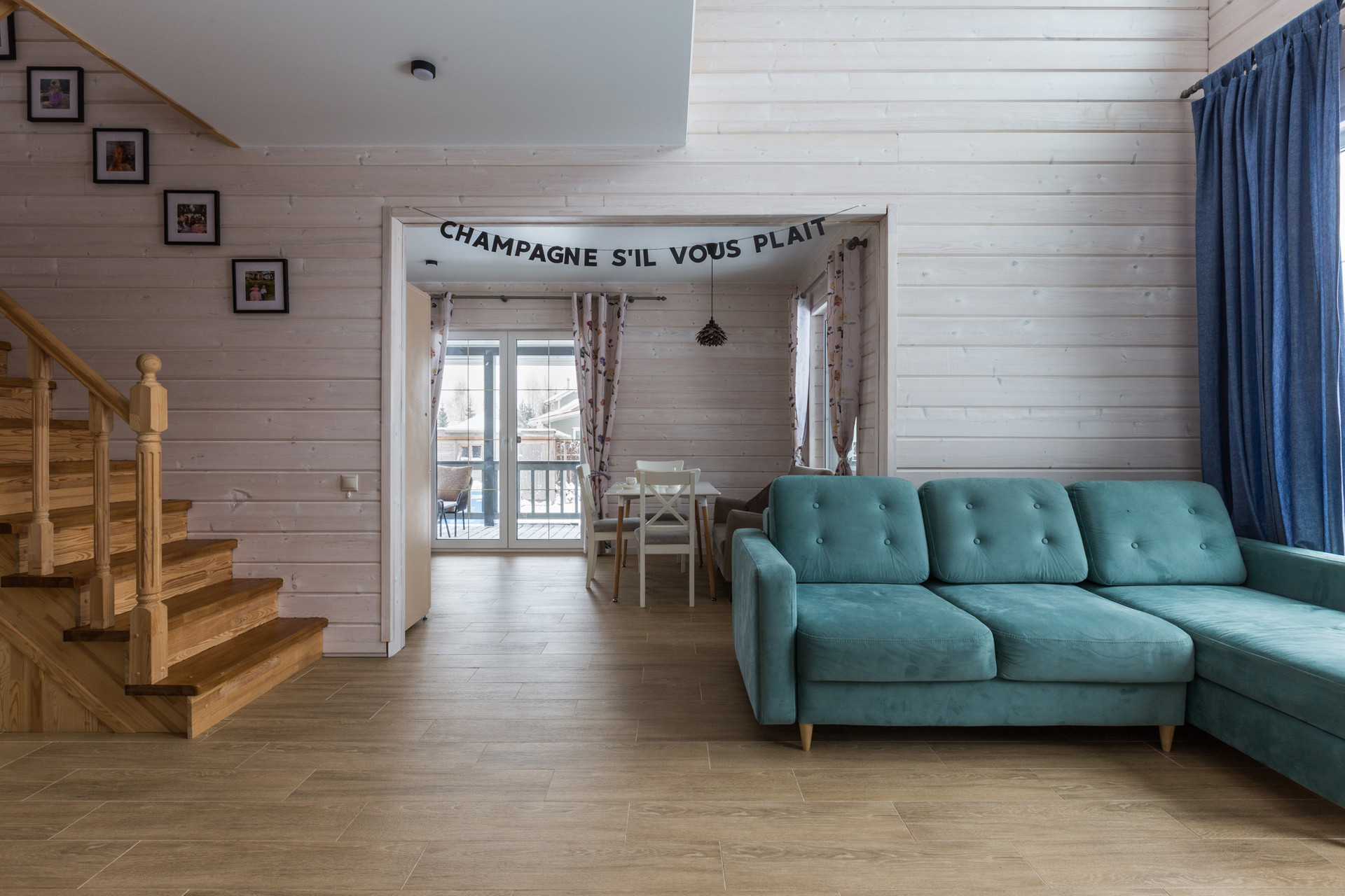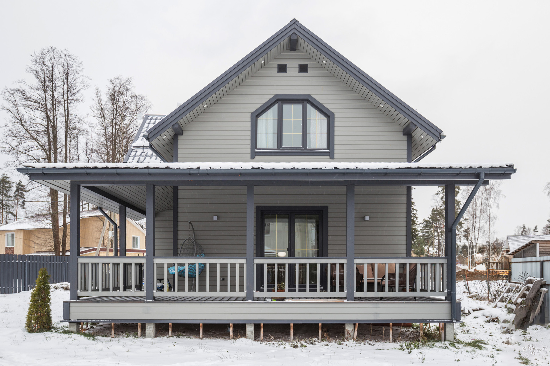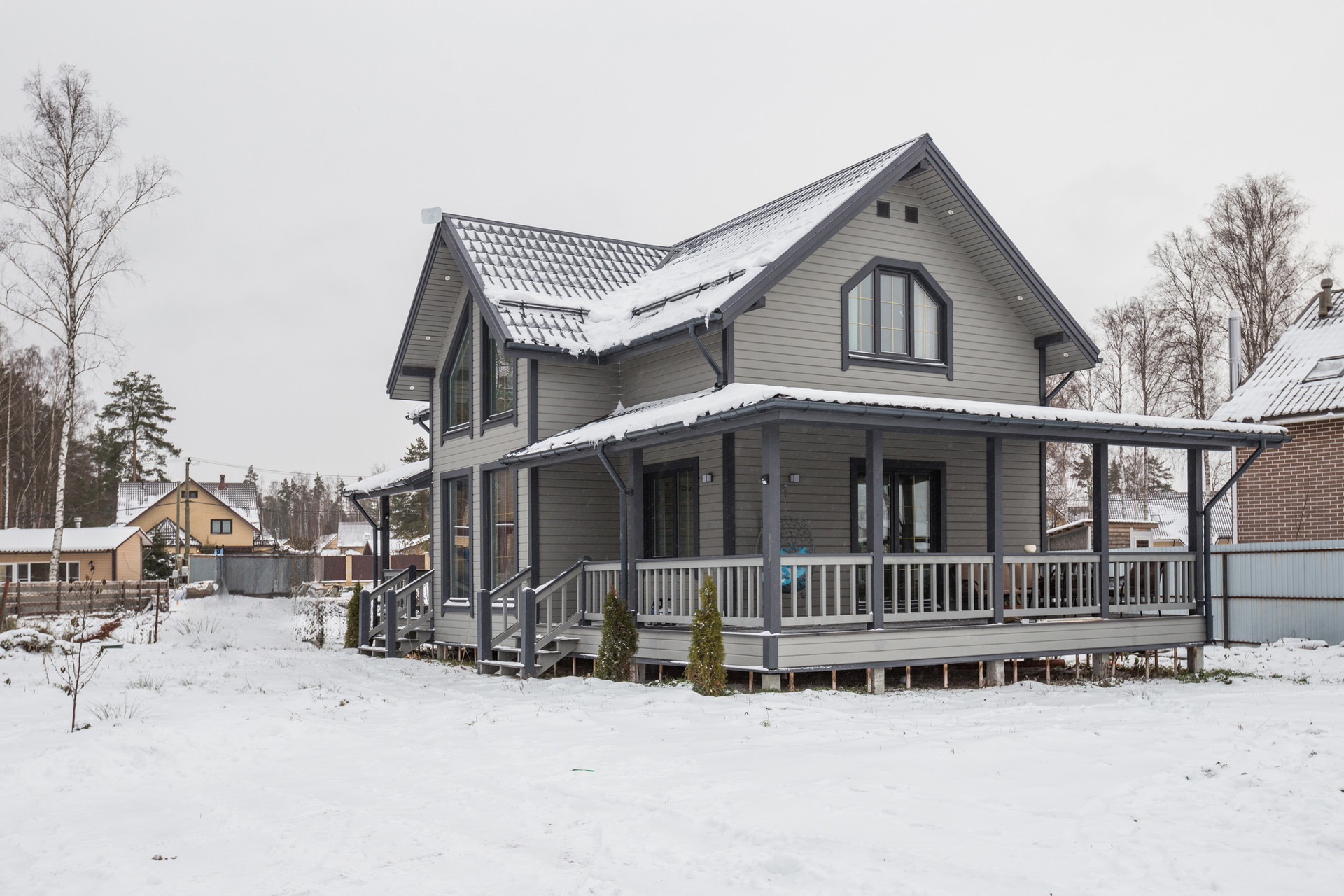 Двухэтажный каркасный дом 113 квадратов со вторым светом, с тремя спальнями, двумя санузлами, гостиной, кухней-столовой и огромной террасой.