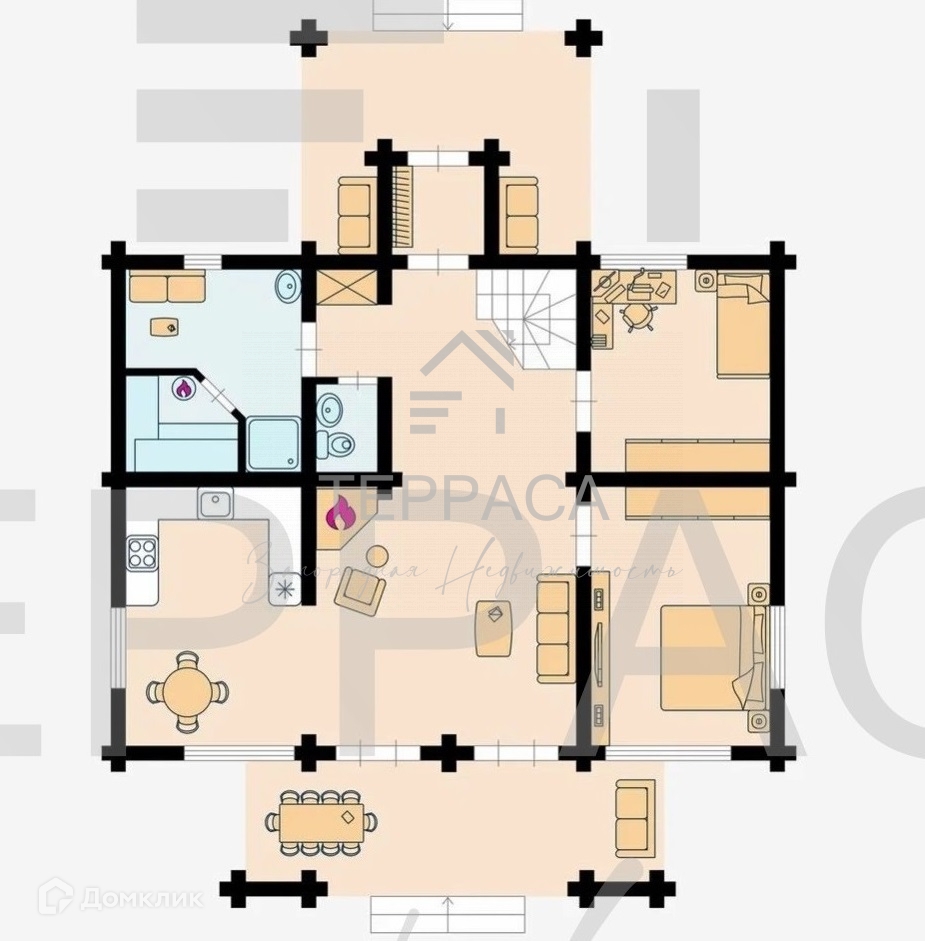 1 Этаж – кухня, столовая, уютная и просторная гостиная с камином, прихожая, 2 изолированные комнаты, с\у, тропический душ, сауна, холл, 2 крытые террасы.