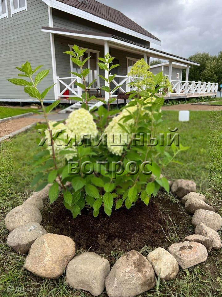Участок ровный, сухой, сделано выравнивание с насыпью, посажен газон. На участке посажены гортензии, елки, яблони, груши, клён, туи.