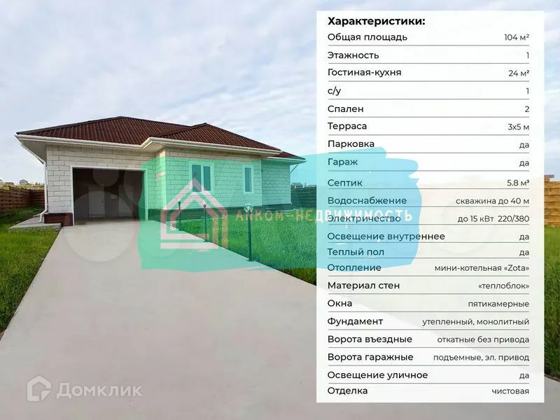 Одноэтажный дoм, с гаражом и террасой, в полностью чистовой отделке из премиум материалов. Цена в объявлении настоящая, за готовый к заселению дом. На данный момент этап фундамента. Проведем экскурсию по строящимся сейчас домам. Посмотрите, как строим, из чего строим. Проконсультируем.Надежность сделки и гарантия фиксированной цены. Быстрое строительство: Сроки выполнения - всего 3-5 месяцев. Ипотека и аккредитация: Дом подходит под все виды ипотечных программ (семейная, сельская, программа 20/20, ипотека под строительство). Наши банки партнёры: Сбербанк, Альфабанк, Почта банк, Дом РФ банк, Левобережный банк. Расположение: Коттеджный поселок Отрадное, Емельяновский район. Новый поселок со шлагбаумом, пунктом охраны. Экологически чистый район, свежий воздух. 15 минут по трассе до ТРЦ Планета, 7 минут до города (Октябрьский район). О данном проекте : Проект № 97. Площадь застройки: 104 мsup2;.Большая терраса 15 мsup2;, забор, вместительный гараж, уличное освещение - все входит в проект.Чистовая отделка. Стены в мягких постельных тонах. Натяжной потолок со встроенными светильниками. Во всем доме пятикамерные окна. В кухне-гостиной французские окна в пол с выходом на террасу. Французские окна обладают большой площадью и наполняют дом большим количеством света и тепла.В доме хорошо продуманная планировка для комфортного проживания. План схему смотрите в фотографиях.Две уютные спальни (11,5 мsup2; и 15,6 мsup2;), Светлая кухня - гостиная (24 мsup2;) Ванная комната (6,0 мsup2;), с окном. Акриловая угловая ванна. На ванне и раковине сразу установлены качественные смесители, немецкого бренда Gарро.В доме предусмотрены ниши для расположения стенных шкафов, что значительно улучшает качество жизни, позволяя сохранять свободное пространство.Для котельного и насосного оборудования предусмотрено отдельное техническое помещение в гараже. Гараж с тех.комнатами 28 мsup2;.Материал стен - теплоблок (песко-бетонный блок + утеплитель + лицевая отделка). Достоинства теплоблоков: Высокие показатели теплосбережения. Зимой тепло, летом прохладно. Устойчивость к воздействия окружающей среды, влаге, резким передам температур. Экологическая безопасность. Фундамент - утепленная, монолитная П-образная плита. По всему периметру дома выполнена утепленная отмостка. Отделка фундамента (Dосkе). Кровля Оnduvillа. Отопление - теплый пол, электрокотельная (Zоtа 3/6/9 кВт). Практически не требует облуживания, полностью автономная.Дом оснащен всем необходимым оборудованием и коммуникациями: эл. энергия 15 кВт, септик 5,8 мsup2;, автономное водоснабжение (скважина до 40 м).Стоимость земельного участка рассчитывается индивидуально. Характеристики: Площадь застройки: 104 мsup2;Этажность: 1Гостиная-кухня: 24 мsup2;с/у: 1Спален: 2Терраса: 3х5 мПарковка: даСептик: 5.8 м3Водоснабжение автономное: скважина до 40 мЭлектричество: до 15 кВт 220/380Отопление: мини-котельная Zоtа 6/9 кВМатериал стен: теплоблок Окна: пятикамерныеФундамент: утепленный. МонолитныйВорота въездные: откатные без приводаЗабор: даОтделка: чистовая, евро. Стоимость с участком уточняйте по телефону.