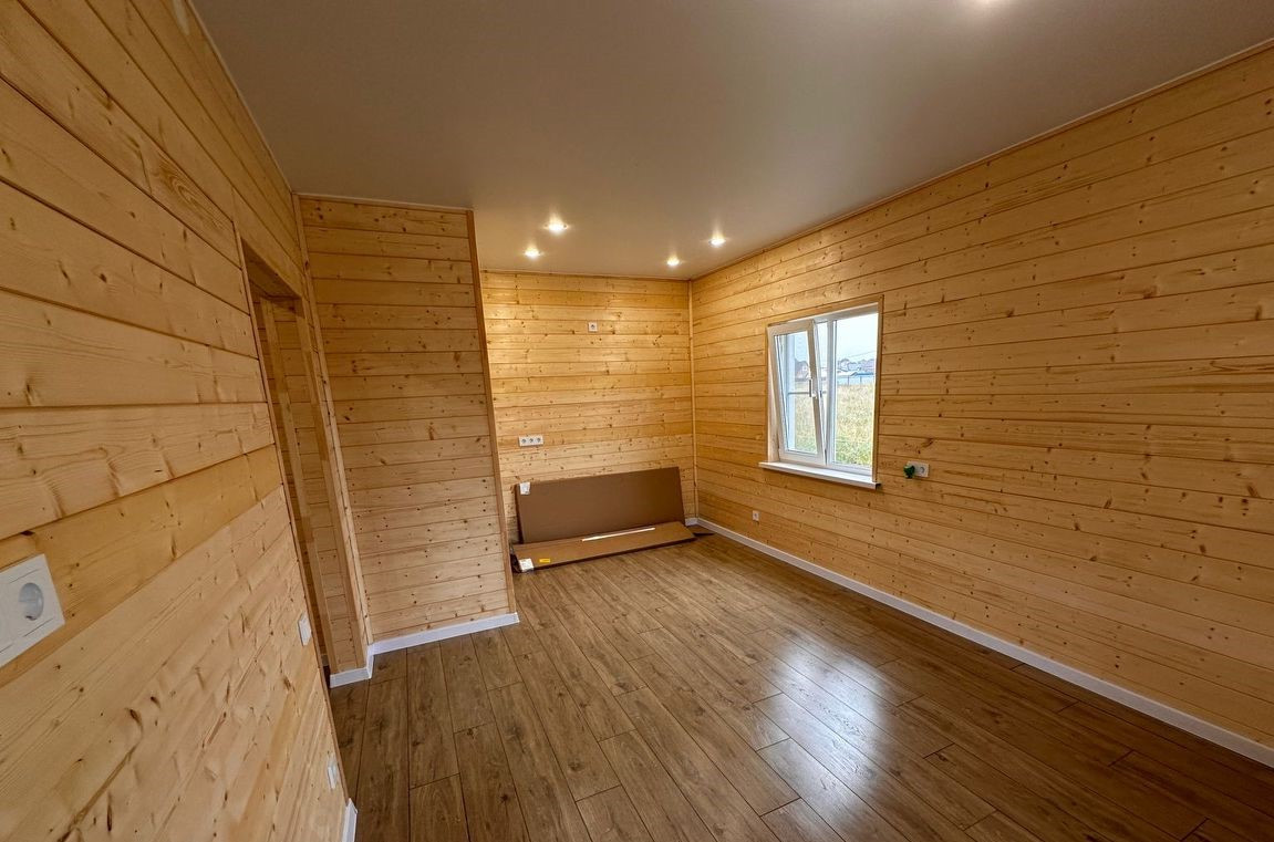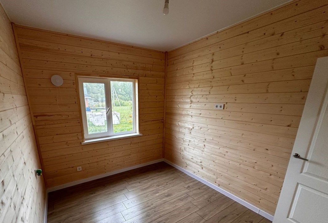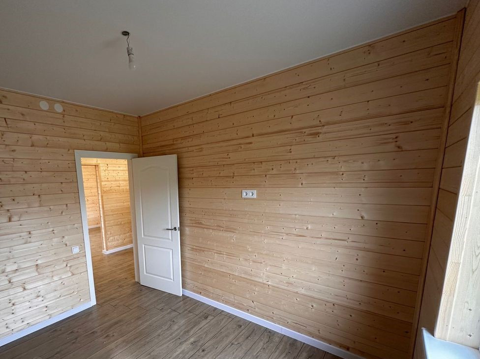 Снаружи дом обшит имитацией бруса окрашенной на производстве, покрытие долго прослужит. Внутри обшит имитацией бруса. Потолки натяжные, пол ламинат.