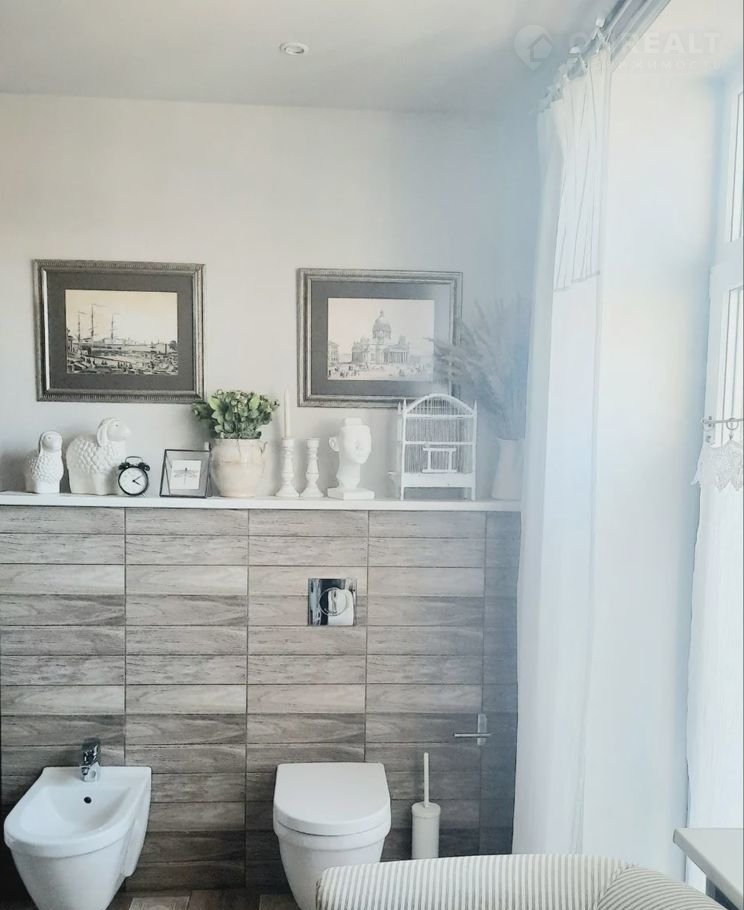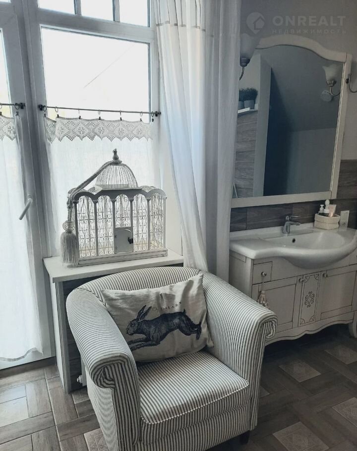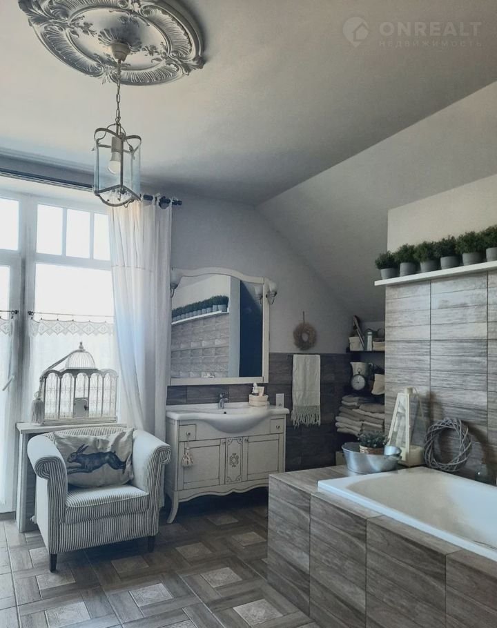 Санузел второго этажа представляет из себя большую и прекрасную ванную комнату с окнами в пол, с большой ванной, душ-кабиной, постирочной зоной и зоной отдыха. Натуральный изысканный текстиль, особенный декор, объем и свет делают эту комнату одной из любимых.