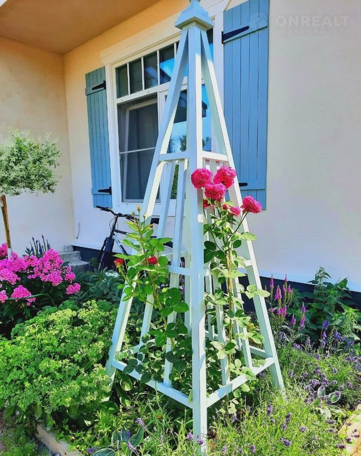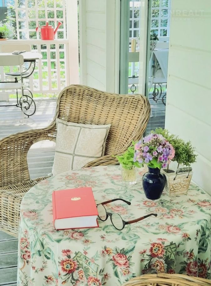 Большие панорамные окна гостиной, раздвижные двери приглашают на большую белую террасу- прекрасную в любое время года, летом и до глубокой осени увитую розами и ароматной жимолостью, с красивыми обрешетками для плетистых растений и встроенными шкафами, деревянным буфетом.