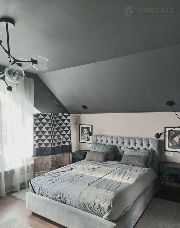 На втором этаже расположена хозяйская спальня с большими окнами и панорамой на хвойный лес. В приглушенных тонах, очень стильная и необычная. Комната, в которой царит покой, тишина и красота. Комната, в которой просыпаешься с лучами утреннего солнца под пение птиц. К спальне примыкает большая удобная гардеробная комната с системами хранения.