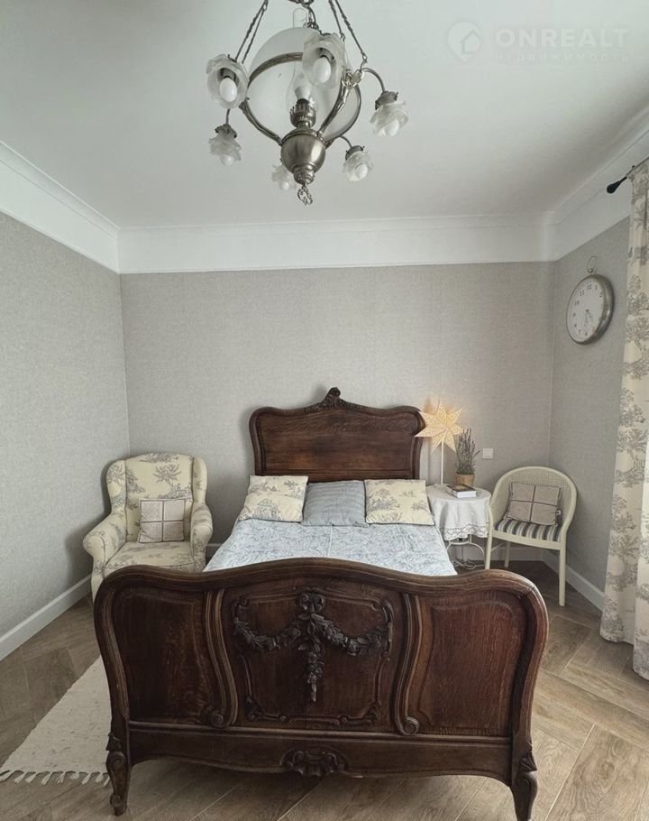 На первом этаже находится большая, светлая и очень красивая гостевая комната с антикварной люстрой и антикварной, французской деревянной кроватью. Натуральные ткани «Жуи», мягкий теплый свет, удобные комоды. Может быть использована как комната для пожилого человека.