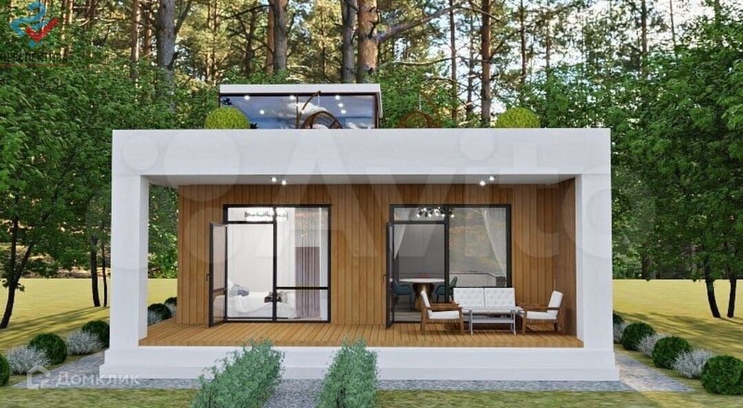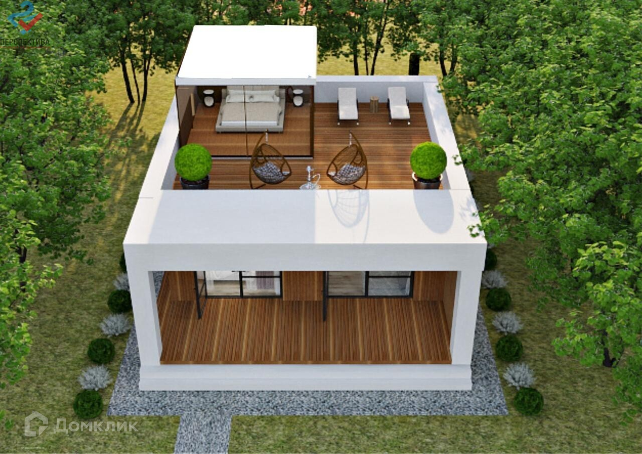 — 2й этаж (лёгкий, летний-дерево+стекло): 2 спальни, открытая веранда, сан-узел