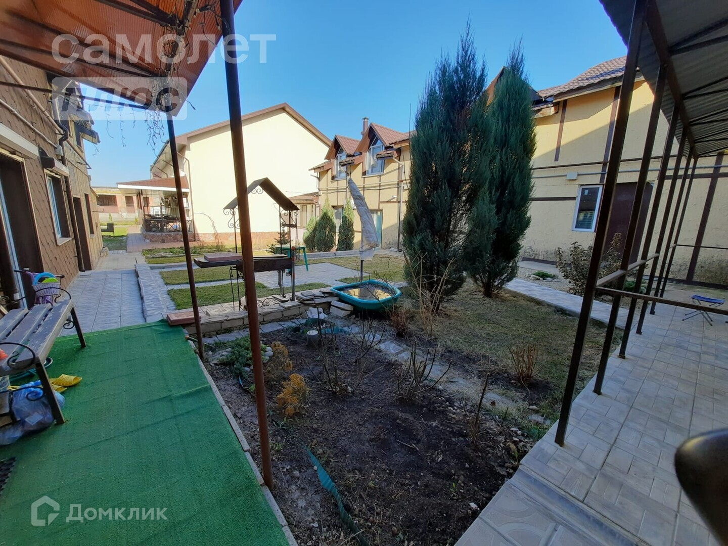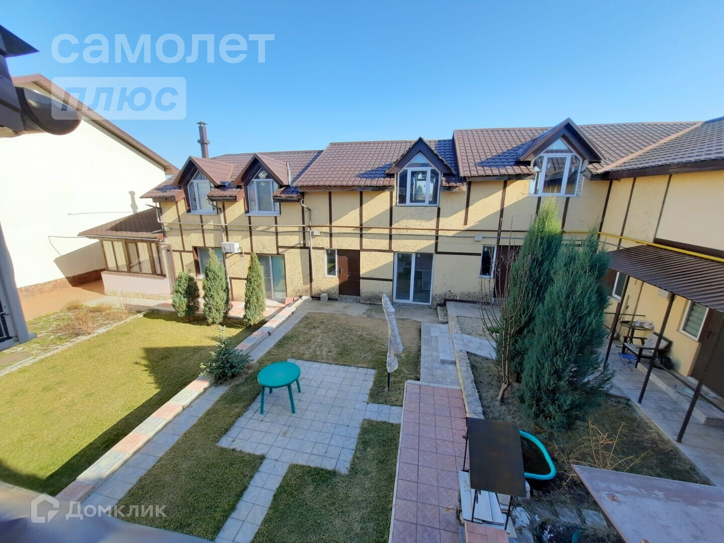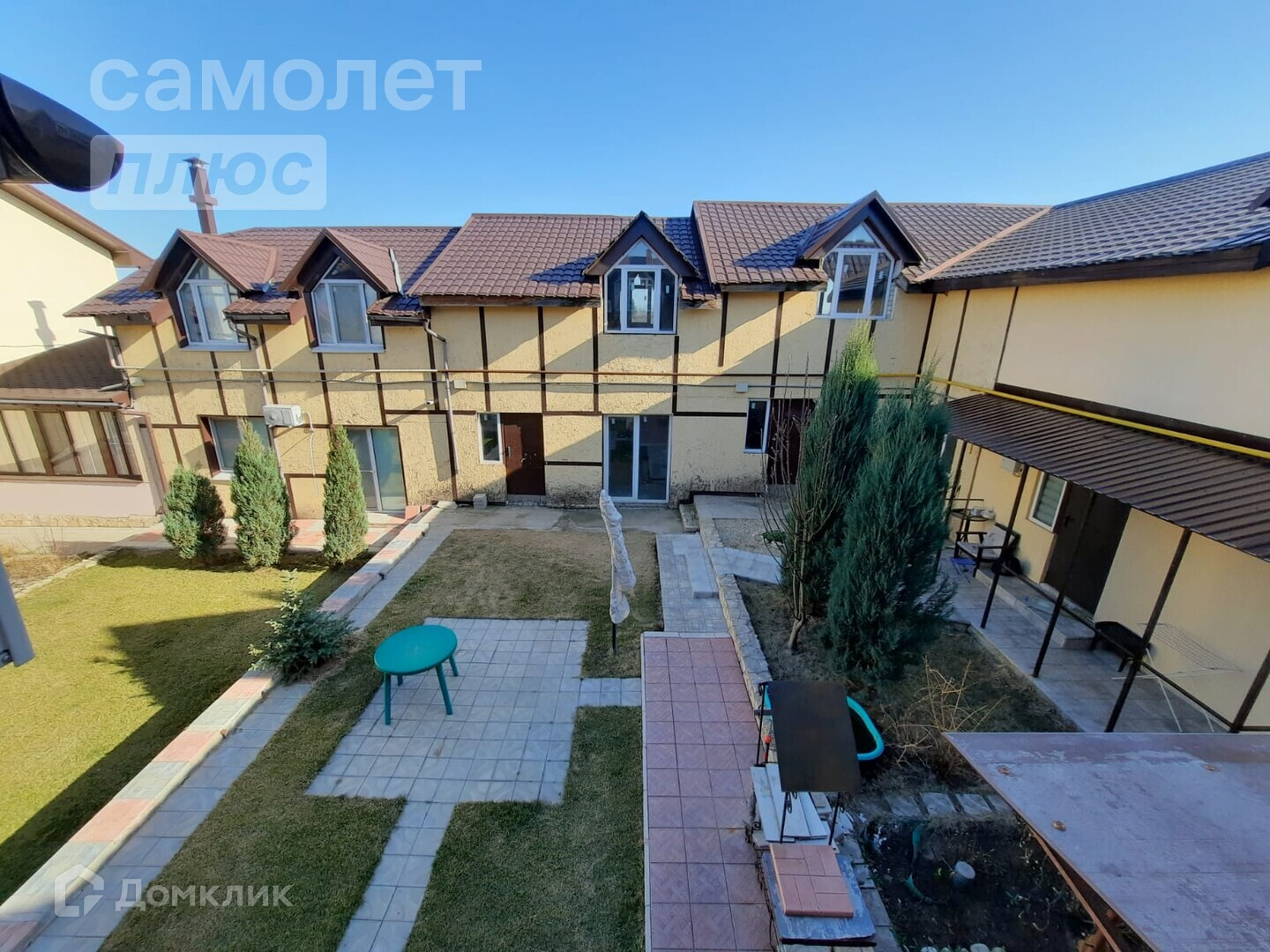 - Вход в дом со двора и скрыт от глаз случайных прохожих. Дворик зелёный, с газоном, туями и палисадником, имеется мангальная зона, дом стоит буквой П.