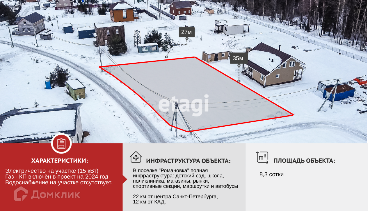 Он представляет собой ровный и сухой участок в коттеджным посёлке Перепёлкино площадью 8,3 сотки. Закрытая территория.
