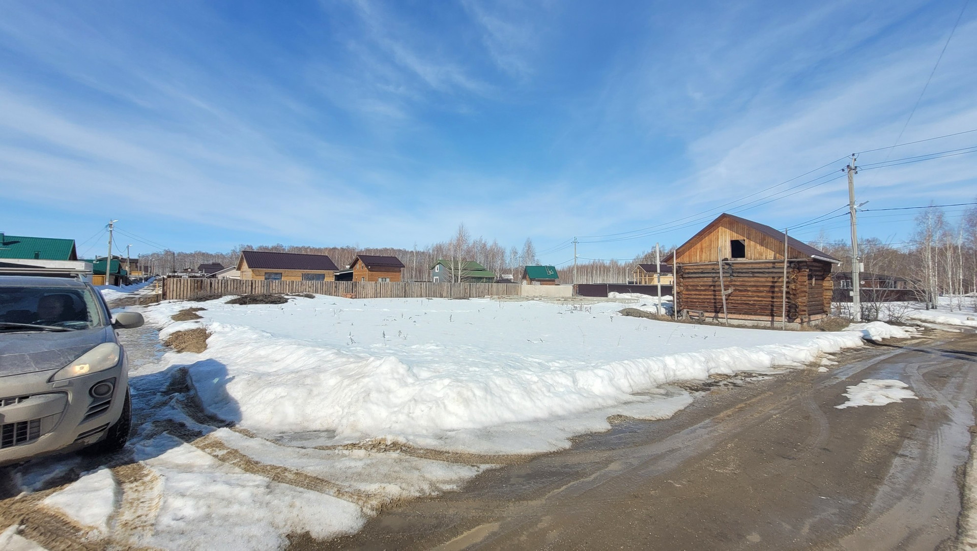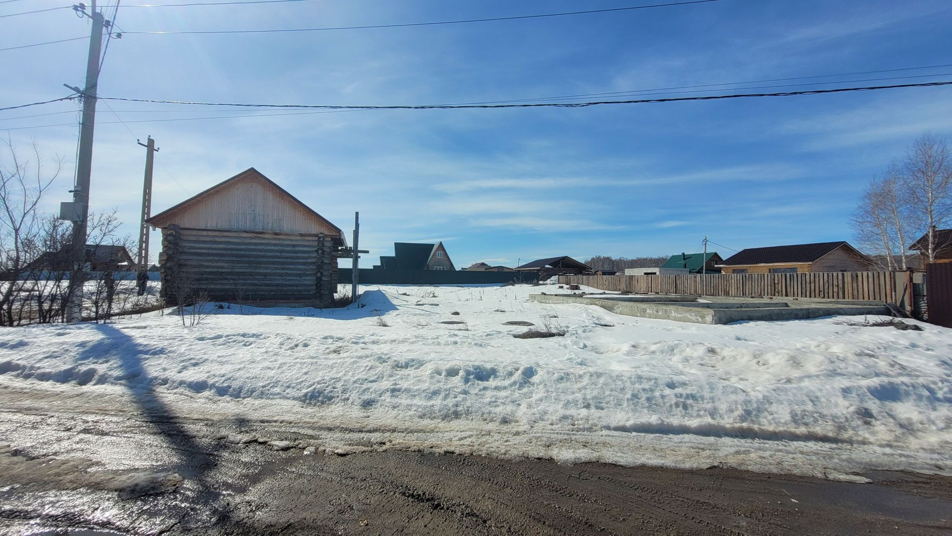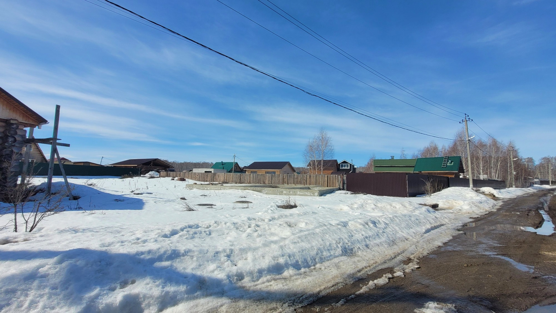 На участке есть сруб под баню, фундамент под дом, выгребные ямы (2 колодца), скважина.
