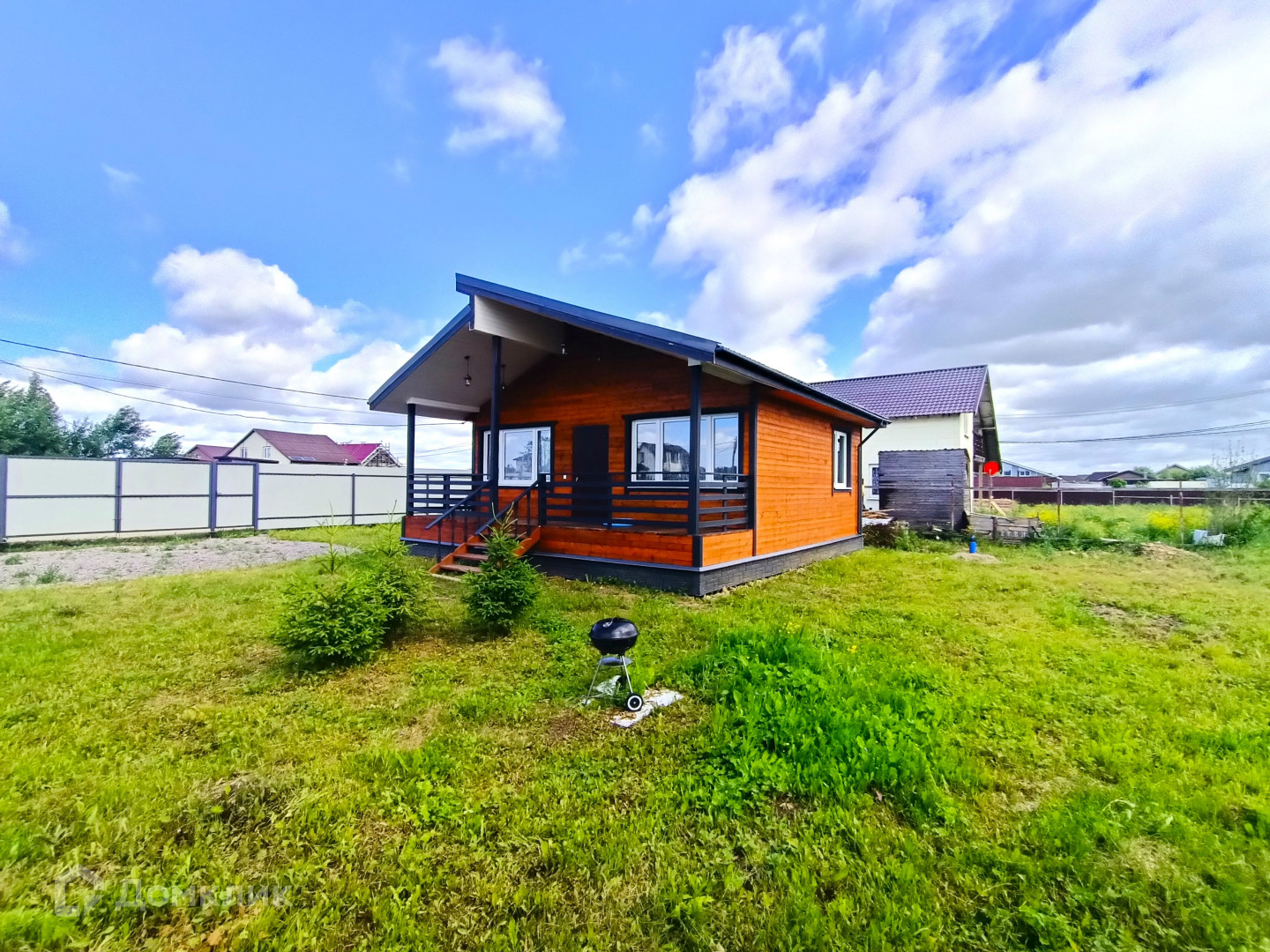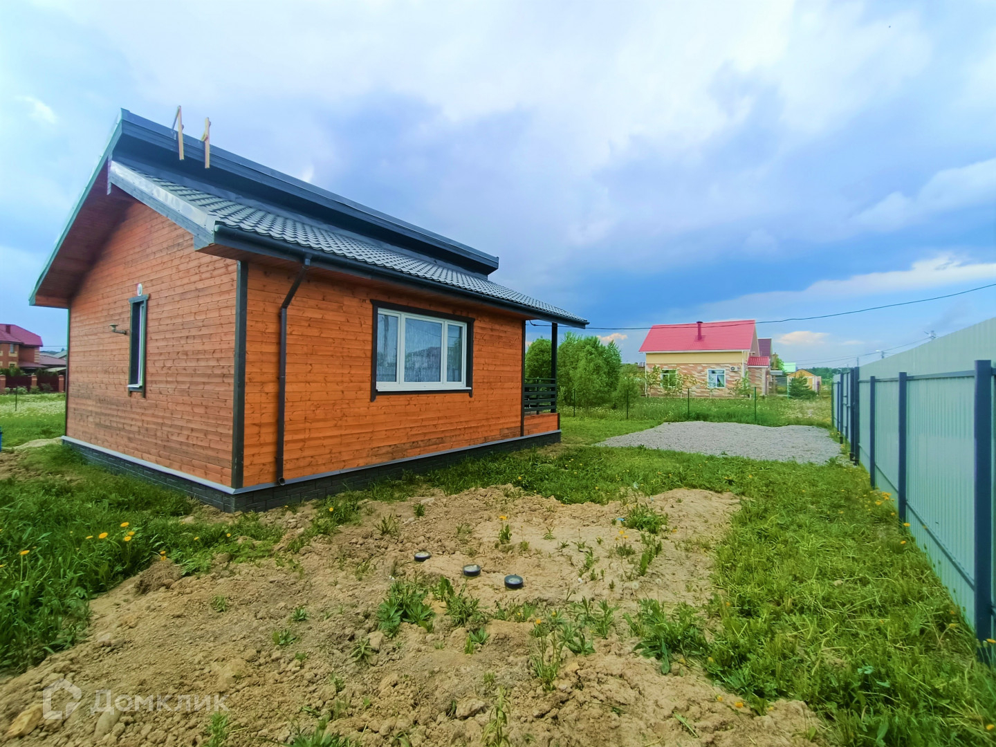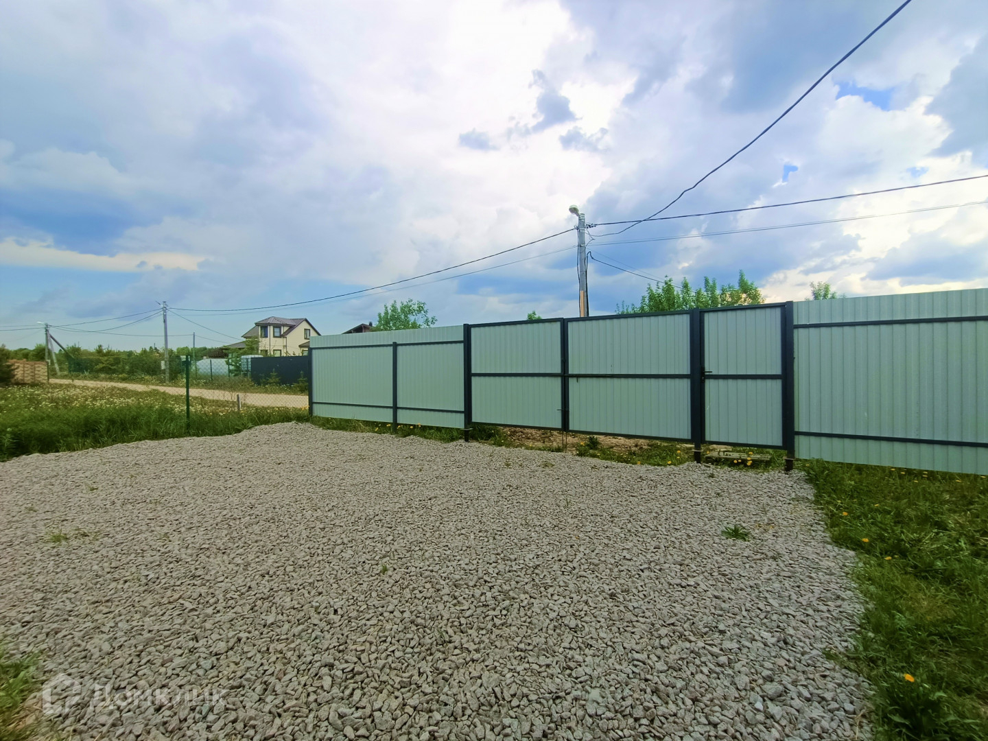 Общая площадь 8 соток, сухой и ровный. Забор с лицевой стороны – профлист, по периметру – рабица, организована зона парковки. Подъездной путь асфальт плюс гравий.