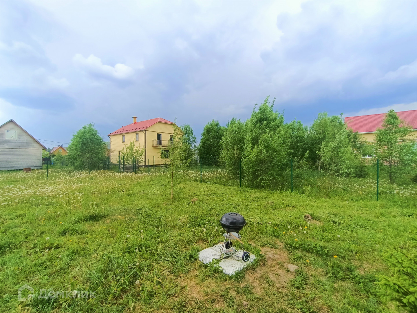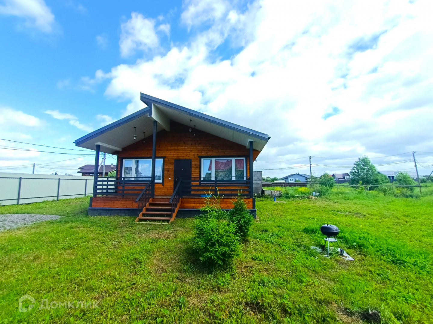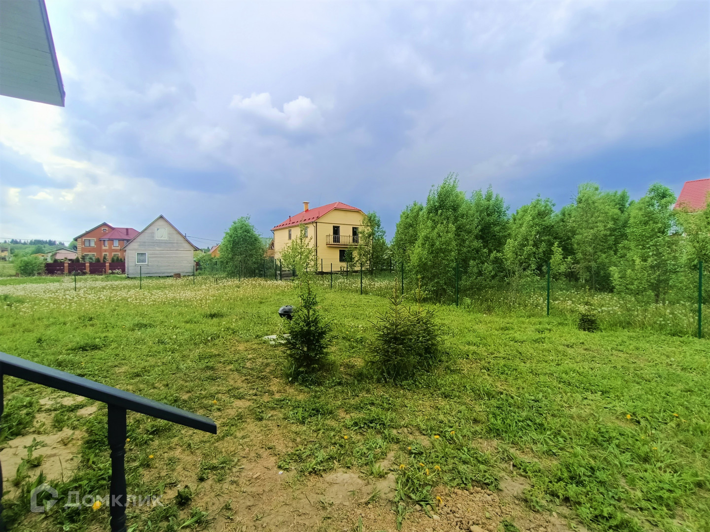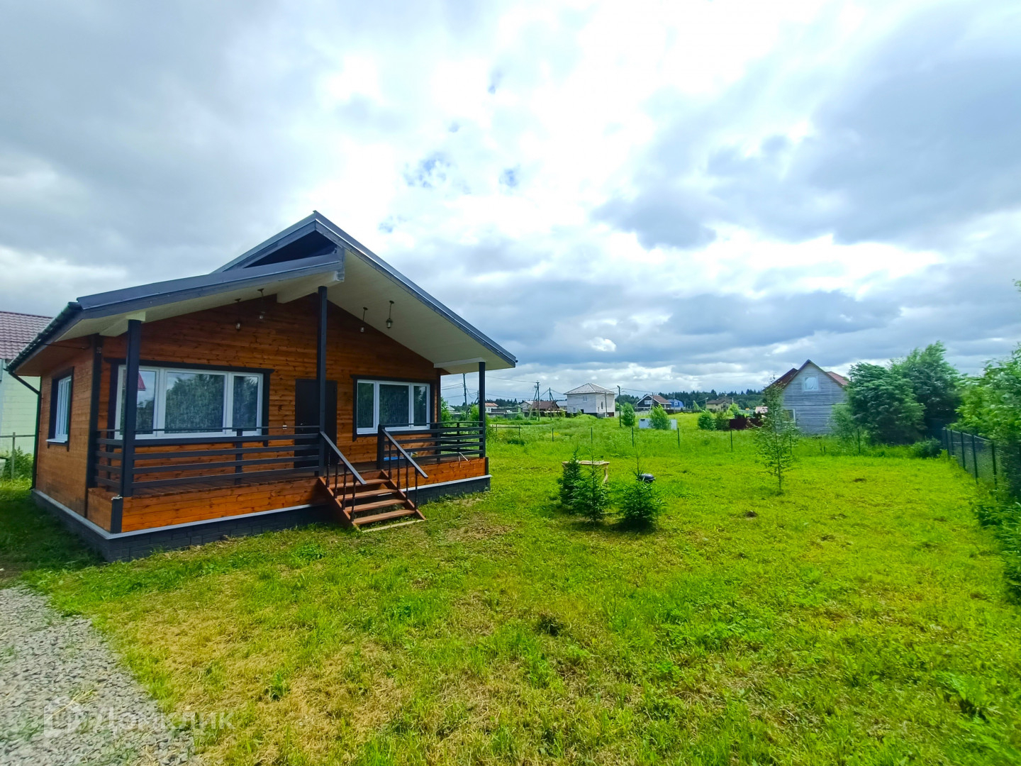 Общая площадь 8 соток, сухой и ровный. Забор с лицевой стороны – профлист, по периметру – рабица, организована зона парковки. Подъездной путь асфальт плюс гравий.