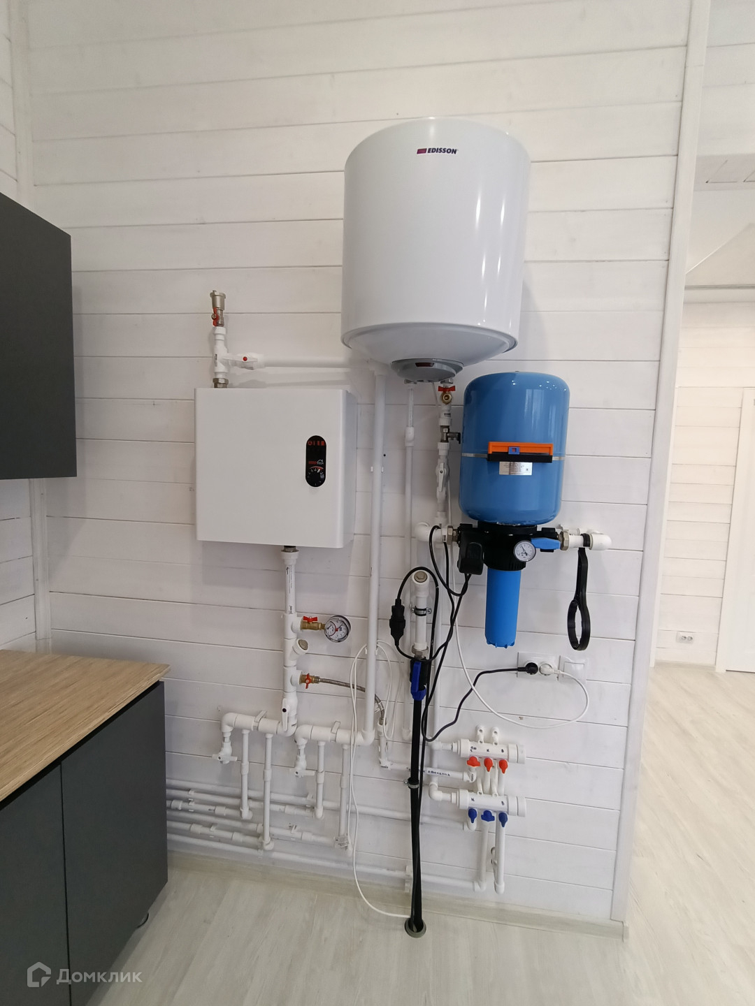 - Отопление: в зоне прихожей и санузел – теплый пол, радиаторы, электрический котел