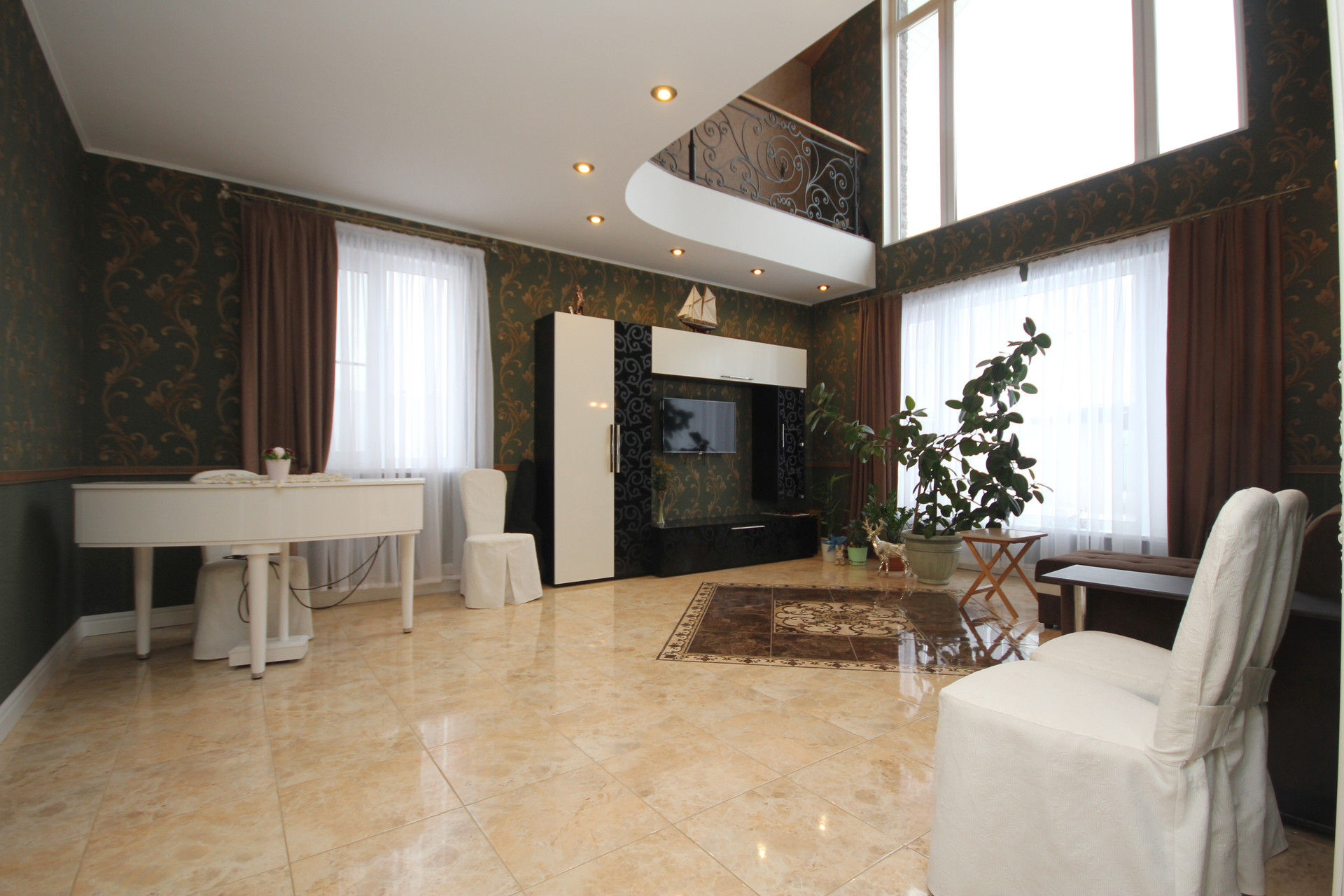 Первый этаж: кухня 21 м2, гостиная со вторым светом 28 м2, рабочий кабинет 16 м2, совмещенный санузел с джакузи 8 м2, бойлерная