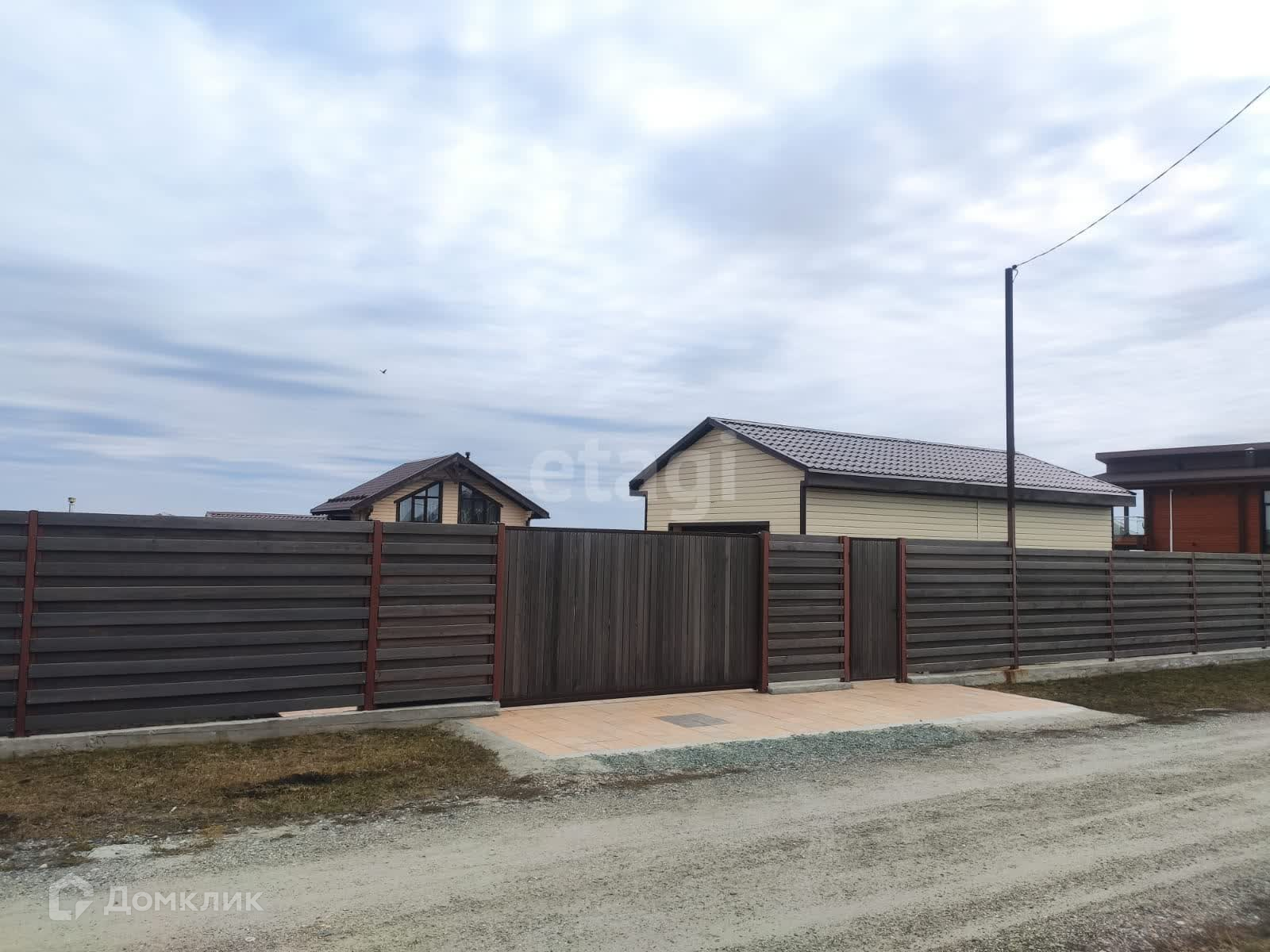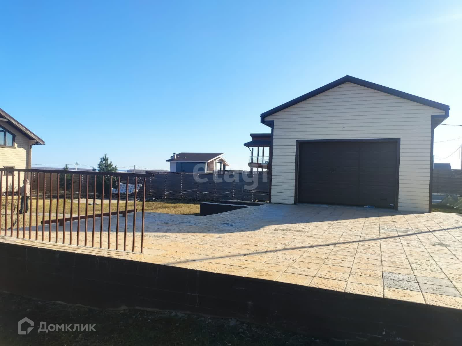 На въезде бетонированная площадка под парковочные места на три автомобиля. Гараж, ворота с подъемным механизмом. Красивый, современный деревянный забор. Откатные ворота и отдельная калитка.