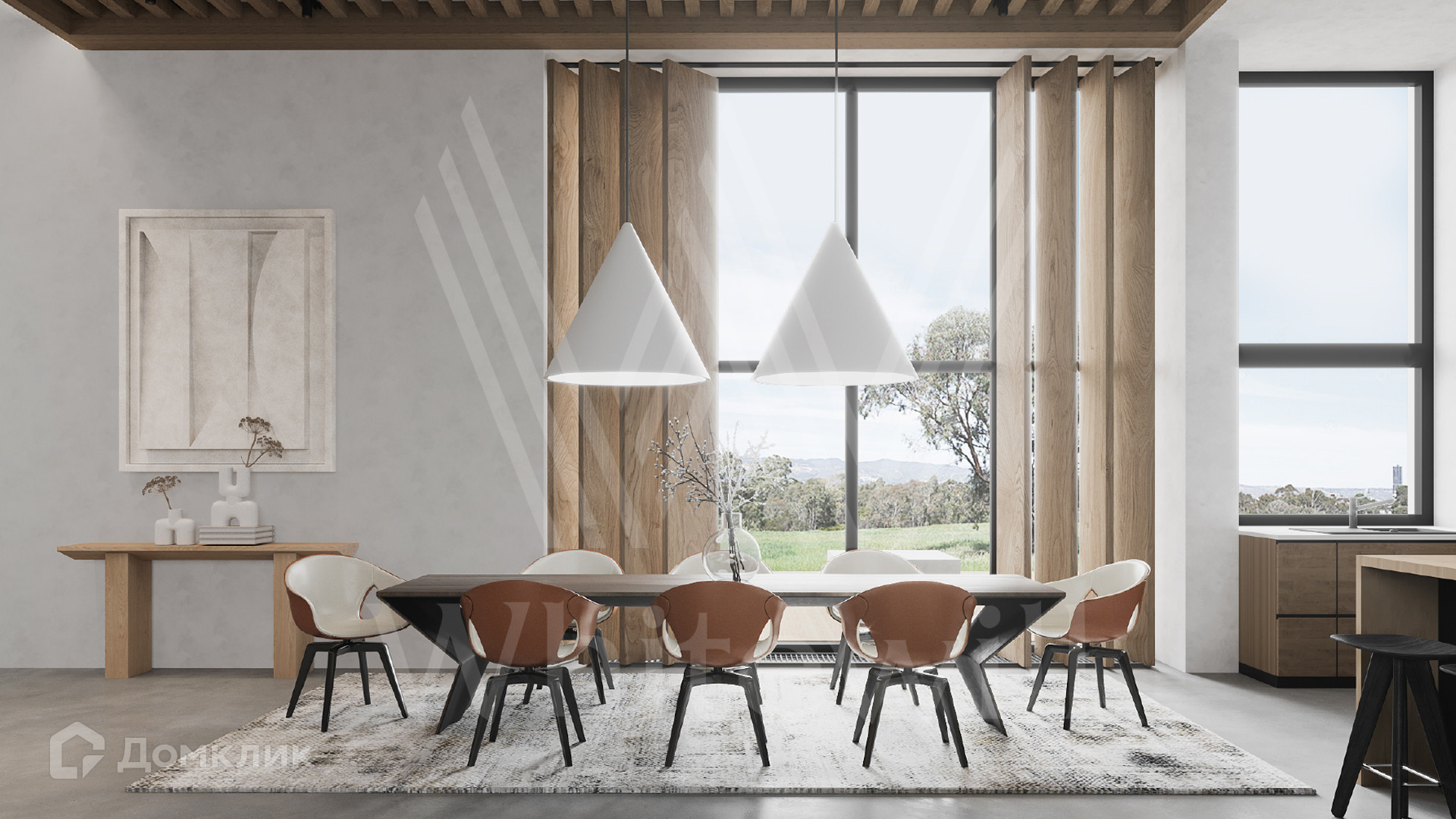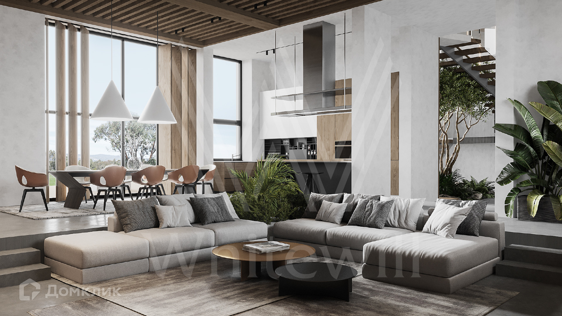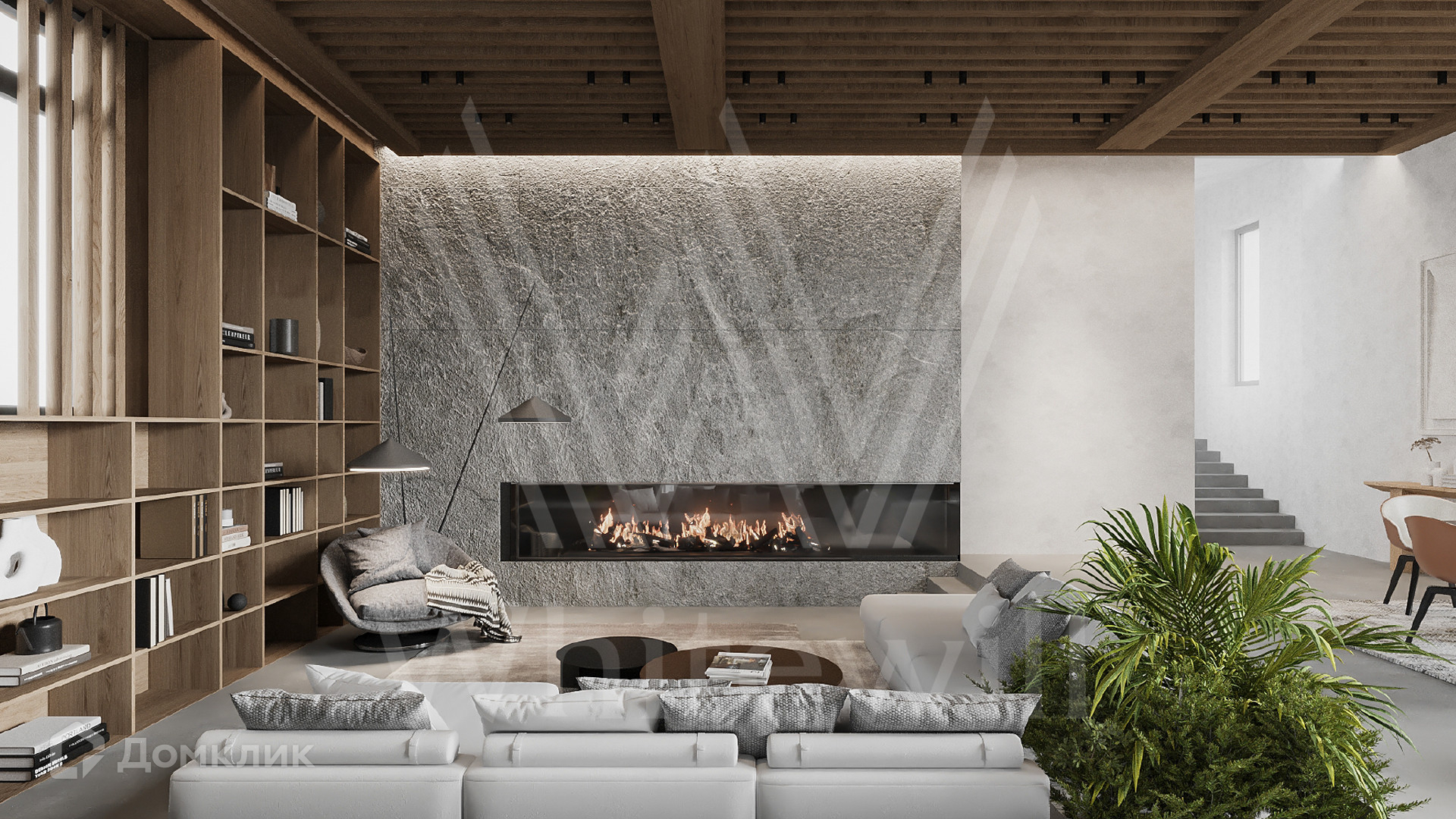 ID 12 302. Подмосковные просторы. Загородная резиденция в современном стиле площадью 650 м² построена на участке 20 соток с ландшафтным дизайном и банным комплексом. Панорамные окна наполняют пространство воздухом и светом. В отделке интерьера использованы природные оттенки, фактура дерева, камня и орнаменты. Планировка коттеджа включает 6 спален, просторную гостиную с камином и вторым светом, объединенную с кухней-столовой, кабинет, библиотеку, домашний кинотеатр и террасу. В контуре дома предусмотрен гараж на 3 машины. На эксплуатируемой крыше обустроена лаунж-зона с барбекю и открытым камином.