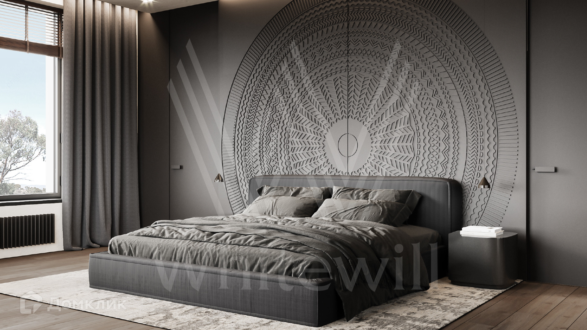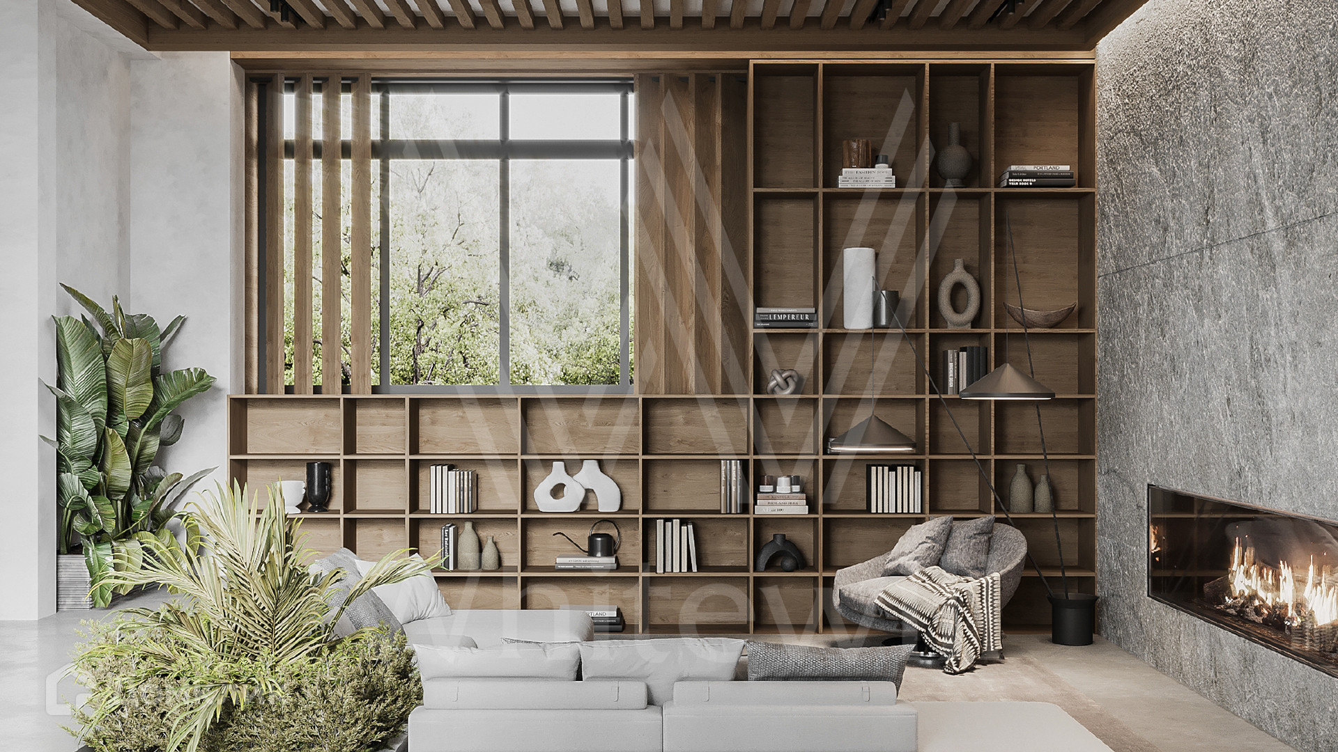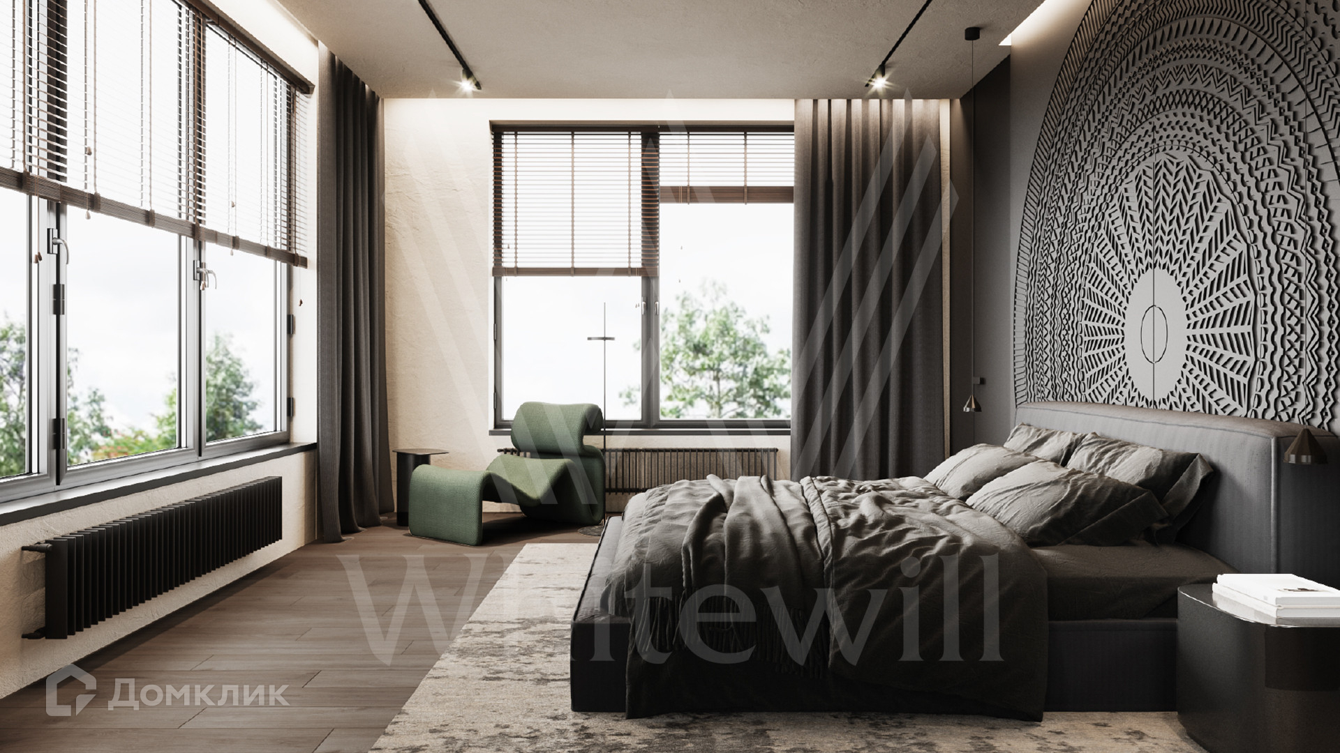 ID 12 302. Подмосковные просторы. Загородная резиденция в современном стиле площадью 650 м² построена на участке 20 соток с ландшафтным дизайном и банным комплексом. Панорамные окна наполняют пространство воздухом и светом. В отделке интерьера использованы природные оттенки, фактура дерева, камня и орнаменты. Планировка коттеджа включает 6 спален, просторную гостиную с камином и вторым светом, объединенную с кухней-столовой, кабинет, библиотеку, домашний кинотеатр и террасу. В контуре дома предусмотрен гараж на 3 машины. На эксплуатируемой крыше обустроена лаунж-зона с барбекю и открытым камином.