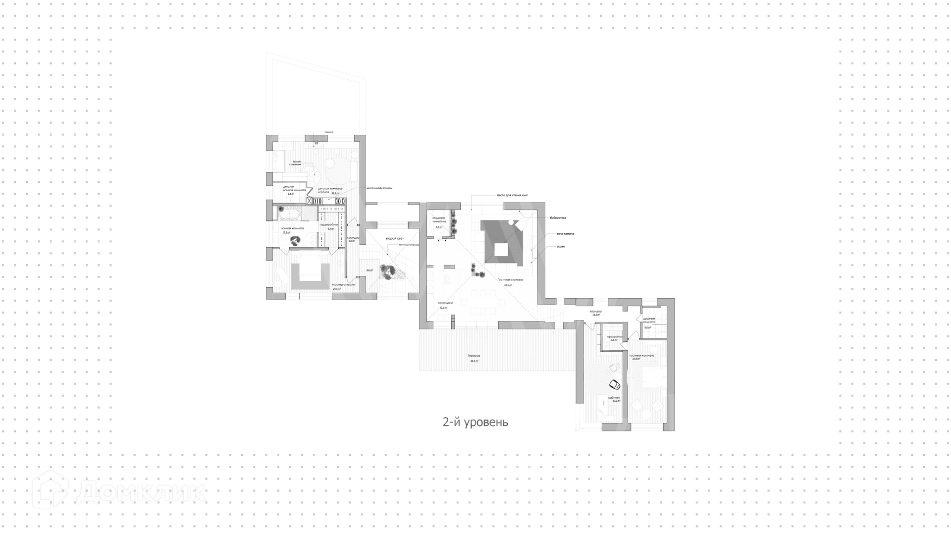 2-й уровень: 2 спальни, мастер-спальня с санузлом и гардеробной, спальня с игровой зоной, санузел.
