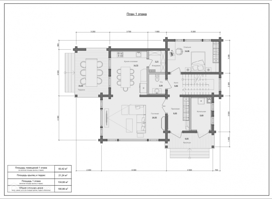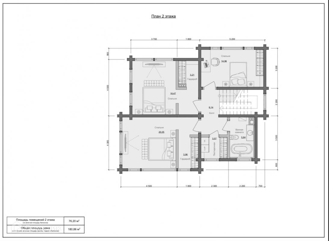 Общая площадь дома составляет 180,86 м2. Первый этаж занимает 104,66 м2, второй – 76,2 м2. Размеры – 10,35х13,95 м. Предусмотрена терраса площадью 14,59 м2. Планировка отличается продуманной эргономикой. В доме есть 4 спальни, большая гостиная и помещение для хозяйственных нужд.