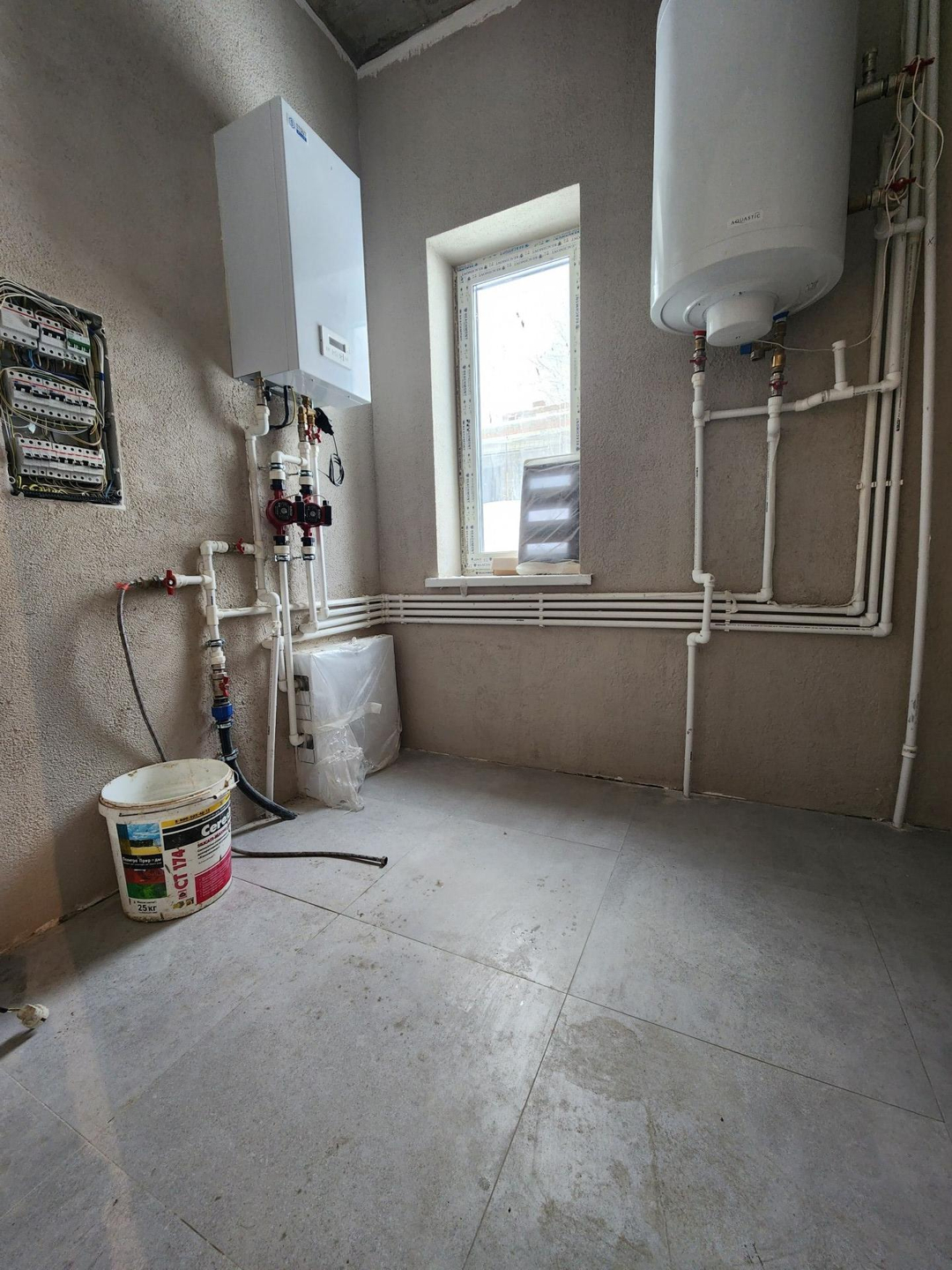 Первый этаж дома отапливается системой "тёплый пол". Котёл, бойлер косвенно нагрева, есть возможность установить удалённую автоматическую регулировку.