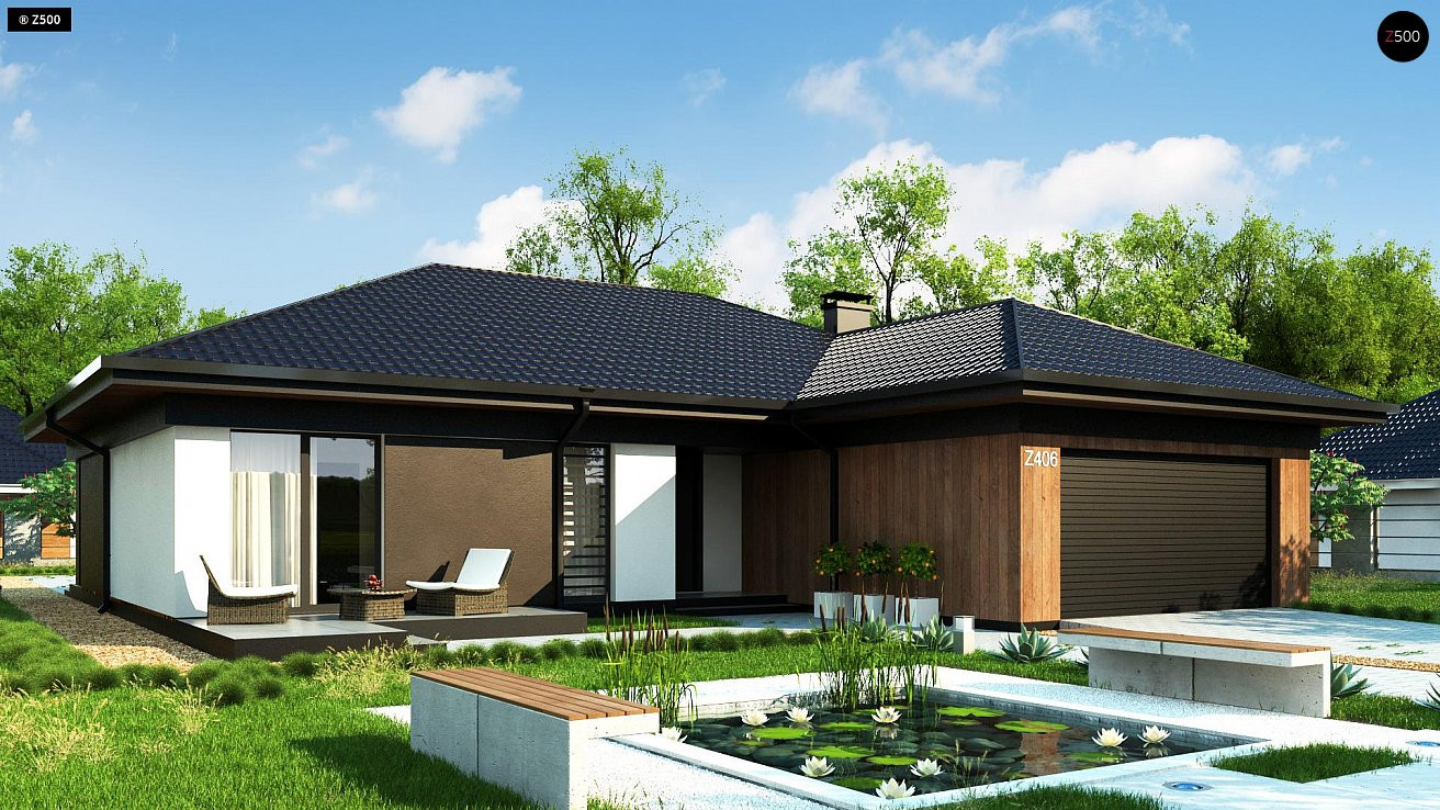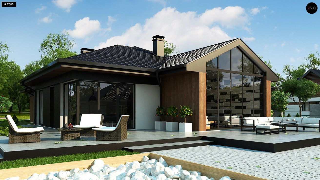 В доме предусмотрено 4 спальни ( 14.1 м2, 12 м2, 12,5 м2, 15 м2), кухня-столовая (19,9 м2), гардеробная и два санузла . Наличие четырех спален отлично подойдет для большой семьи. Панорамное остекление открывает хороший вид на сад и лес. Уютная и продуманная планировка.