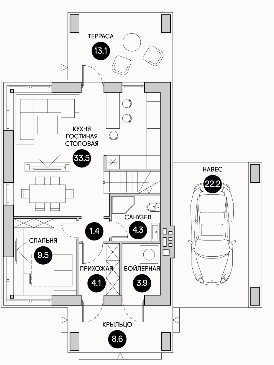 На первом этаже:(57 м2) расположена: спальня (9,5 м2) , кухня-столовая, с/у, гардеробная комната, терраса (13,1 м2).