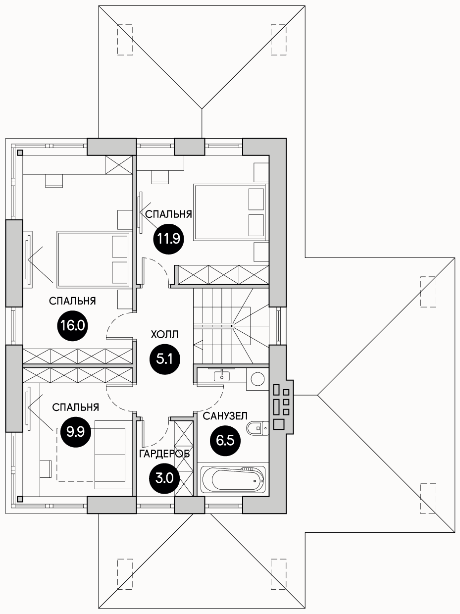На втором этаже: (52 м2): три просторные спальни (11.9 м2, 16 м2, 9,9 м2), с/у, гардеробная комната и просторный холл.