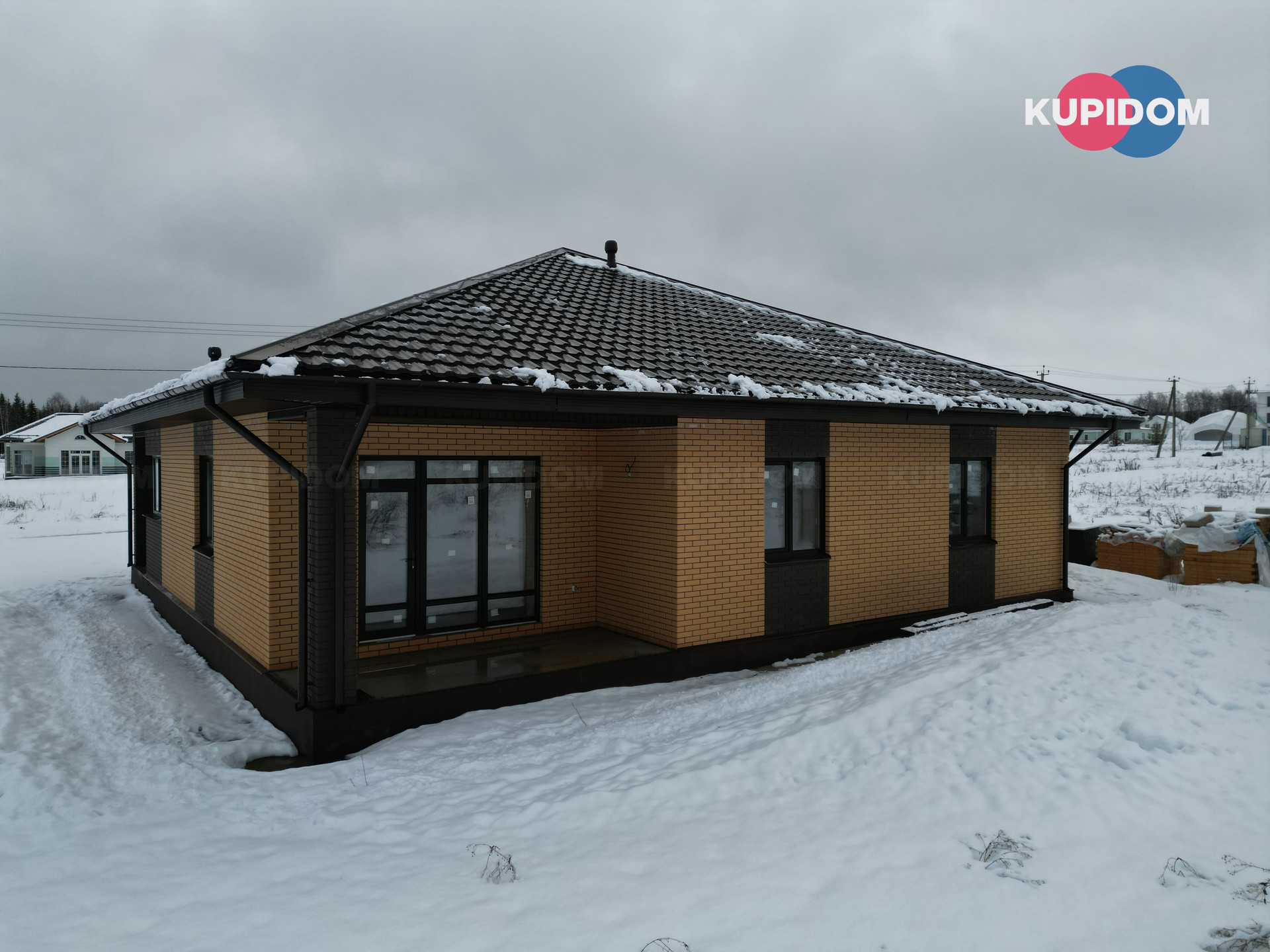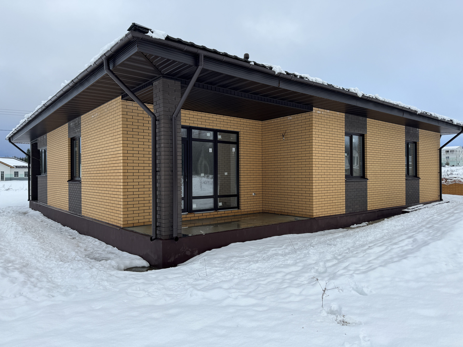 Монолитная железобетонная плита с рёбрами жёсткости, включая гараж и веранды; Фундамент утеплён; Стены - Газоблок 375мм + вентзазор + облицовочный кирпич; Кровля утеплена 200мм; Окна - Rеhаu; Парадная дверь с терморазрывом - непромерзающая.
