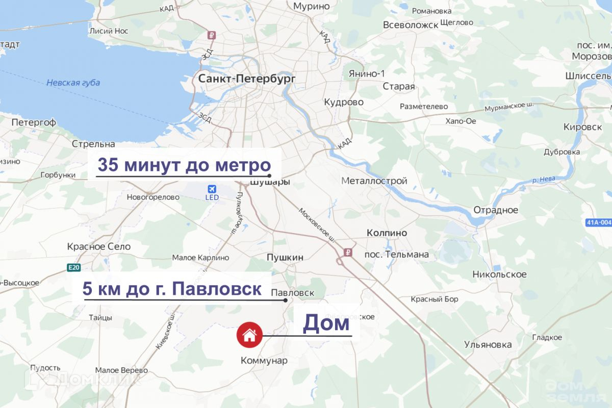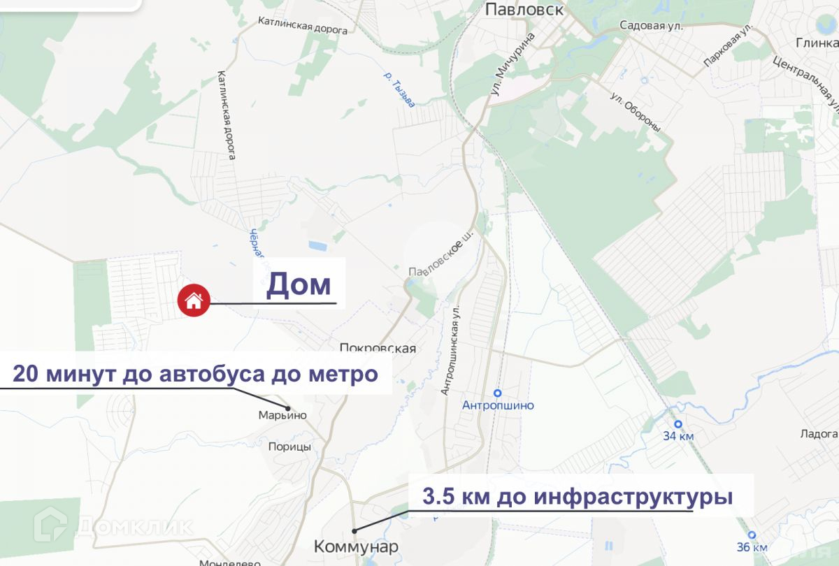 Поселок расположен в разумной удаленности от шумных дорог, в экологически чистом новом элитном поселке Покровское вблизи г. Павловска (5 км), где расположены дворцы и парки, музеи. Вся инфраструктура находится в Коммунаре (3,5 км): магазины, школа, детский сад, почта, больница, поликлиника, МФЦ, ФОК, бассейн.