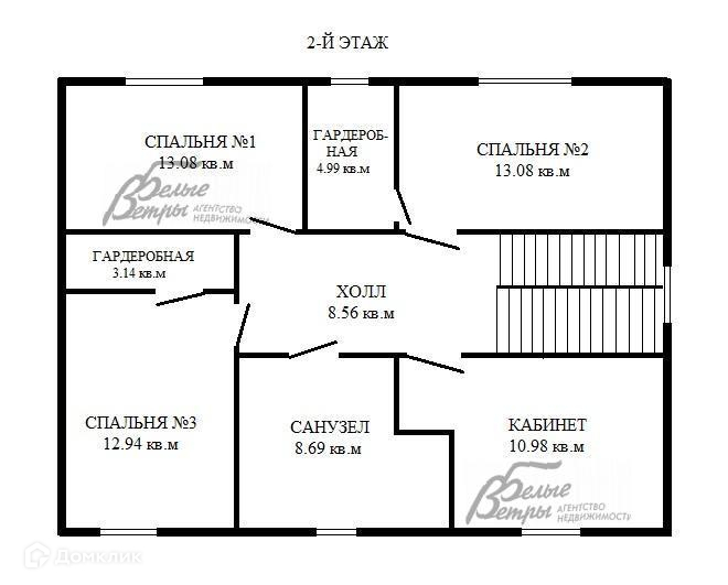 2-ой этаж: холл 8.5 кв.м, спальня №1: 13 кв.м, спальня №2: 13 кв.м с гардеробной 5 кв.м, санузел 8.7 кв.м, спальня №3: 13 кв.м с гардеробной 3 кв.м, кабинет 11 кв.м.