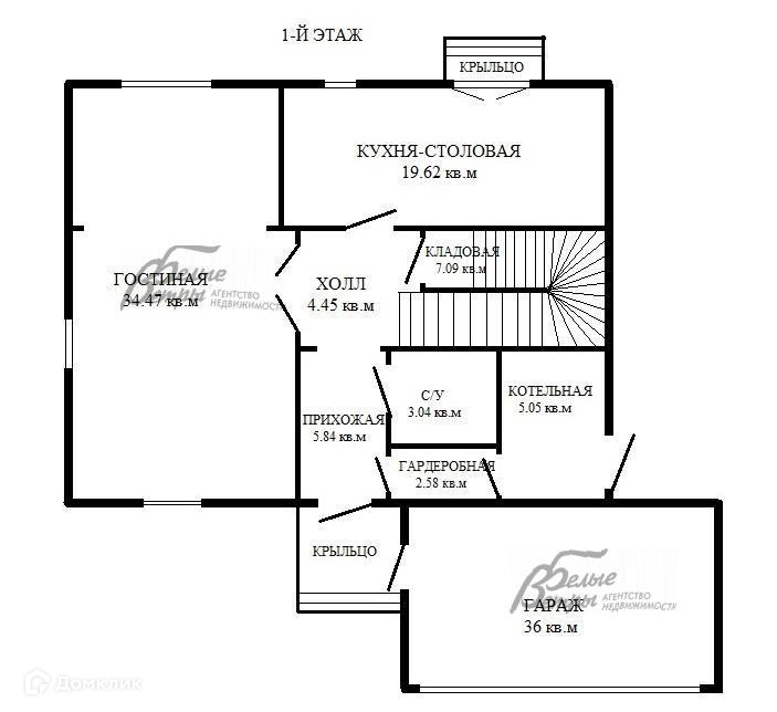 1-ый этаж: прихожая 6 кв м, санузел 3 кв.м, гардеробная 2.5 кв.м, холл 4.5 кв.м, кухня-столовая с выходом на участок 19.5 кв м, гостиная 34.5 кв.м, кладовая 7 кв.м, котельная 5 кв.м с отдельным входом, гараж 36 кв.м.
