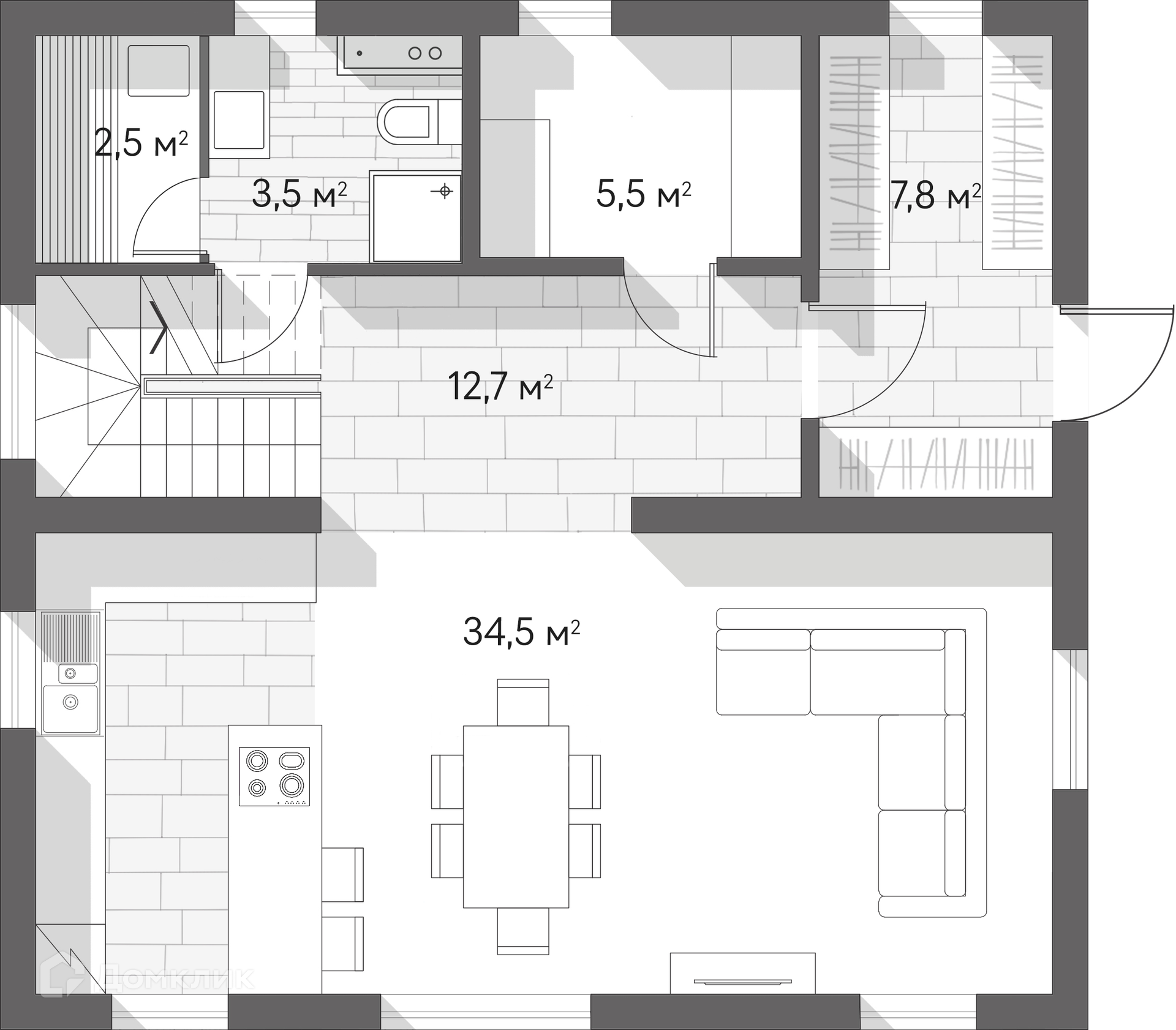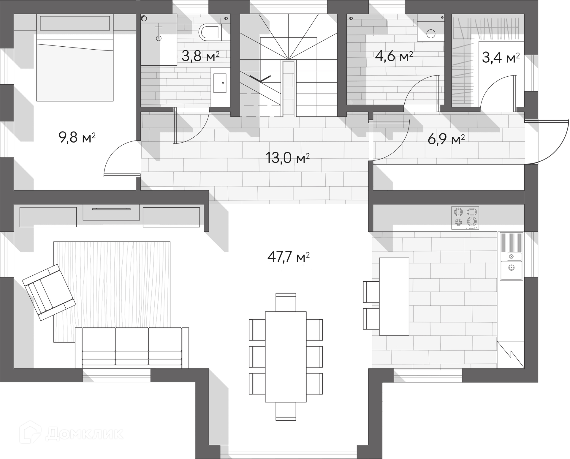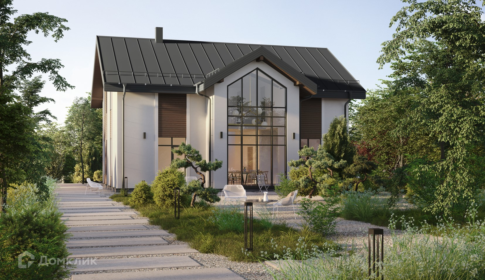 Стены выполнены из газобетона — надёжного искусственного камня. В комплектацию входят энергоэффективные окна, внешняя отделка с элементами планкена, уютные балконы и благоустроенный участок.